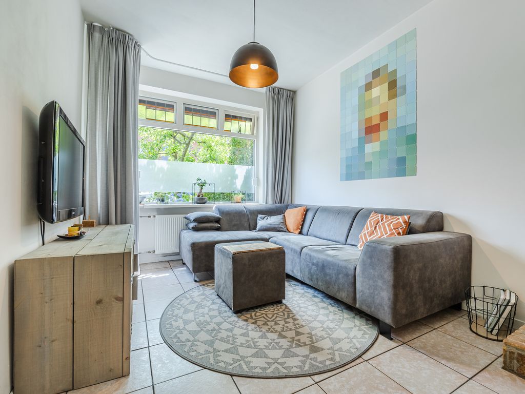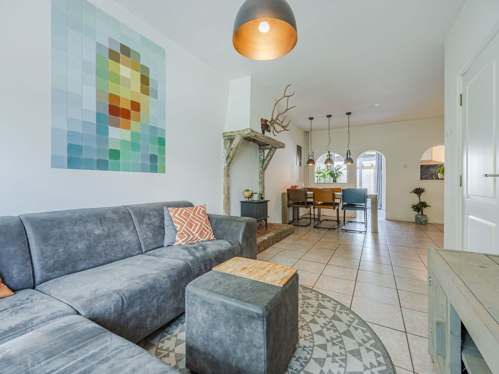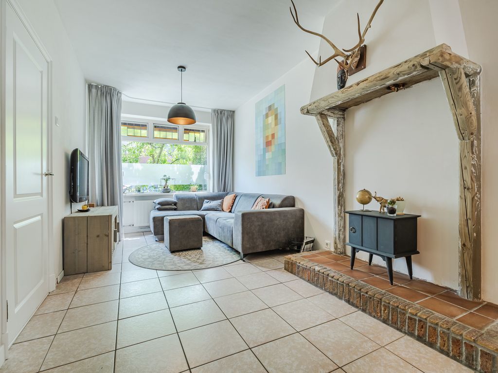 De L-vormige woonkamer (ca. 27 m²) heeft een erker aan de voorzijde, een schouw met rookkanaal en een praktische trapkast.