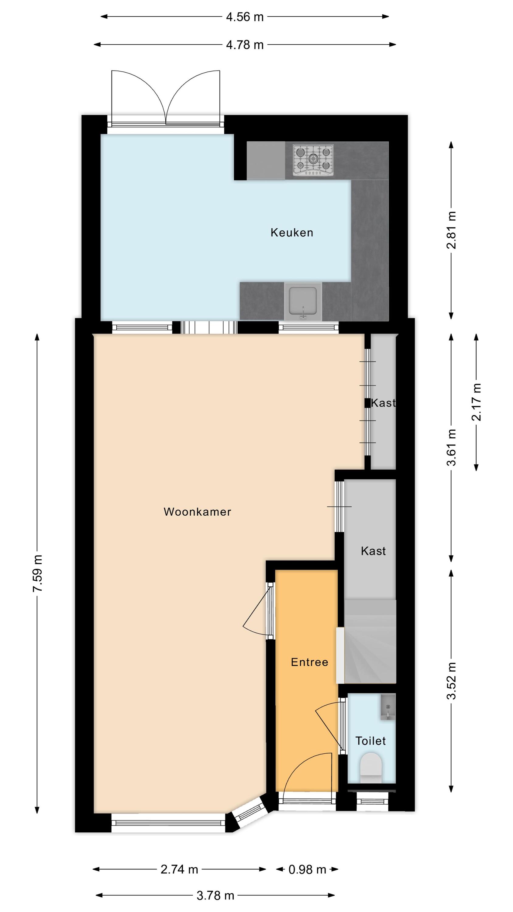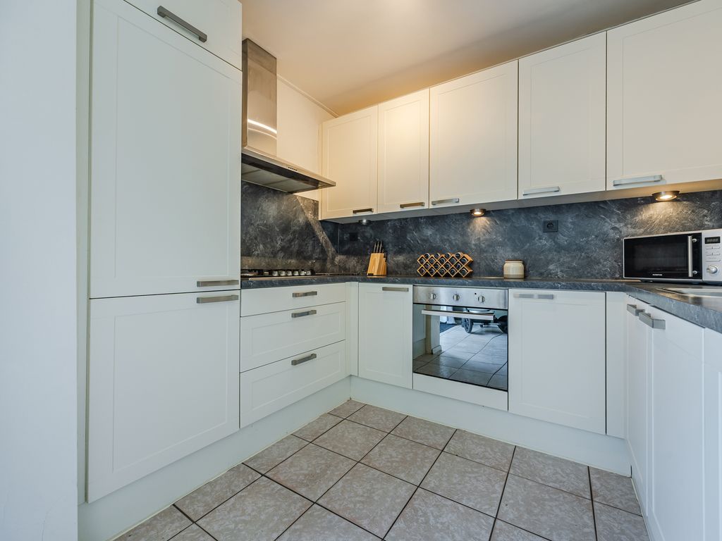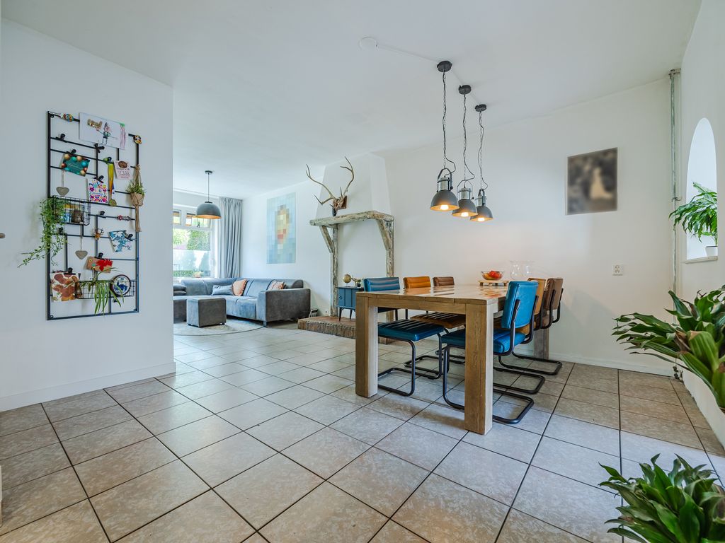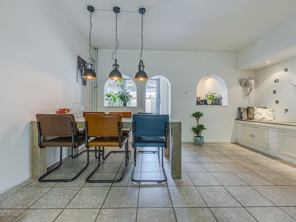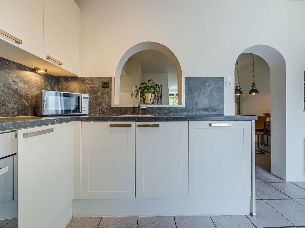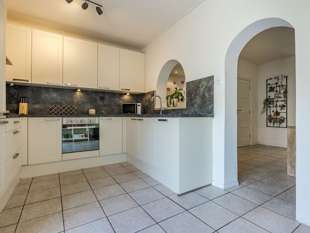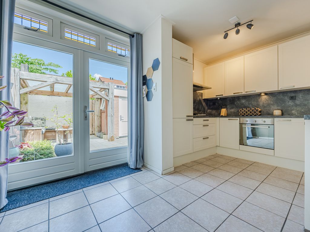 Aan de achterzijde bevindt zich de semi-open keuken (ca. 2.81 x 4.56 m), geplaatst in U-opstelling en voorzien van 5-pits gaskookplaat, afzuigkap, oven, koelkast, vriezer en vaatwasser. Via de openslaande deuren is de tuin toegankelijk.