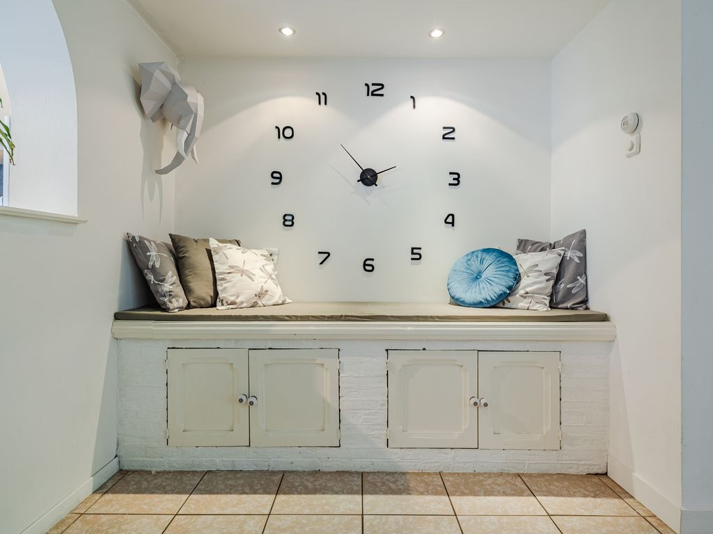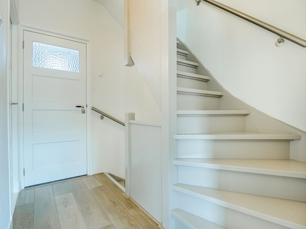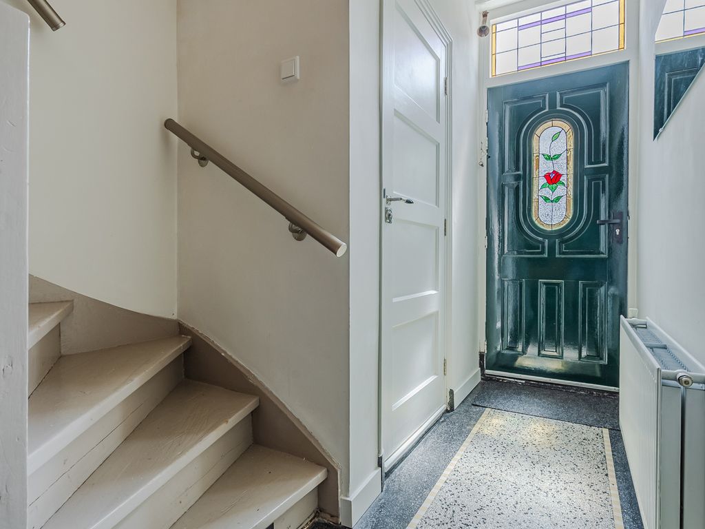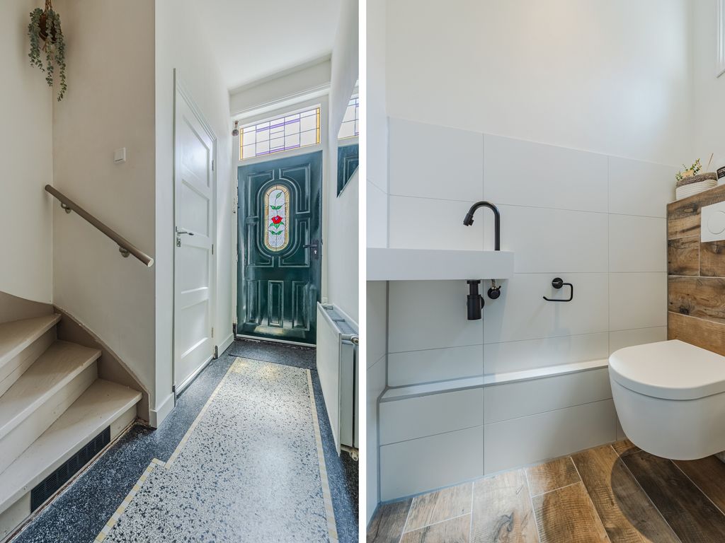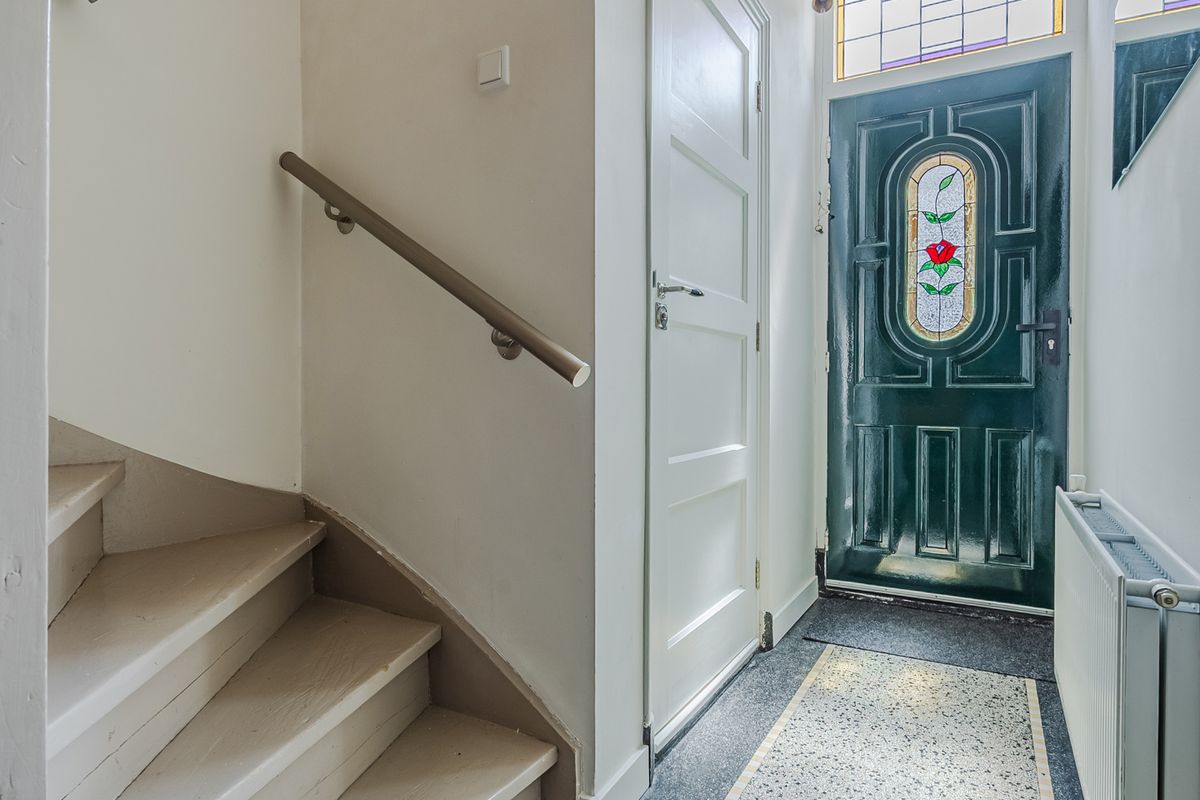 In de hal vallen direct de jaren ’30 kenmerken op: granitovloer, glas-in-lood, paneeldeuren en de originele deurbel. Vanuit de hal zijn de trapopgang, de toiletruimte (wandcloset met fonteintje) en de woonkamer bereikbaar.