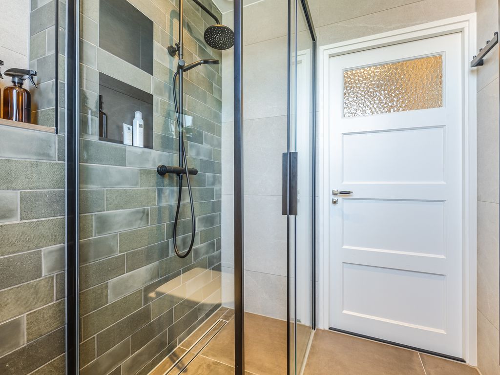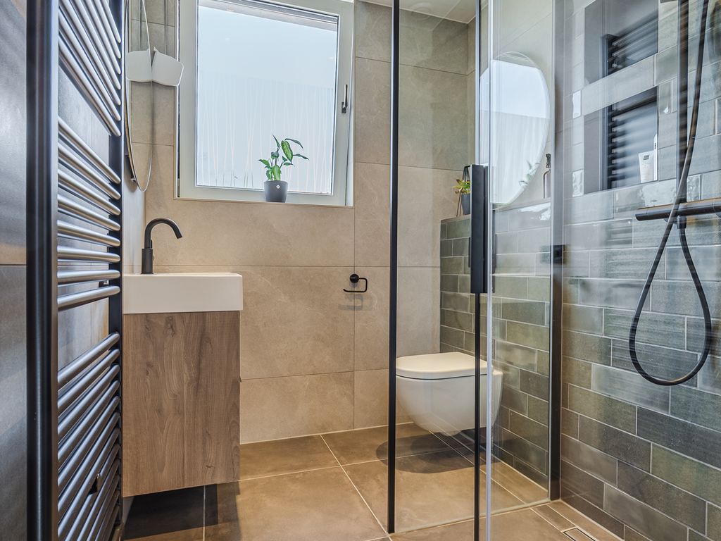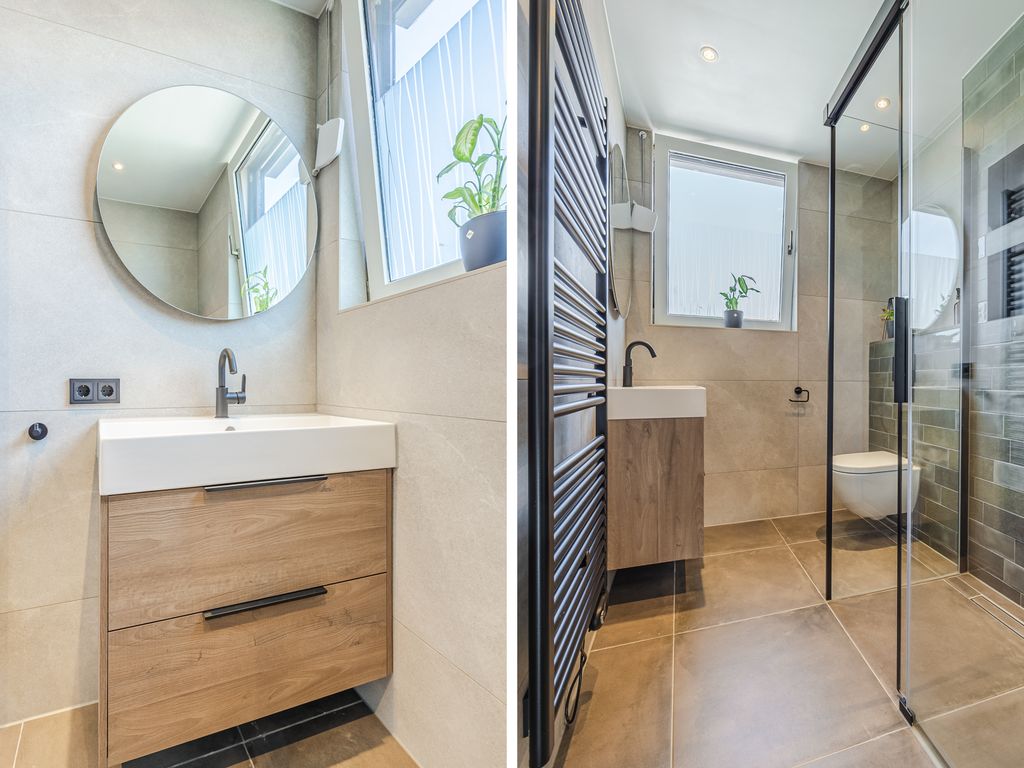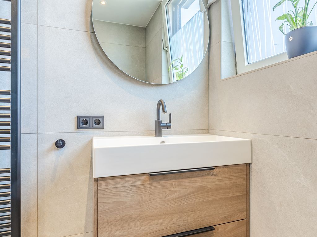 De badkamer (ca. 1.82 x 2.17 m) is in 2024 vernieuwd en voorzien van een inloopdouche, wandcloset, wastafelmeubel, verlichte spiegel, designradiator en een verlaagd plafond met spots. Er is een raam en mechanische ventilatie aanwezig.