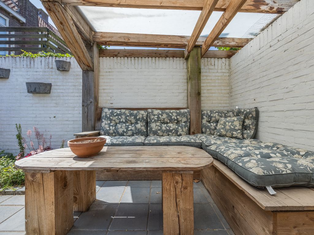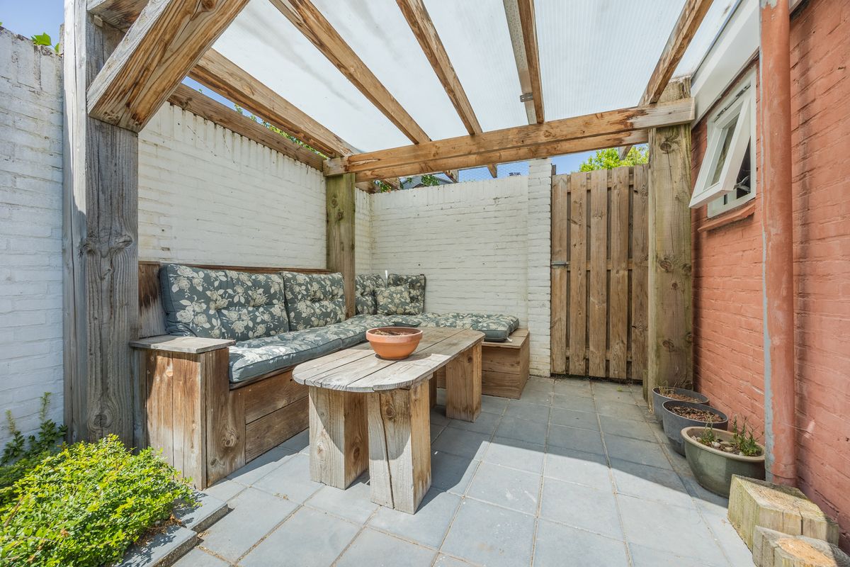 De zonnige stadstuin beschikt over een overkapping, een vernieuwde berging en een achterom.