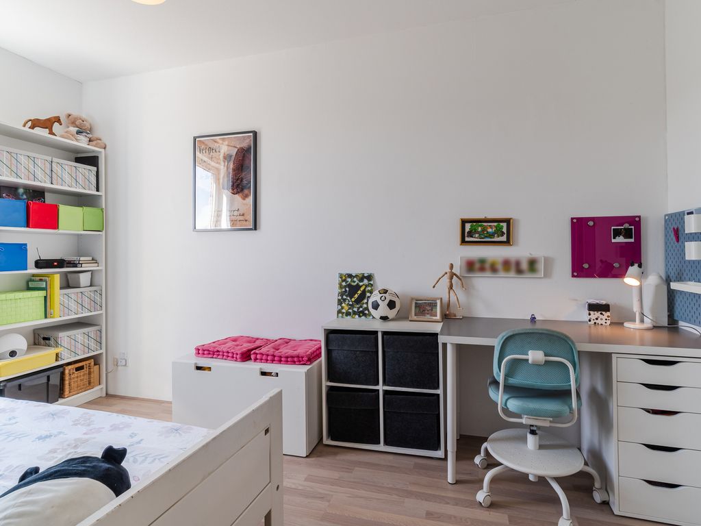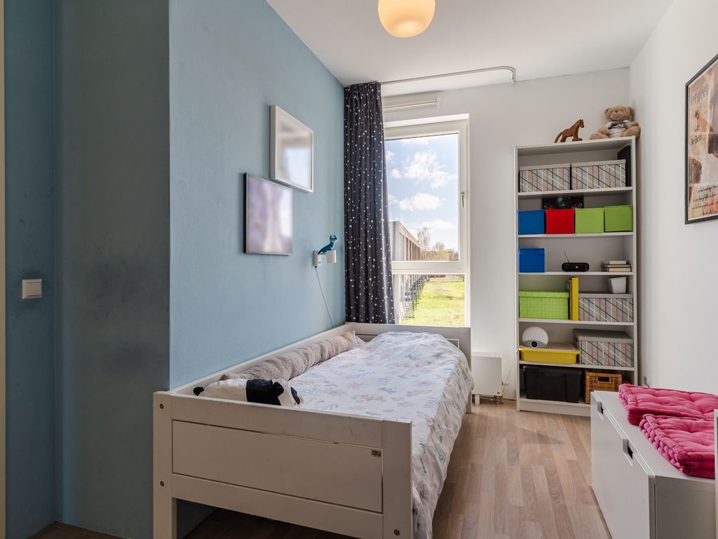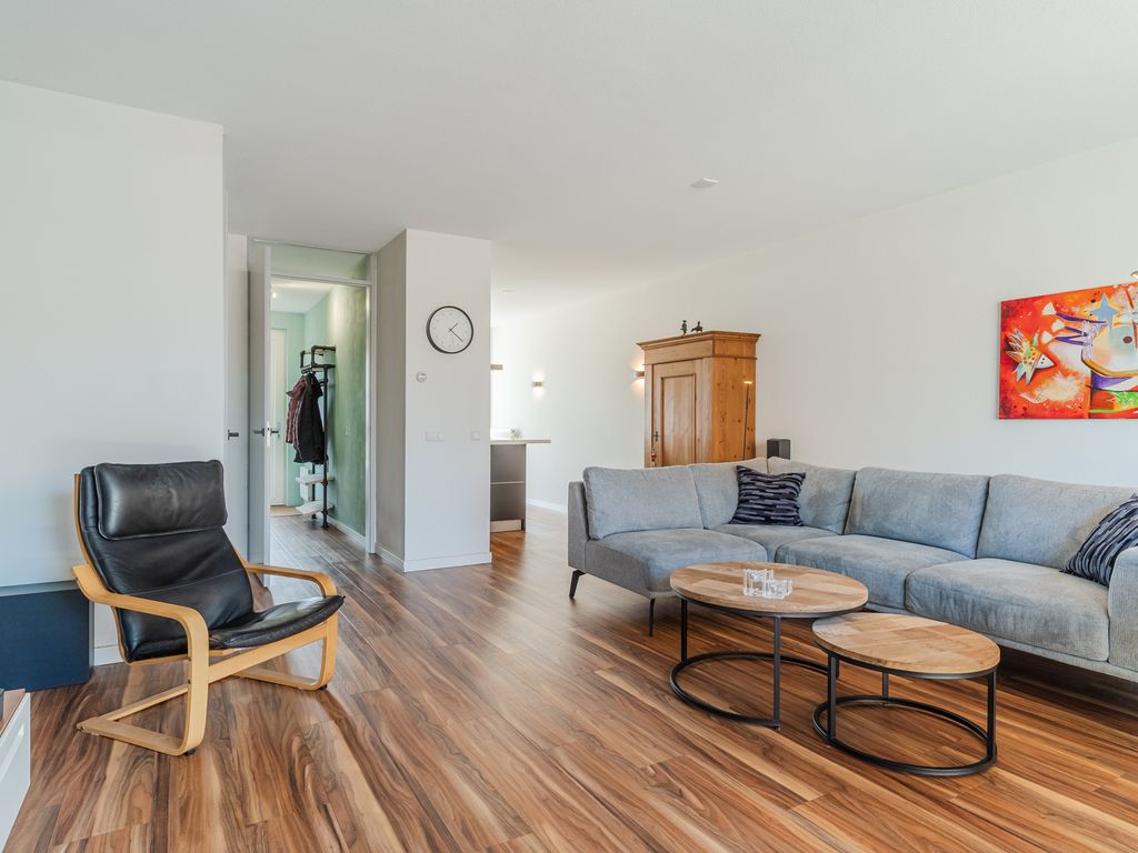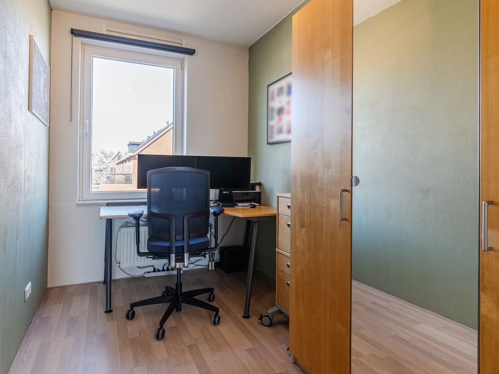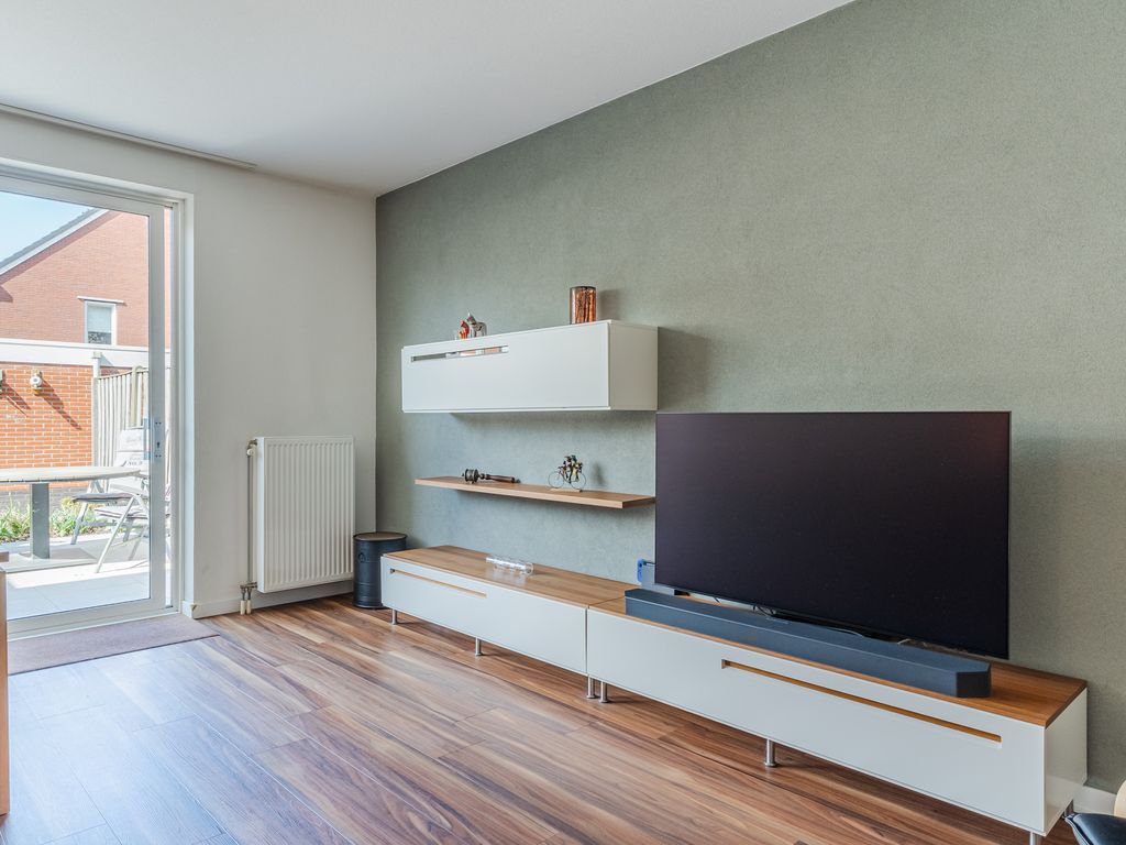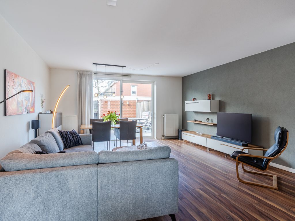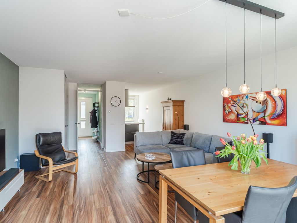 De woonkamer (ca. 5,11 x 6,53 m) is licht en beschikt over een praktische vaste kast. Via een ruime schuifpui heeft u toegang tot de zonnige achtertuin.