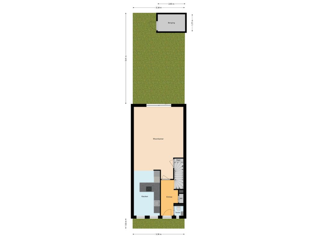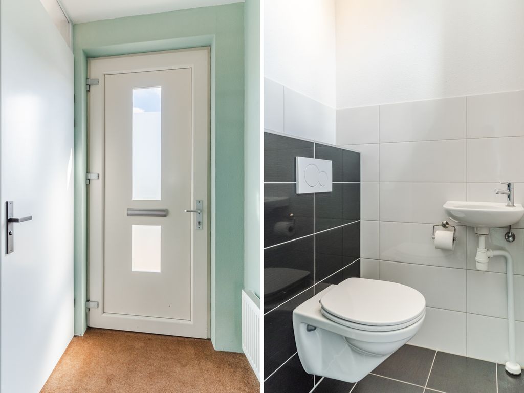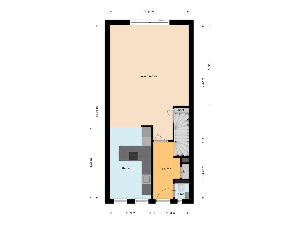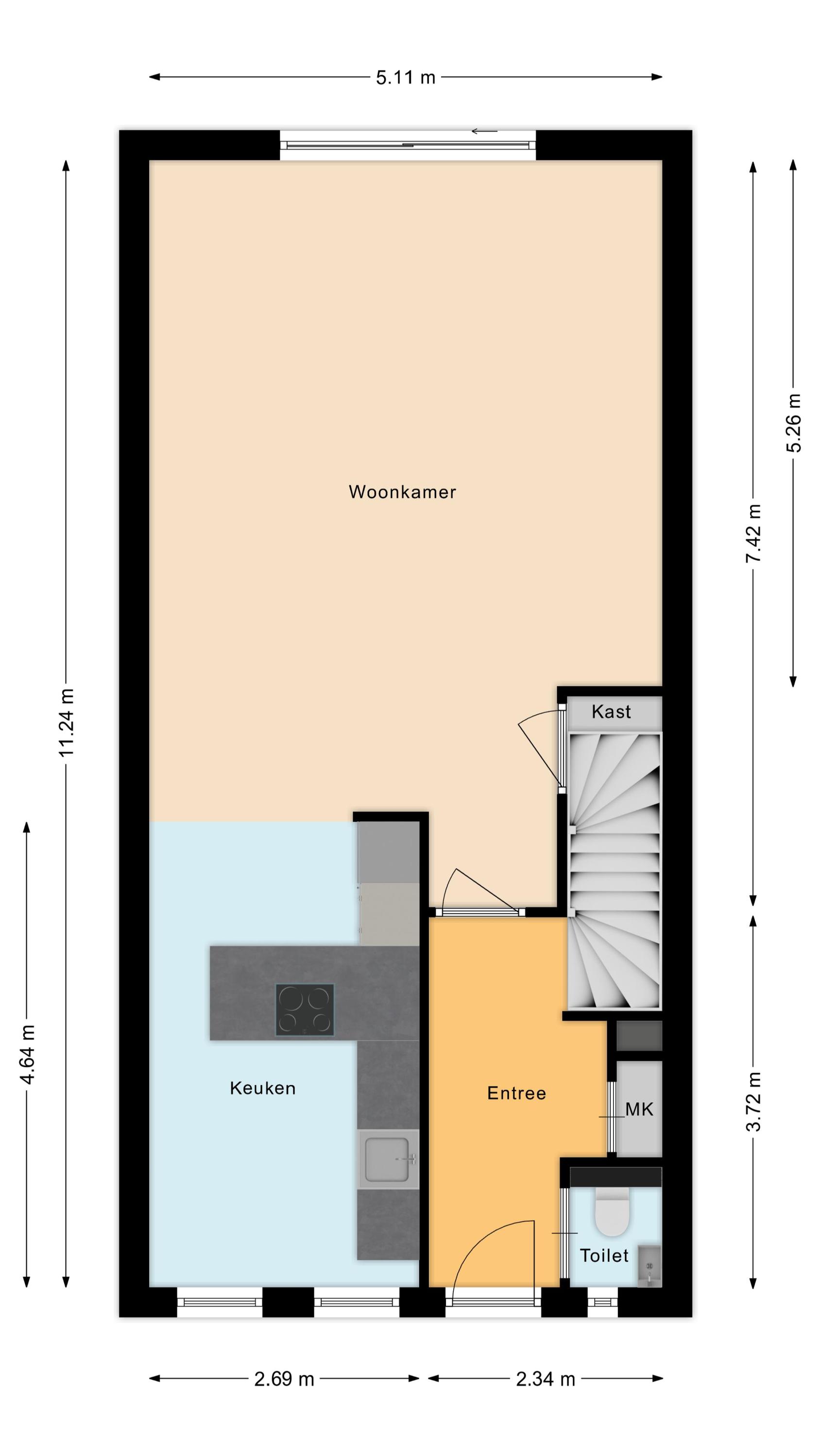 Begane Grond: Bij binnenkomst betreedt u de hal, die toegang biedt tot de toiletruimte, de meterkast, de trapopgang en de ruime woonkamer.