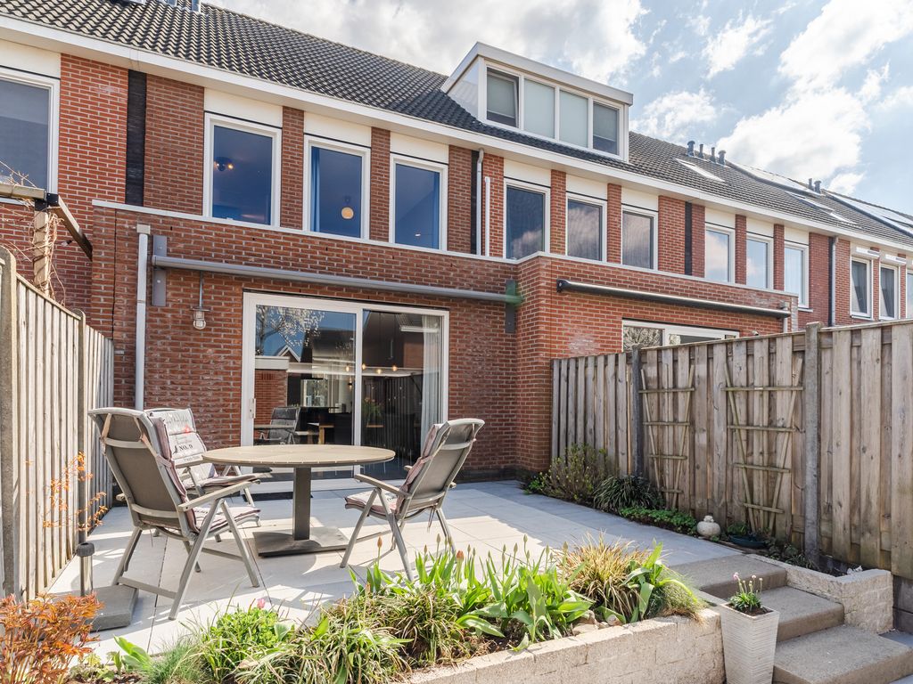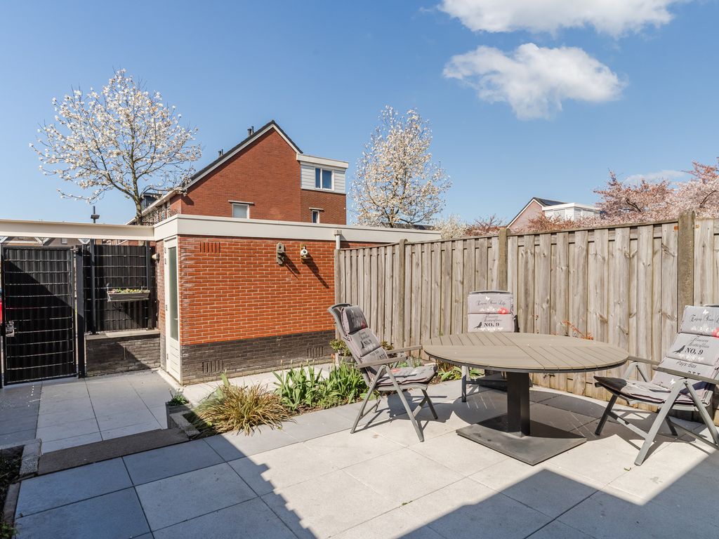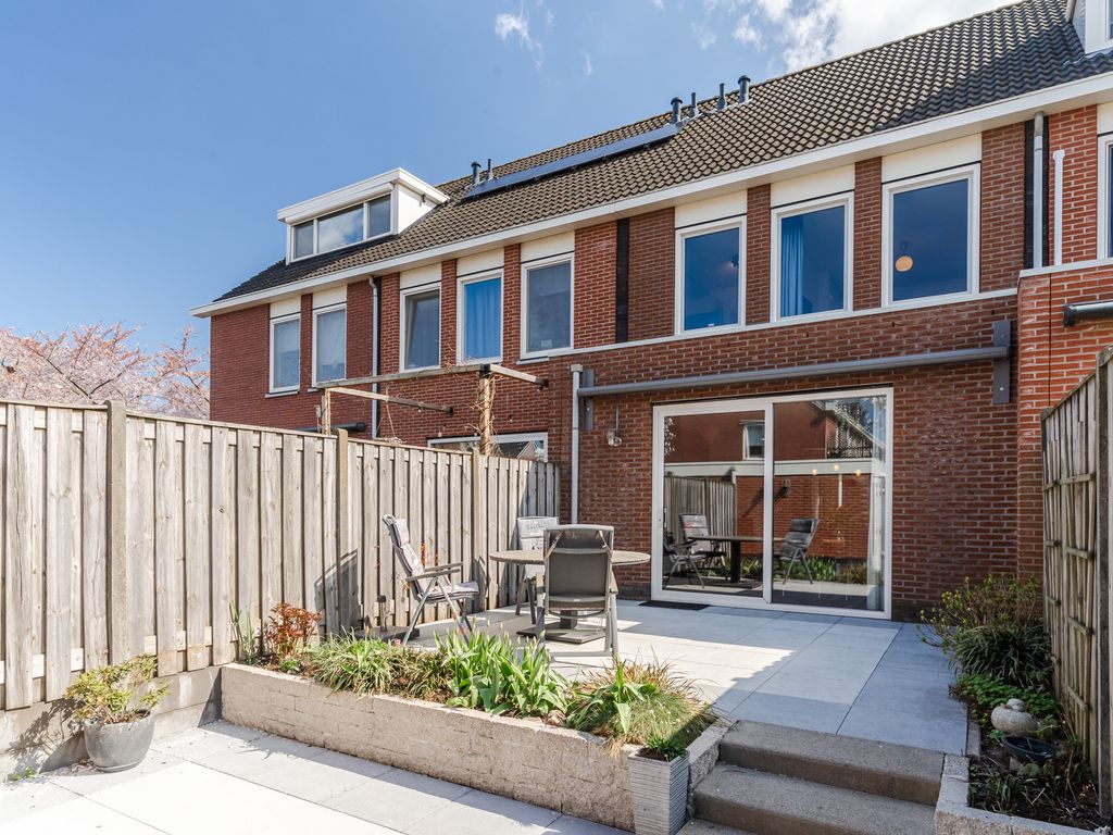 De achtertuin (ca. 5,33 x 9,45 m) is speels ingedeeld door een niveauverschil en beschikt over twee terrassen, perfect voor zonnige dagen. De tuin is hoofzakelijk naar het westen gelegen, waardoor u het hele jaar door kunt genieten van de zon. De achtertuin is bereikbaar via een achterom en heeft een praktische berging met elektra.