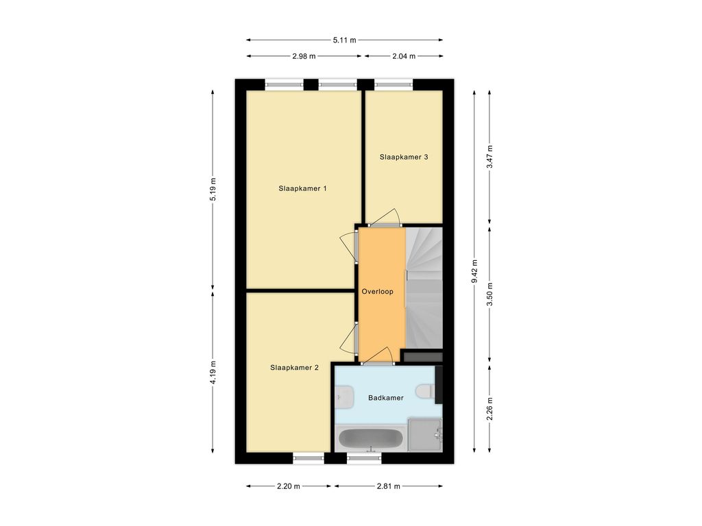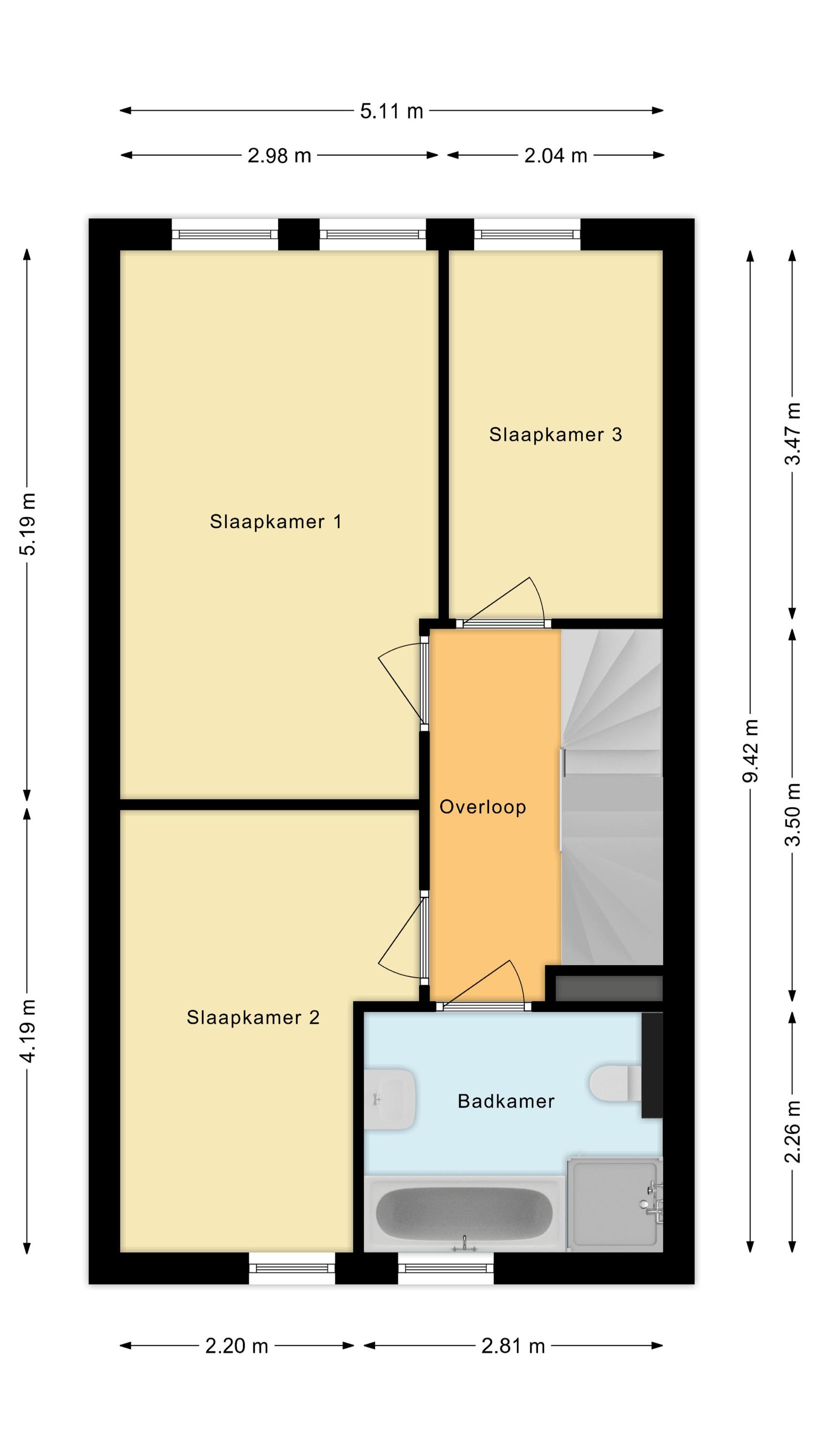 Eerste Verdieping: Op de eerste verdieping bevindt zich de overloop met een vaste trap naar de tweede verdieping. Hier treft u drie ruime slaapkamers en een moderne badkamer (ca. 2,28 x 2,82 m).