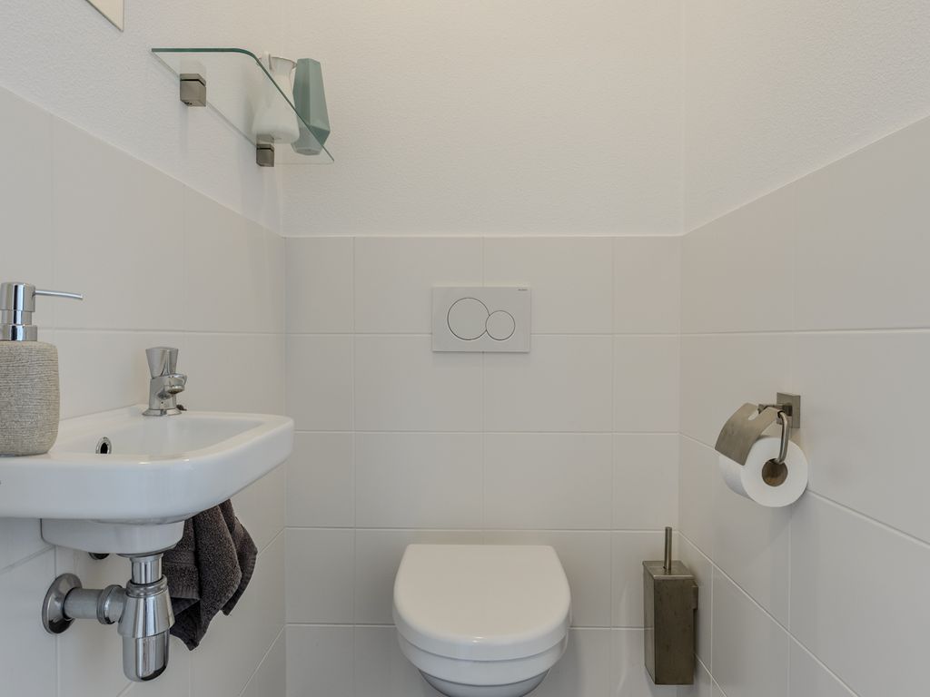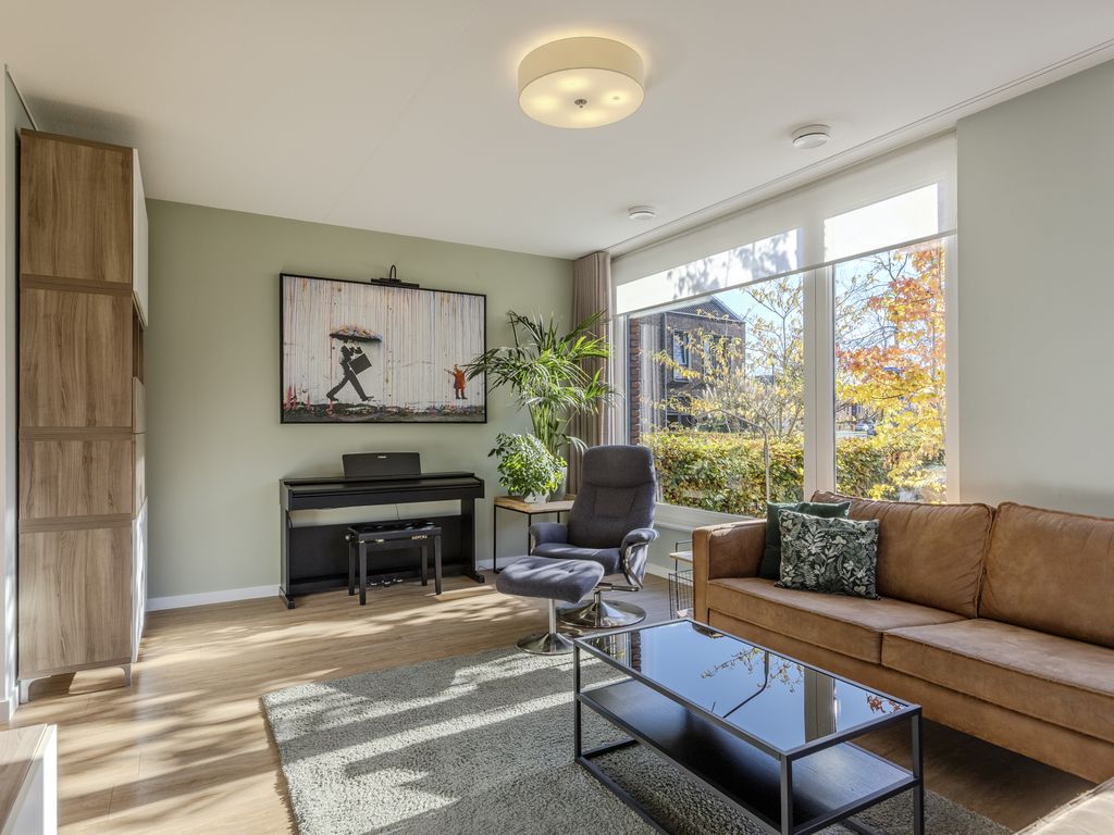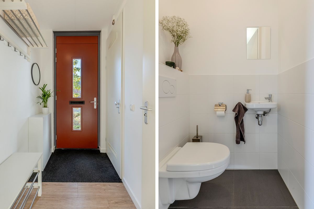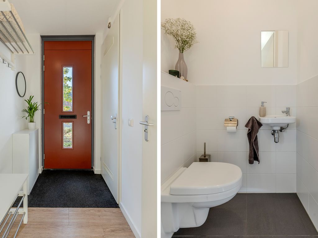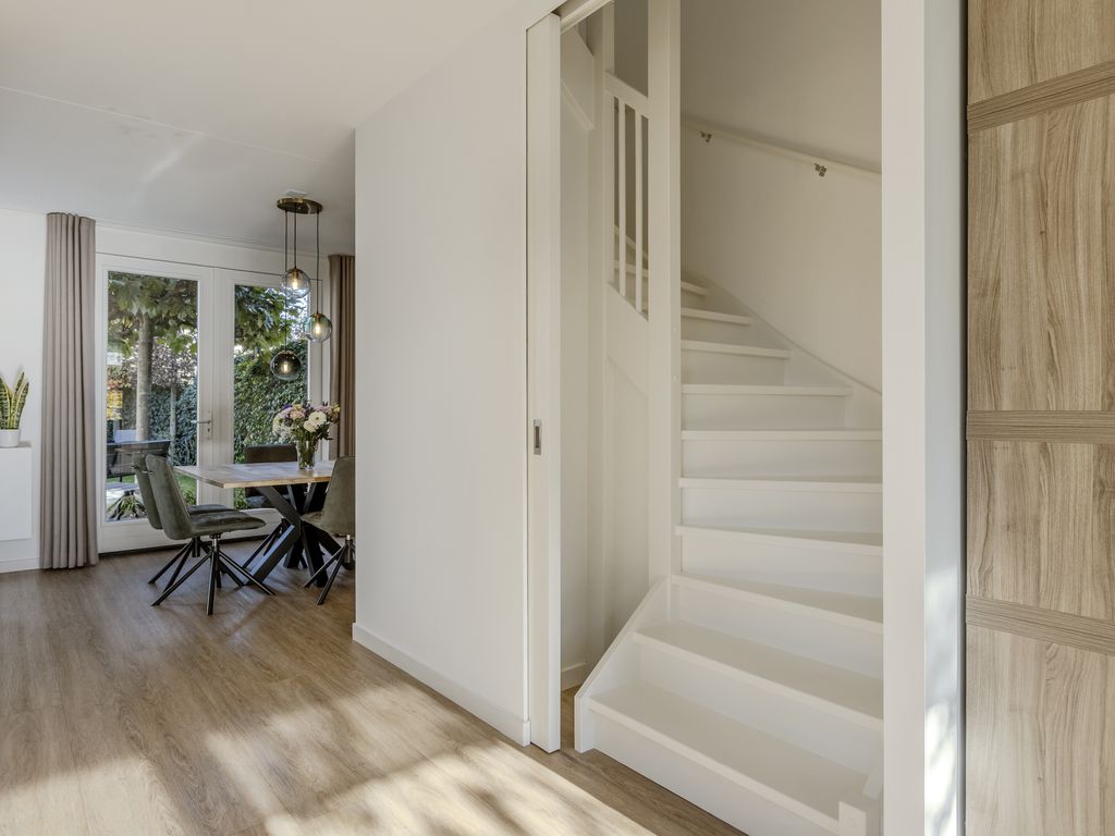 Ruime hal met uitgebreide meterkast, toiletruimte met wandcloset en fonteintje. Vanuit de hal toegang tot de woonkamer, die aan de voorzijde is ingericht als zitkamer met grote raampartijen aan zowel de voor- als zijkant en een fraai uitzicht. Het centrale trappenportaal is stijlvol afgesloten met een kamerhoge schuifdeur en onder de trap is praktische bergruimte gecreëerd achter een blinde deur.