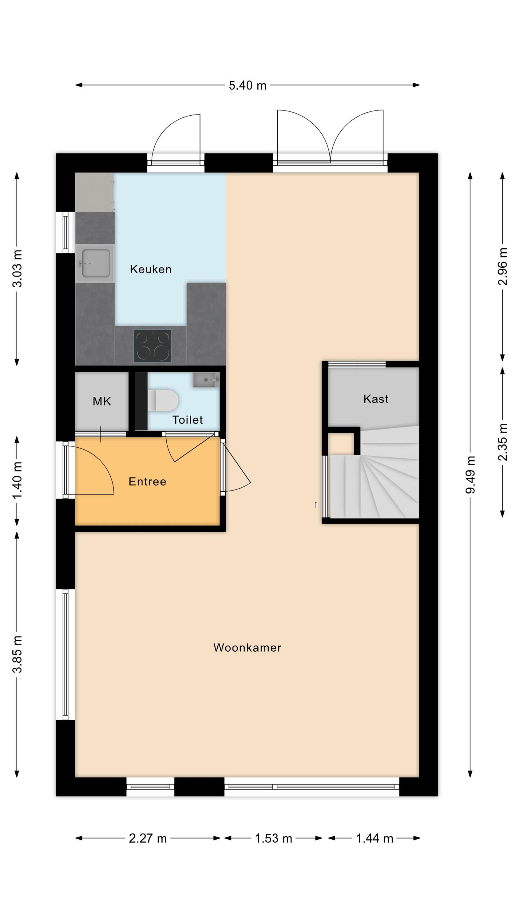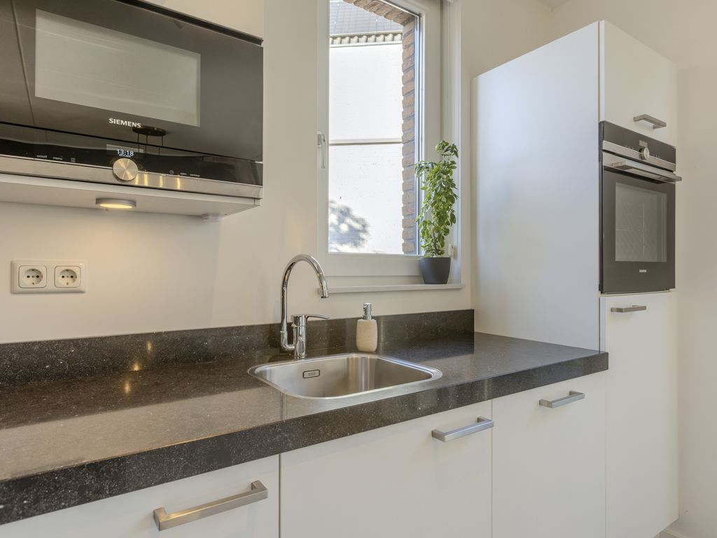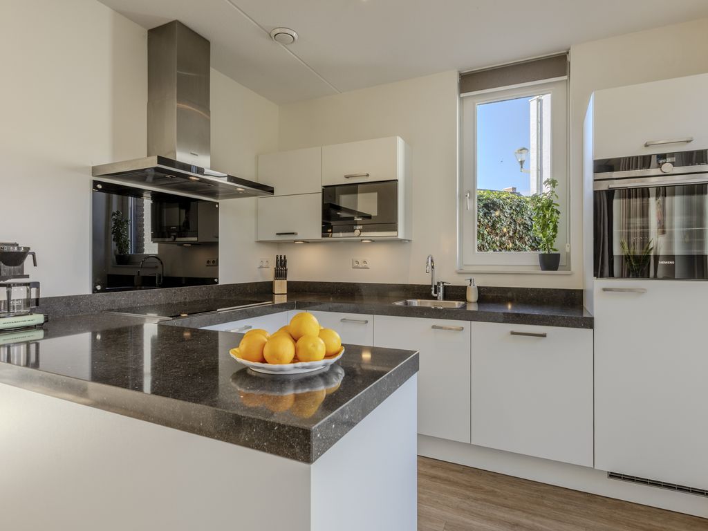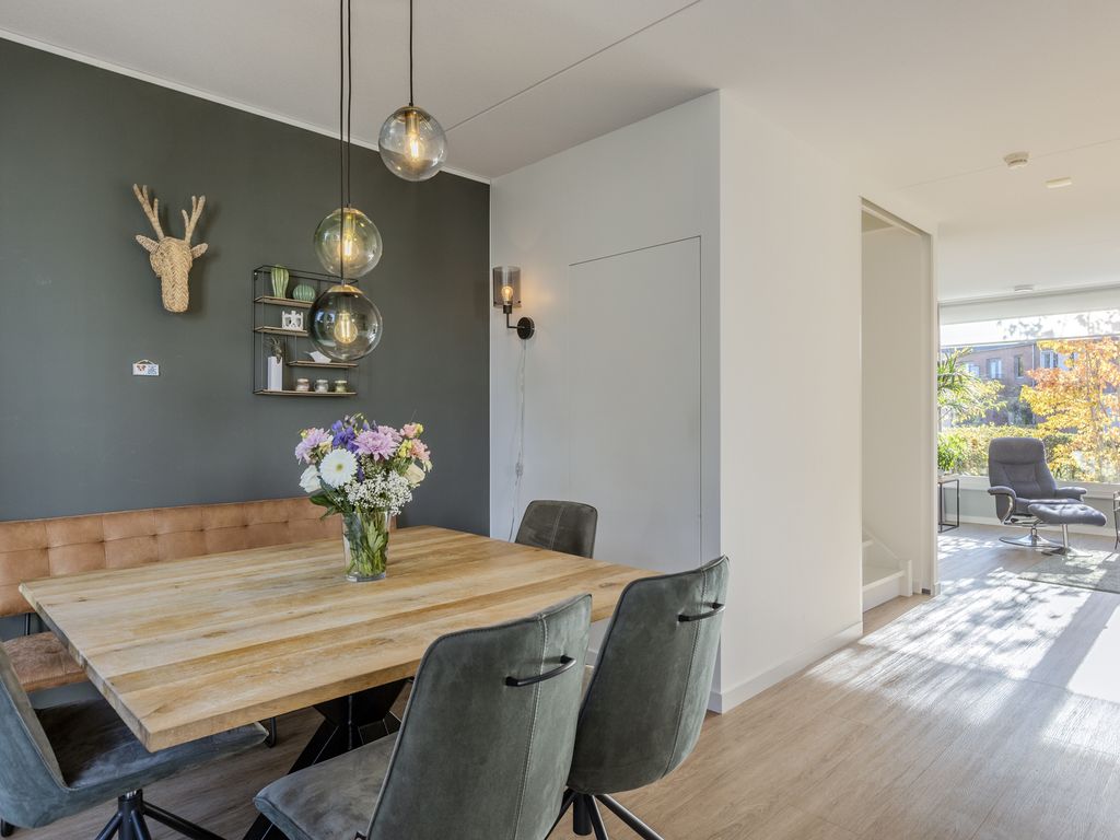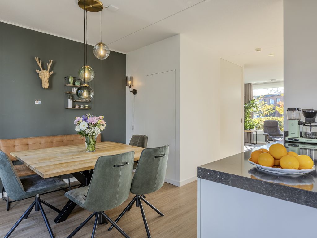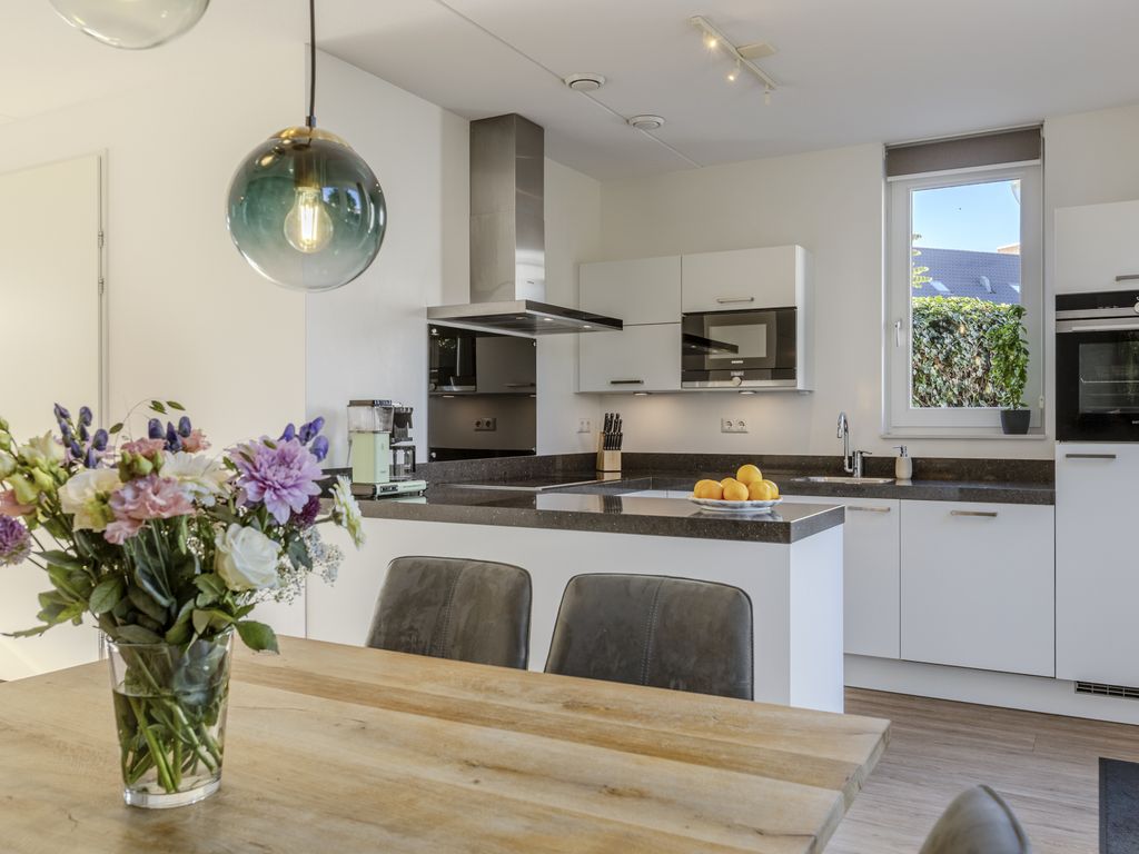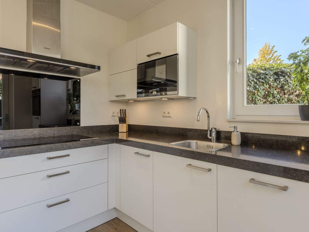 Aan de achterzijde bevindt zich de eetkamer met openslaande tuindeuren, in open verbinding met de moderne U-vormige keuken. Deze lichte keuken is uitgerust met een composiet werkblad (werkhoogte 93 cm) en voorzien van een 5-pits inductiekookplaat, afzuigkap, vaatwasser, koelkast, vriezer, oven en magnetron.
