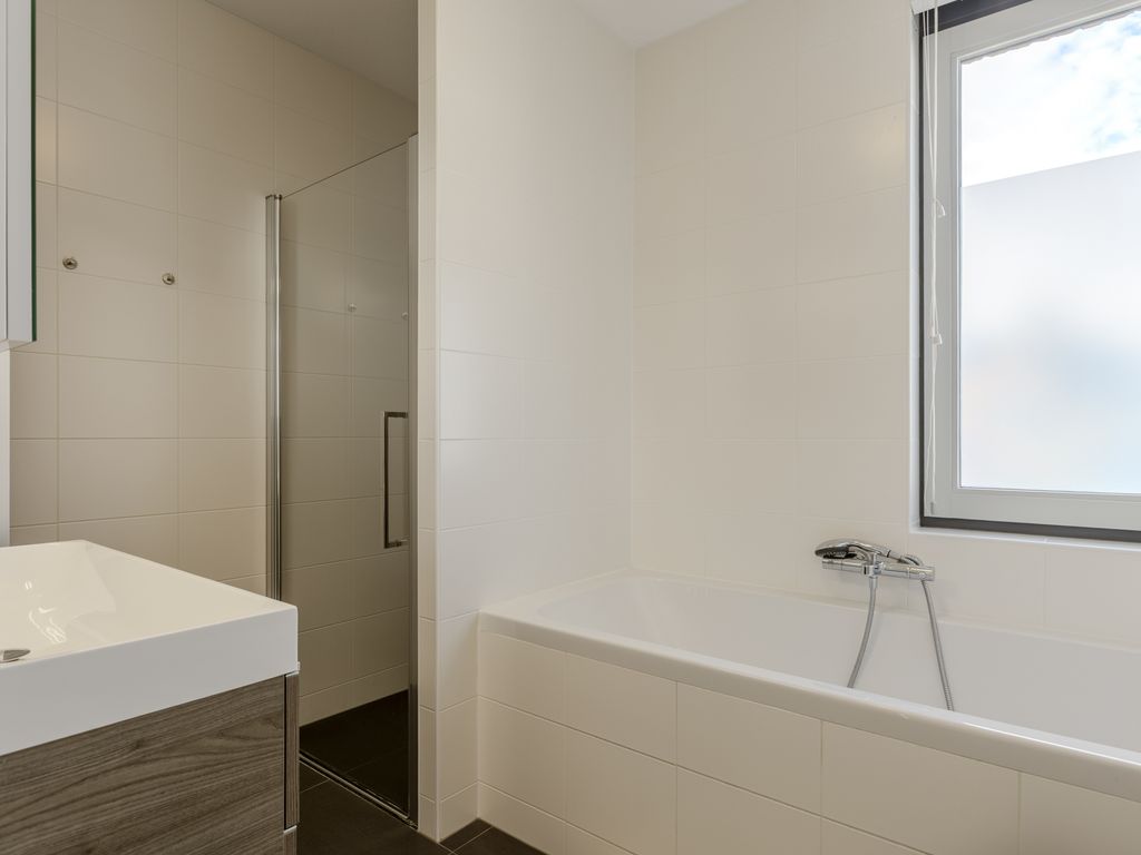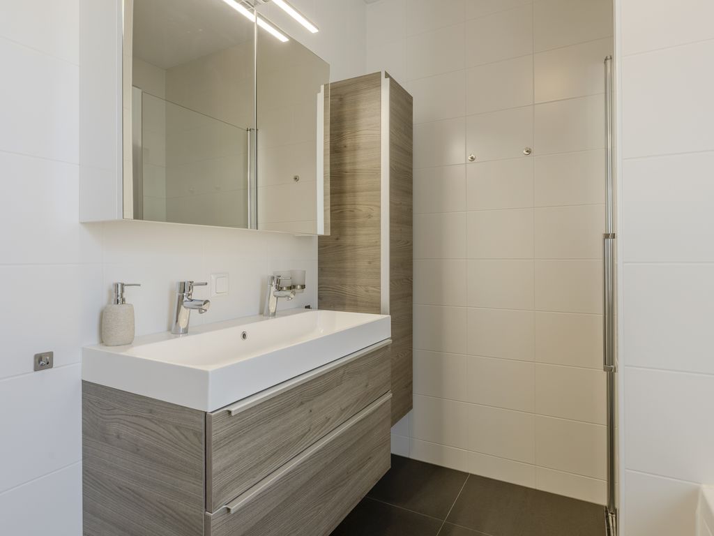 De badkamer is modern en voorzien van een raam, een inloopdouche, ligbad en een dubbel wastafelmeubel met spiegelkast en een kolomkast.