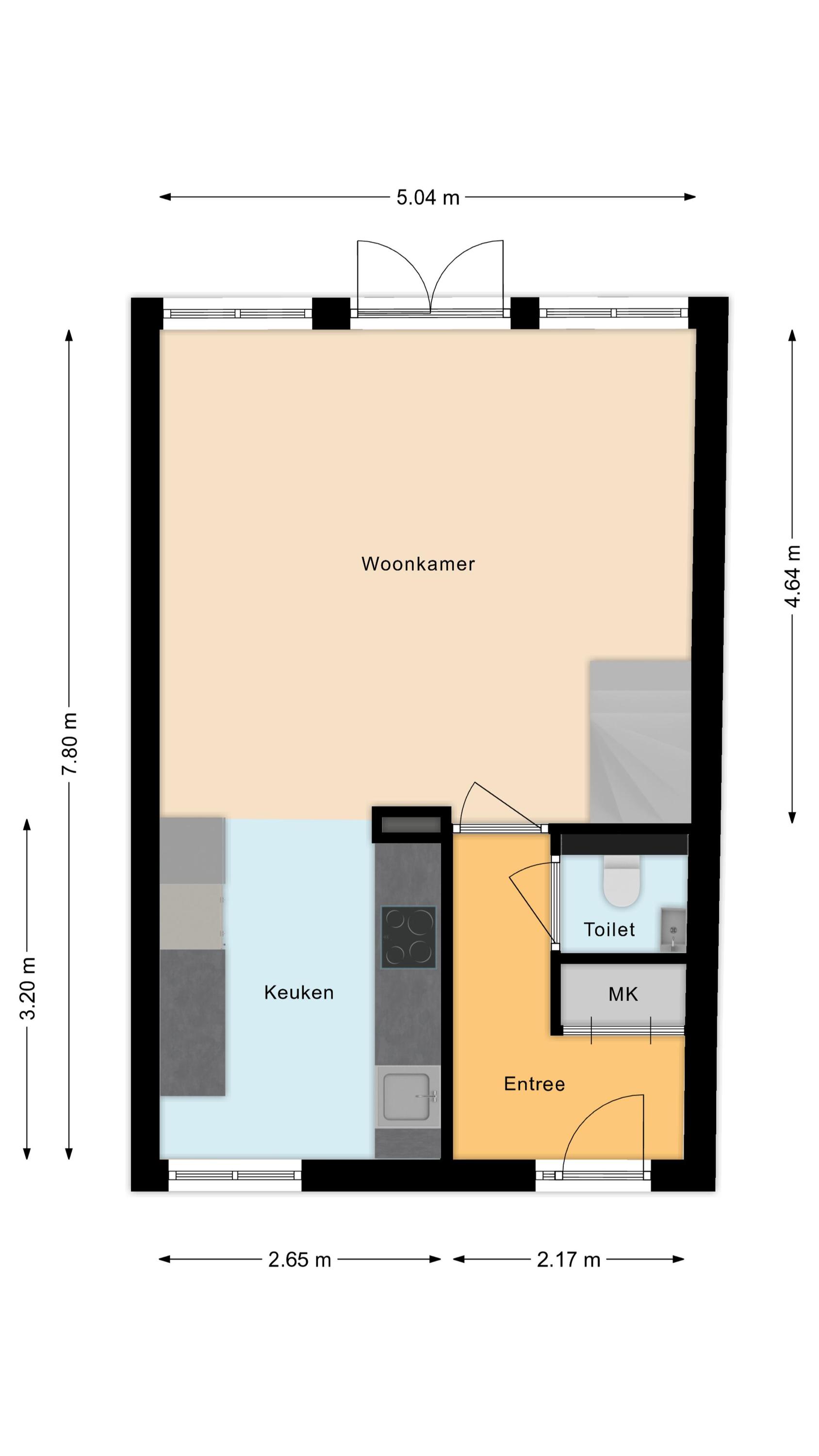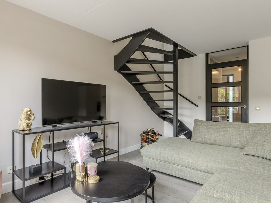 Lichte woonkamer met raampartijen over de gehele breedte aan de achterzijde en twee openslaande tuindeuren naar de achtertuin. Open trap naar de verdieping.
