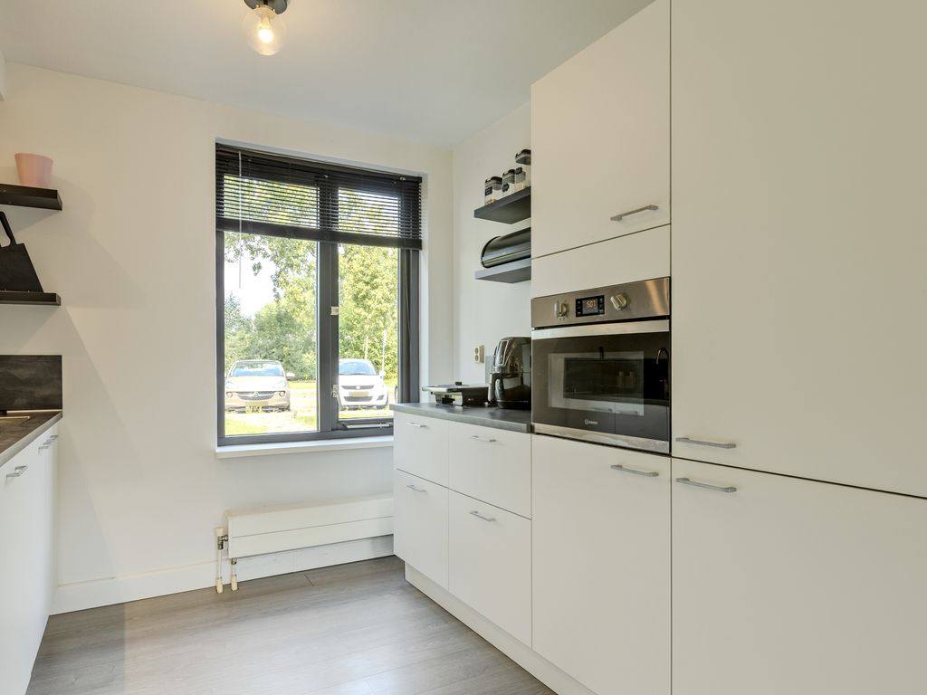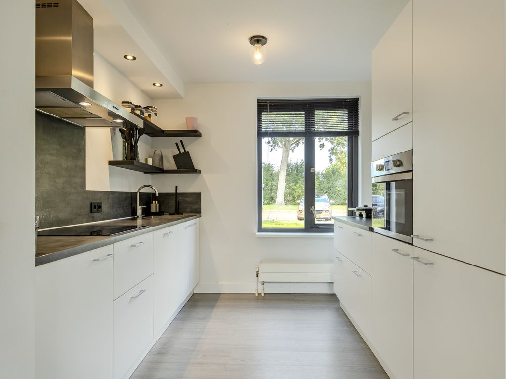 Moderne, licht uitgevoerde inbouwkeuken (2021), in tegenover elkaar geplaatste opstelling, uitgerust met een inductiekookplaat, afzuigkap, vaatwasser, combimagnetron en koel-/vriescombinatie. De gehele begane grond is voorzien van een laminaatvloer.