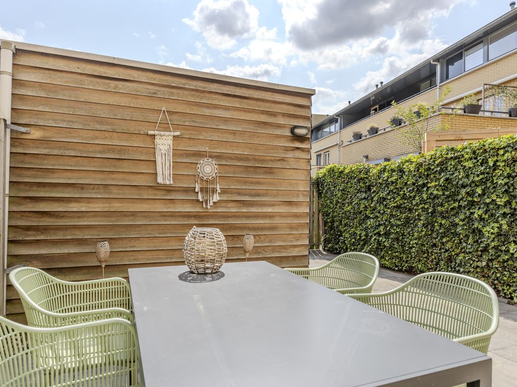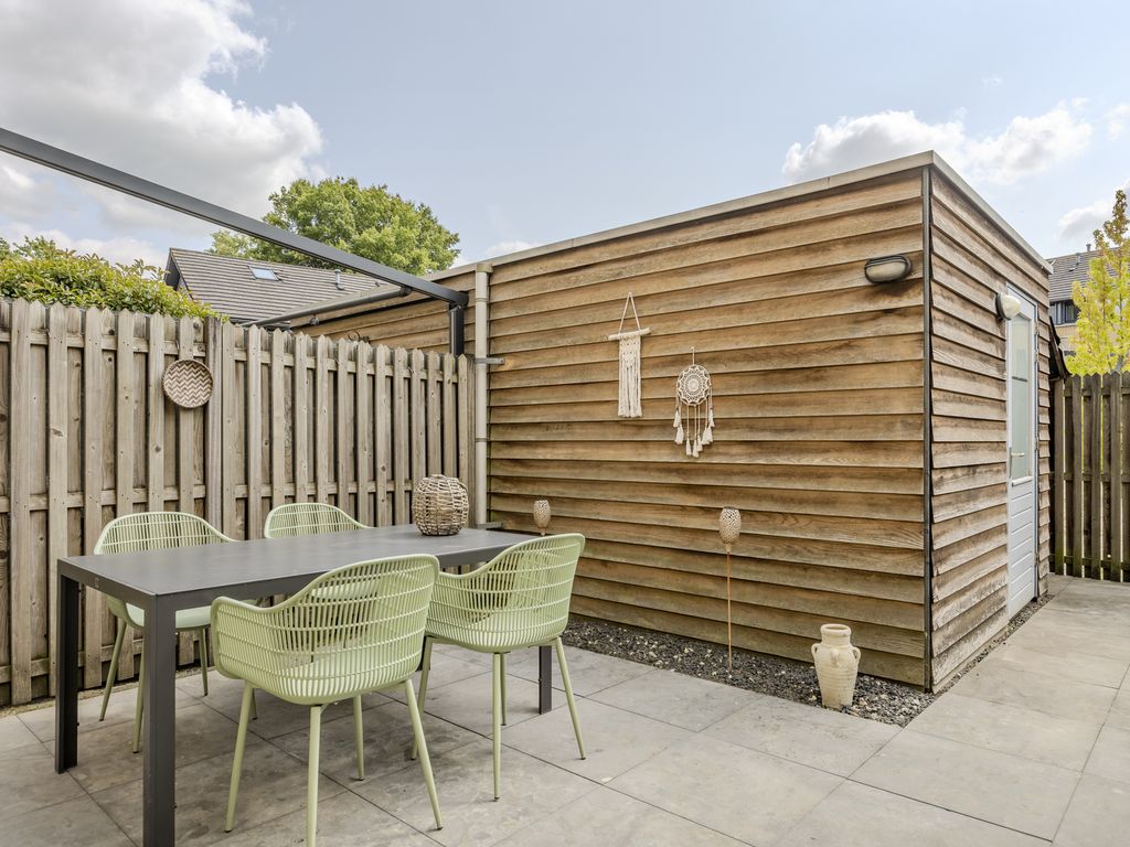 De onderhoudsarme achtertuin is volledig betegeld, gelegen op het zuiden en bereikbaar via een achterom.