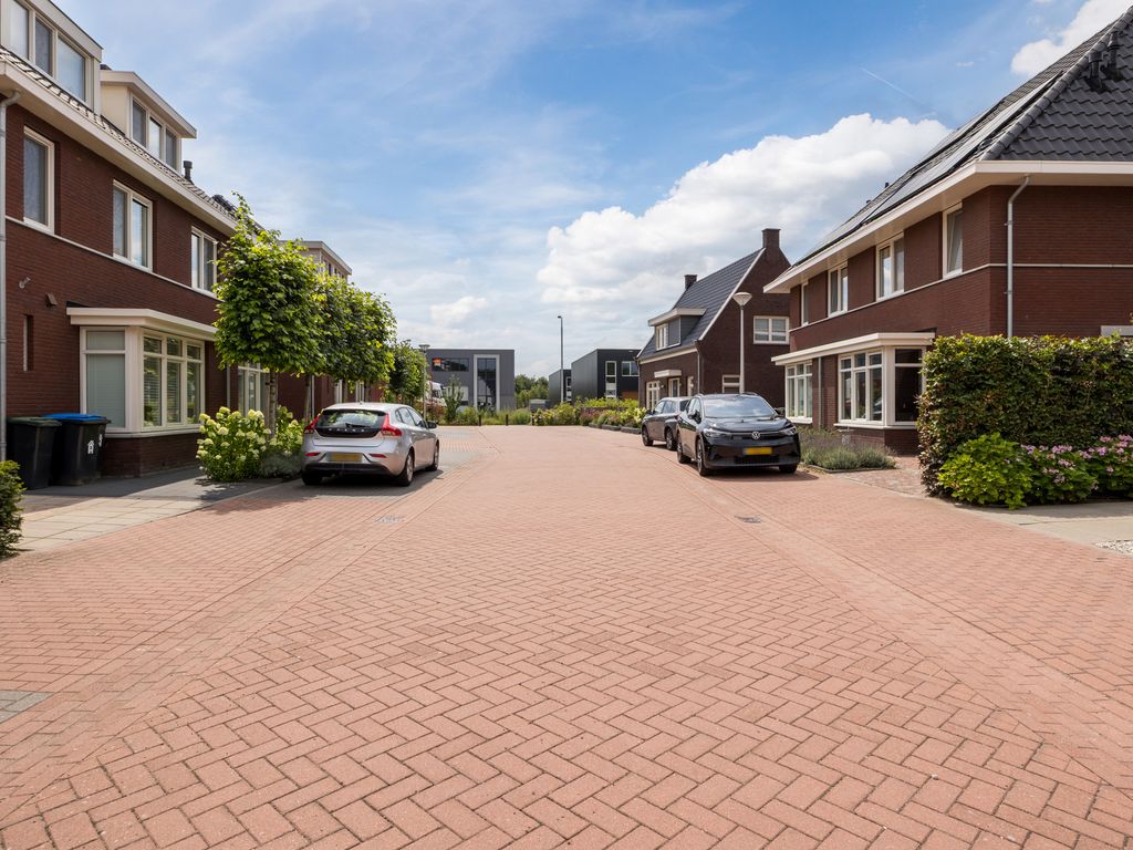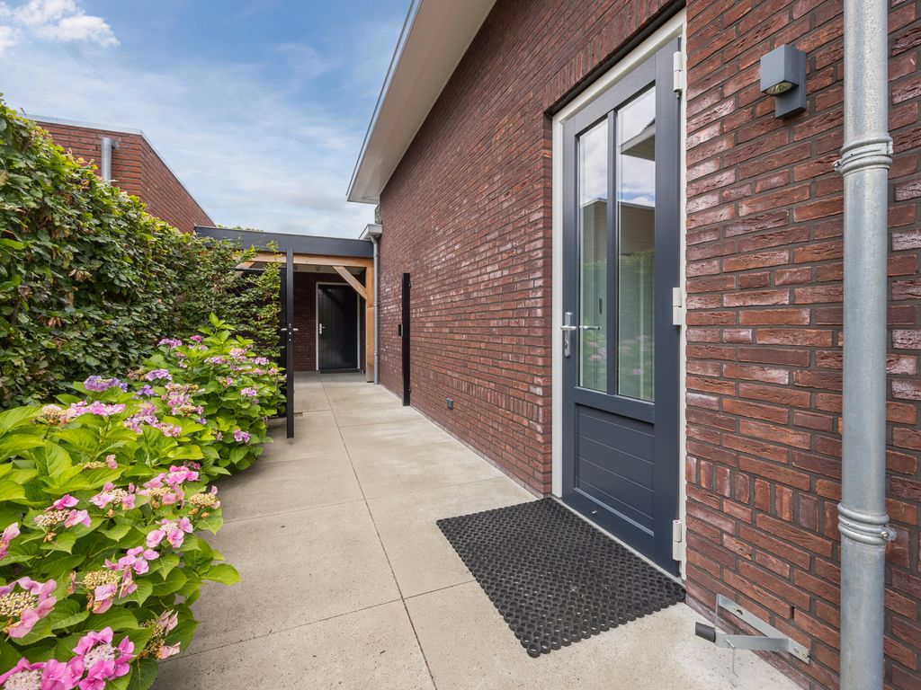 Aan de voorzijde ligt een brede oprit met ruimte voor drie auto’s naast elkaar, met de mogelijkheid om uit te breiden naar vier plaatsen. Voor een elektrische auto is een loze leiding voor een laadpaal alvast voorbereid.