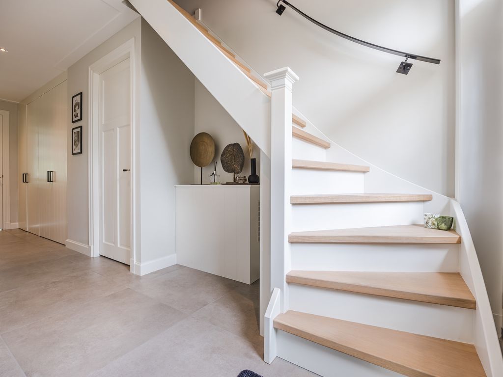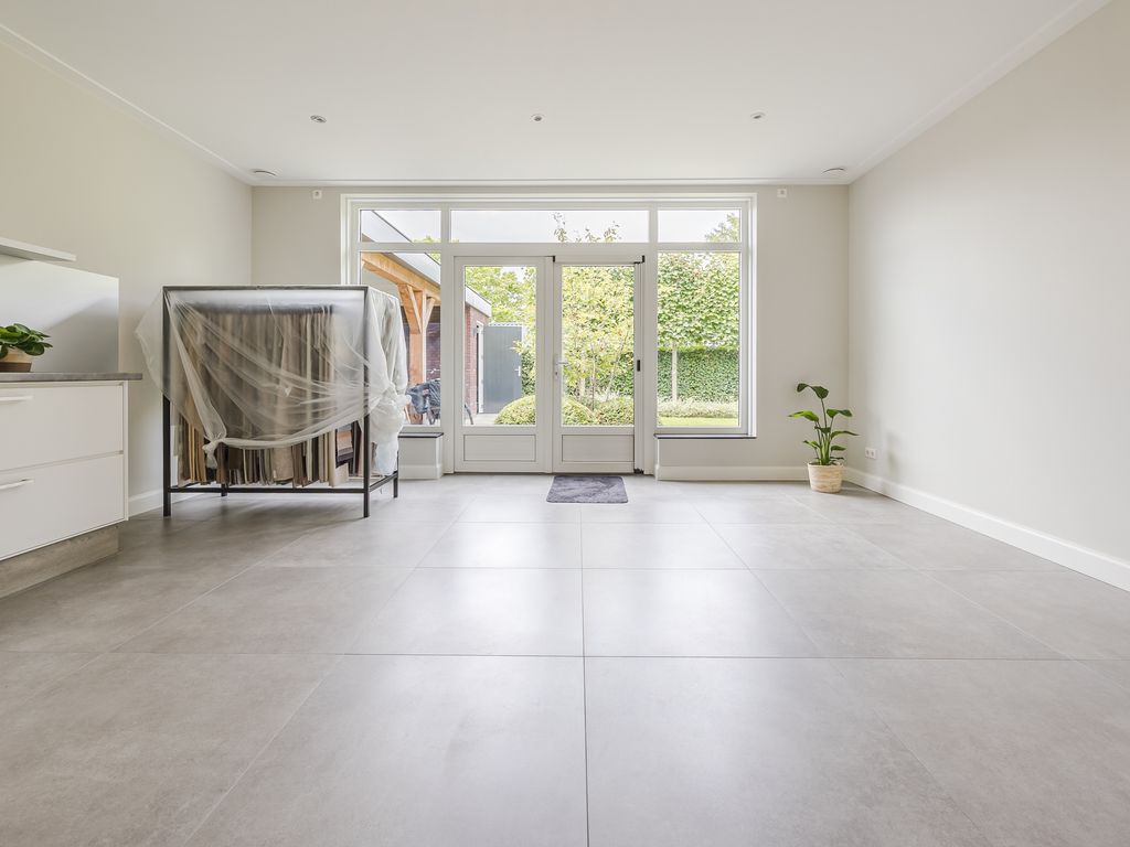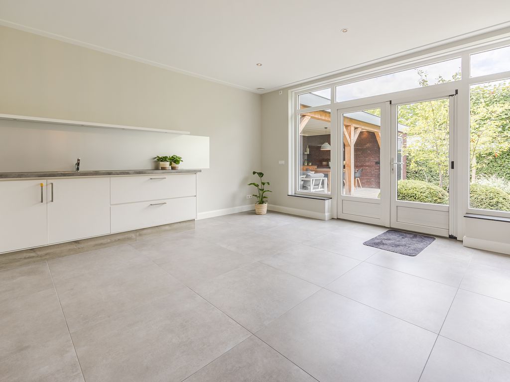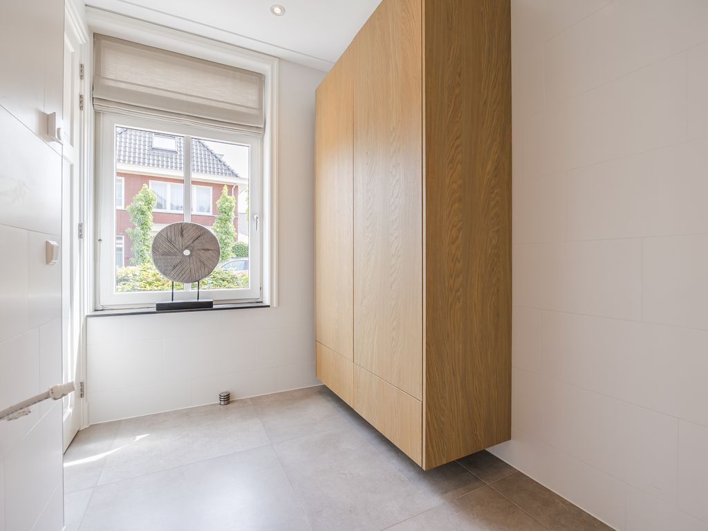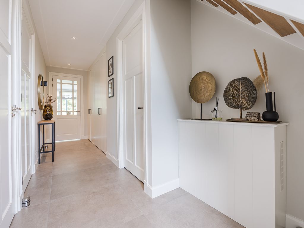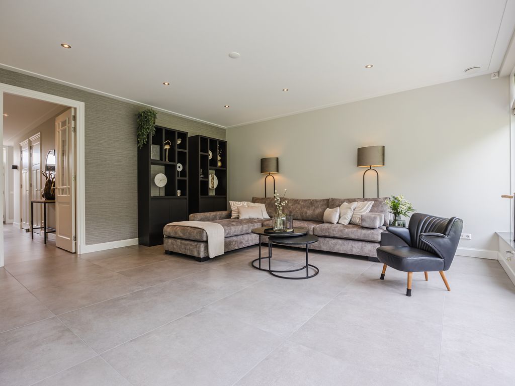 U komt binnen in een statige hal in herenhuisstijl, met klassieke paneeldeuren, brede plafondlijsten en een stijlvolle trap. Vanuit hier bereikt u de royale woon-/tuinkamer, waar de imposante glaspui van ruim dertien meter breed direct de aandacht trekt. Drie dubbele tuindeuren zorgen voor een overvloed aan daglicht en een naadloze overgang naar de tuin.