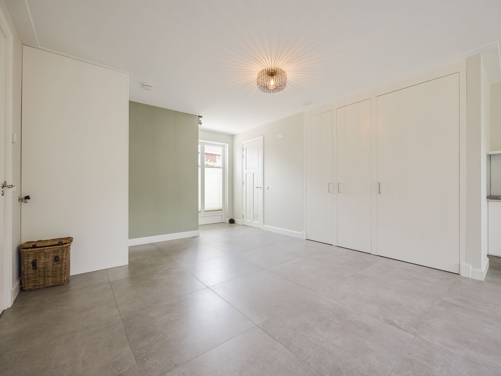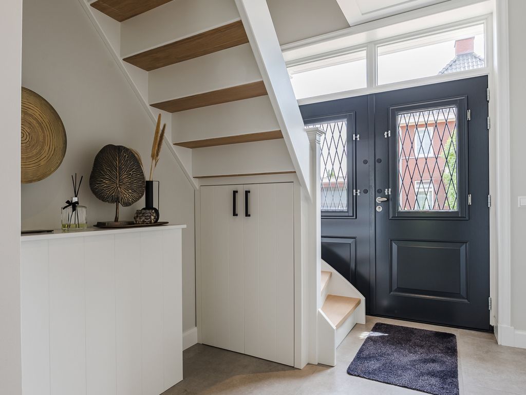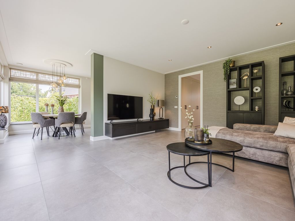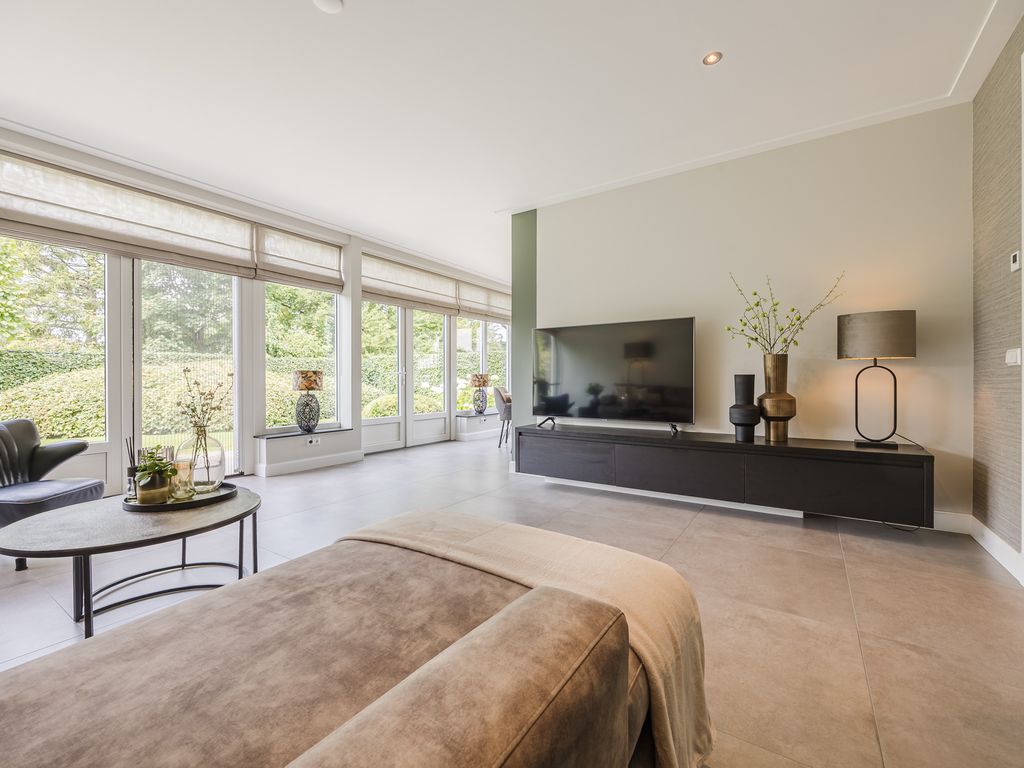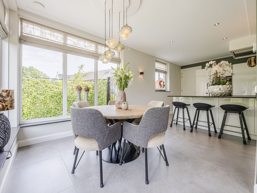 U komt binnen in een statige hal in herenhuisstijl, met klassieke paneeldeuren, brede plafondlijsten en een stijlvolle trap. Vanuit hier bereikt u de royale woon-/tuinkamer, waar de imposante glaspui van ruim dertien meter breed direct de aandacht trekt. Drie dubbele tuindeuren zorgen voor een overvloed aan daglicht en een naadloze overgang naar de tuin.