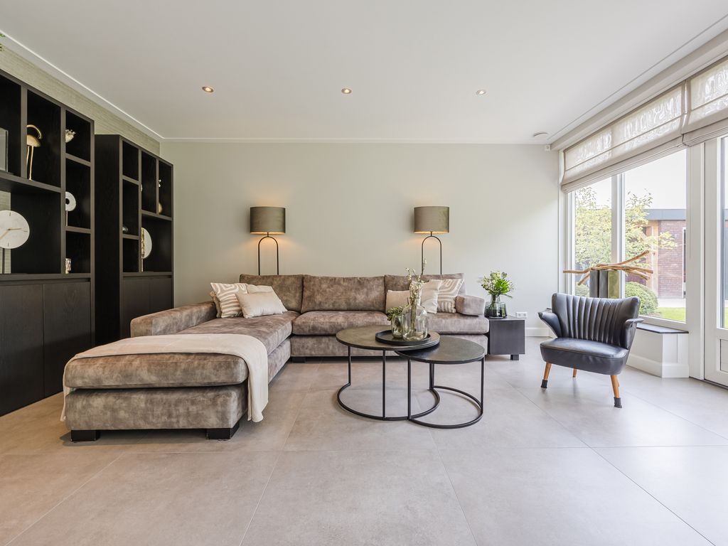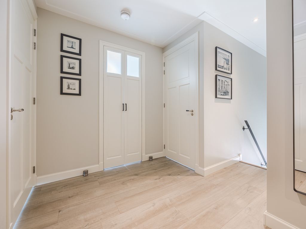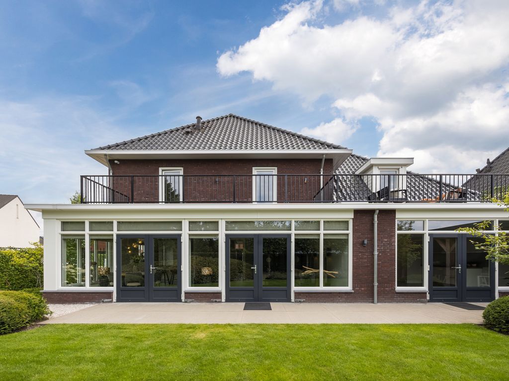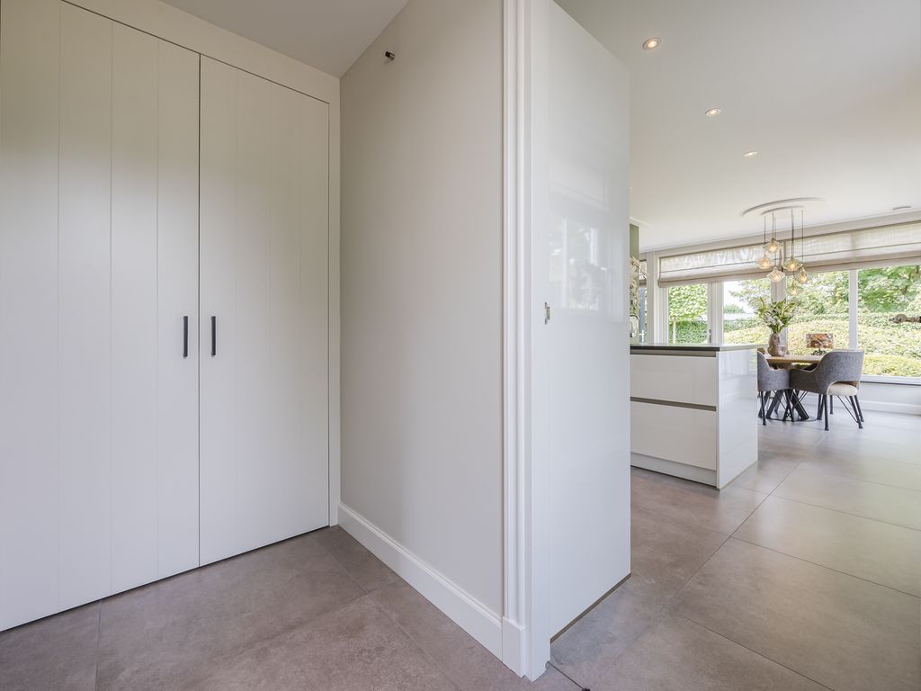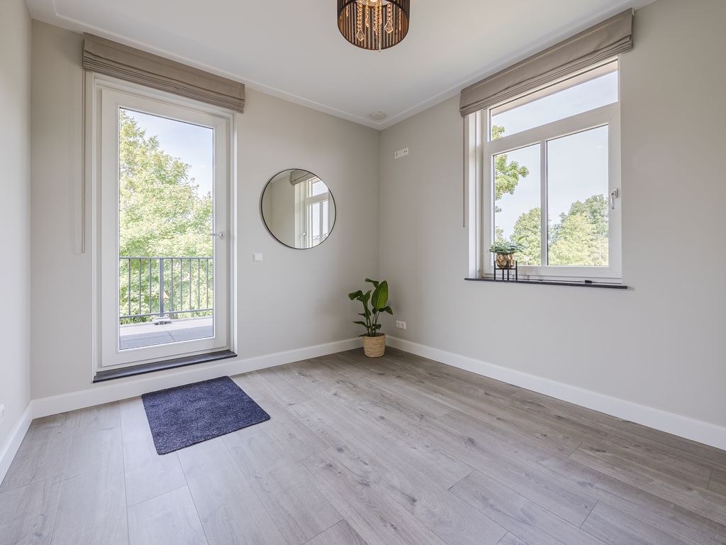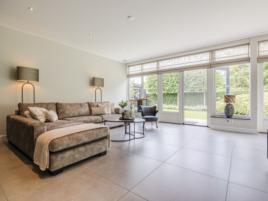 U komt binnen in een statige hal in herenhuisstijl, met klassieke paneeldeuren, brede plafondlijsten en een stijlvolle trap. Vanuit hier bereikt u de royale woon-/tuinkamer, waar de imposante glaspui van ruim dertien meter breed direct de aandacht trekt. Drie dubbele tuindeuren zorgen voor een overvloed aan daglicht en een naadloze overgang naar de tuin.