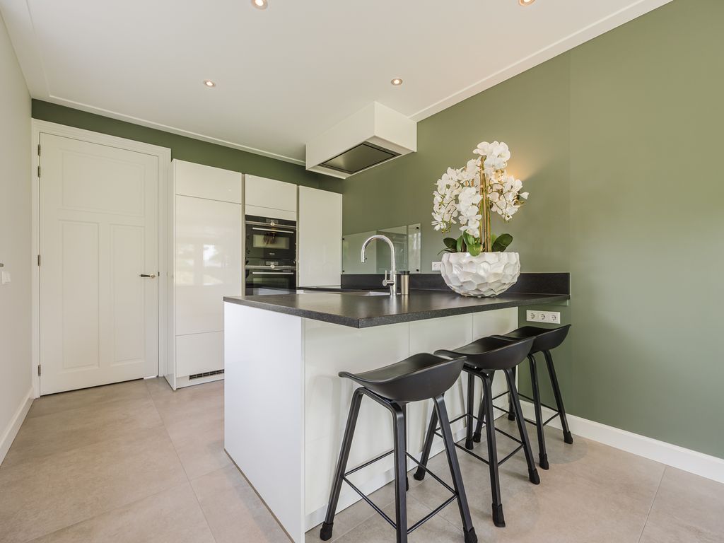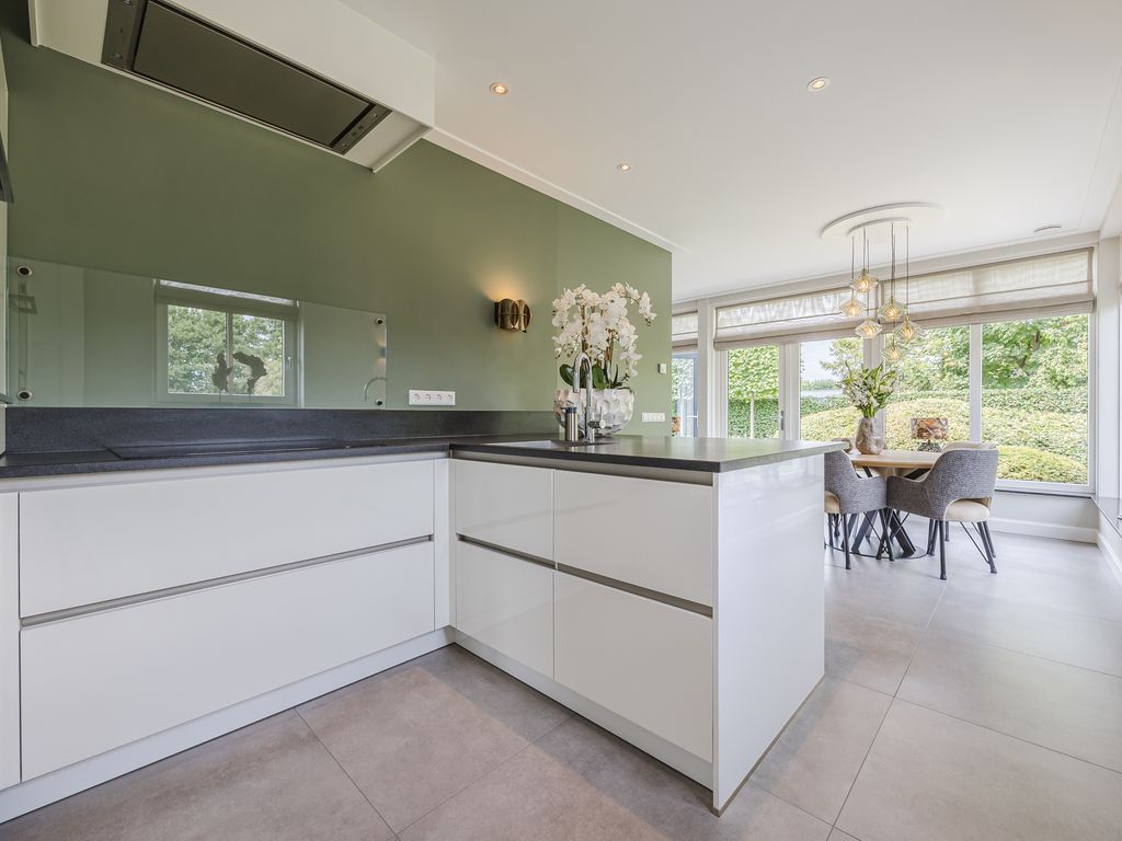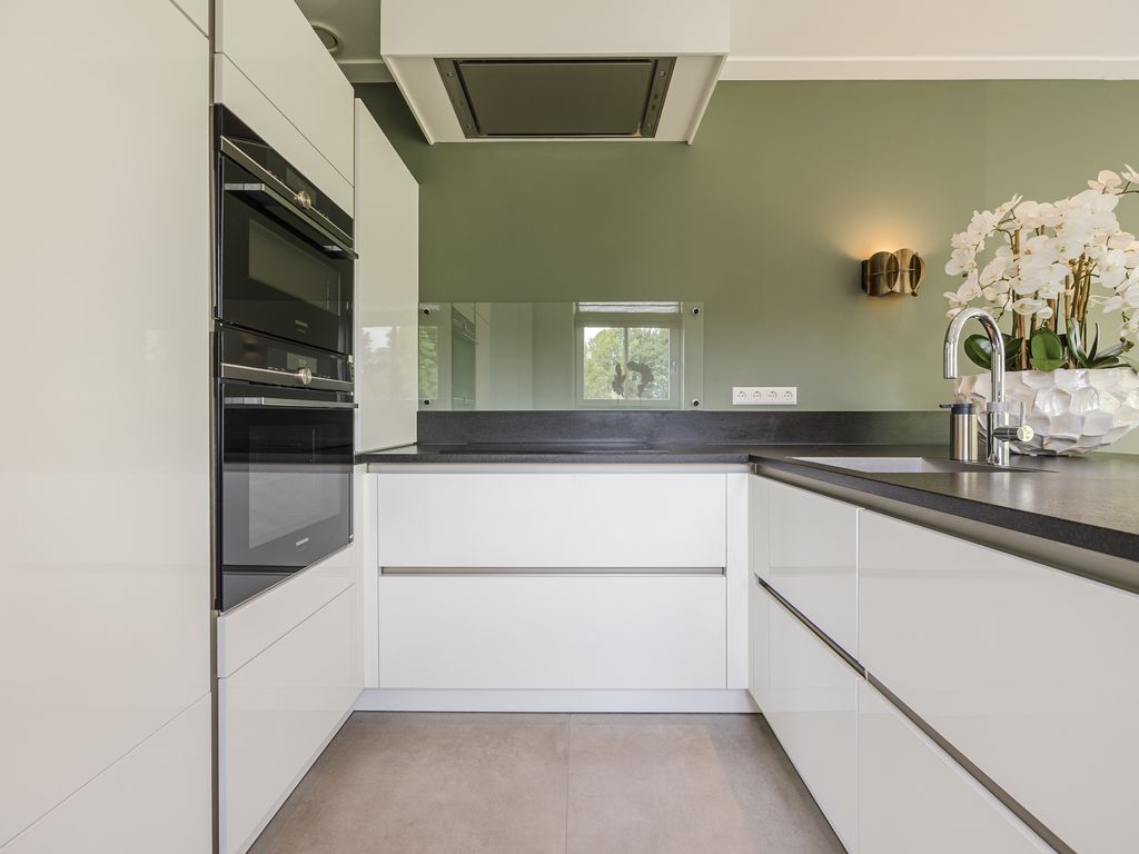 De keuken bevindt zich zijkant van de woning. Deze hoogglans witte inrichting met natuurstenen blad combineert een wandopstelling met een schiereiland inclusief bargedeelte. De keuken is volledig uitgerust met luxe Siemens iQ700-serie inbouwapparatuur, waaronder een stoomoven, combimagnetron en een brede inductiekookplaat met doorlopende kookzones, aangevuld met een stille Novy-afzuigkap met uitgelagerde motor, een Quooker Flex, een Miele vaatwasser, een Siemens koelkast en een rvs spoelbak. Dimbare verlichting, van spots tot wandlampen en hanglampen, maakt het geheel compleet en zorgt voor een warme sfeer.
