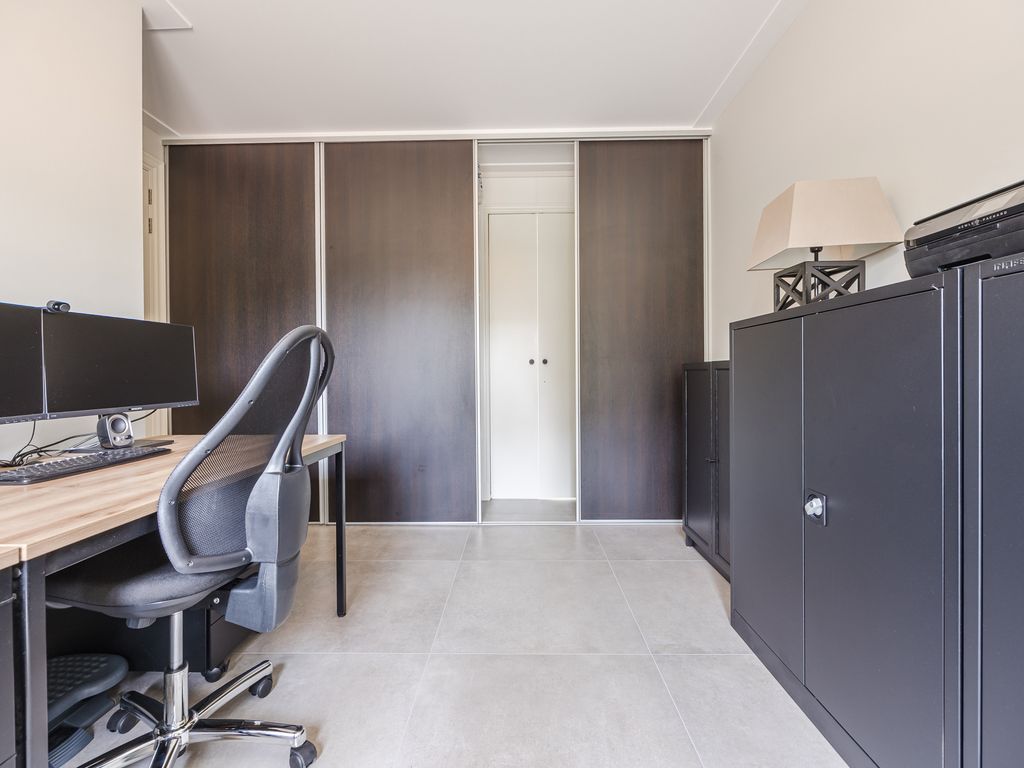 Aan de voorzijde van de woning bevindt zich een kantoor of slaapkamer, ideaal voor wie gelijkvloers wil wonen of een rustige werkplek nodig heeft. Daarnaast is er een badkamer, welke nog afgemonteerd dient te worden.
