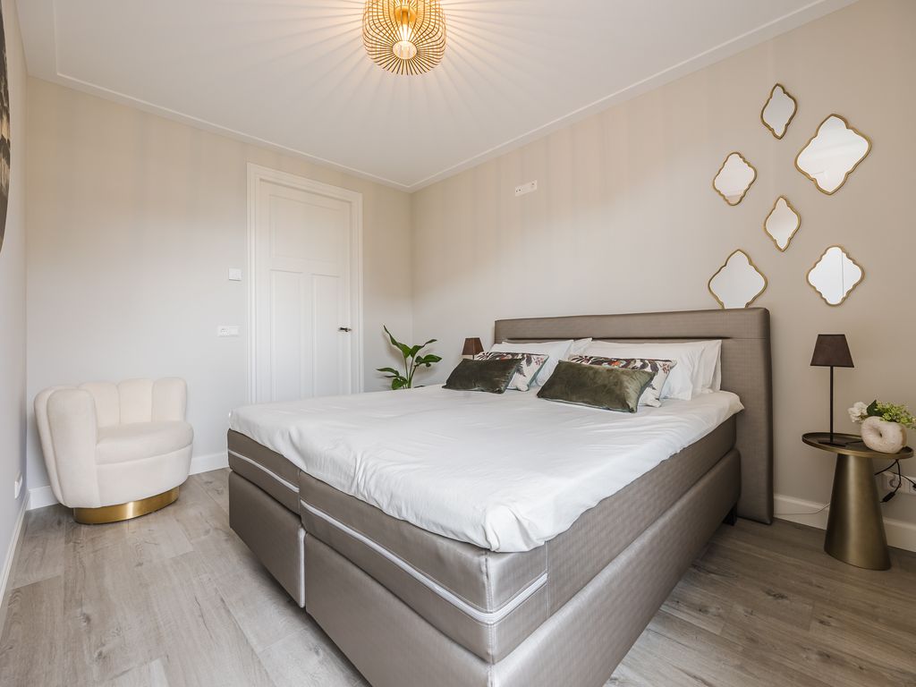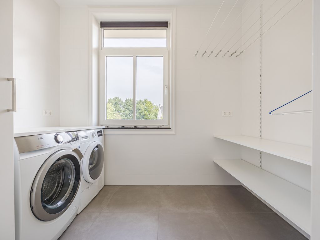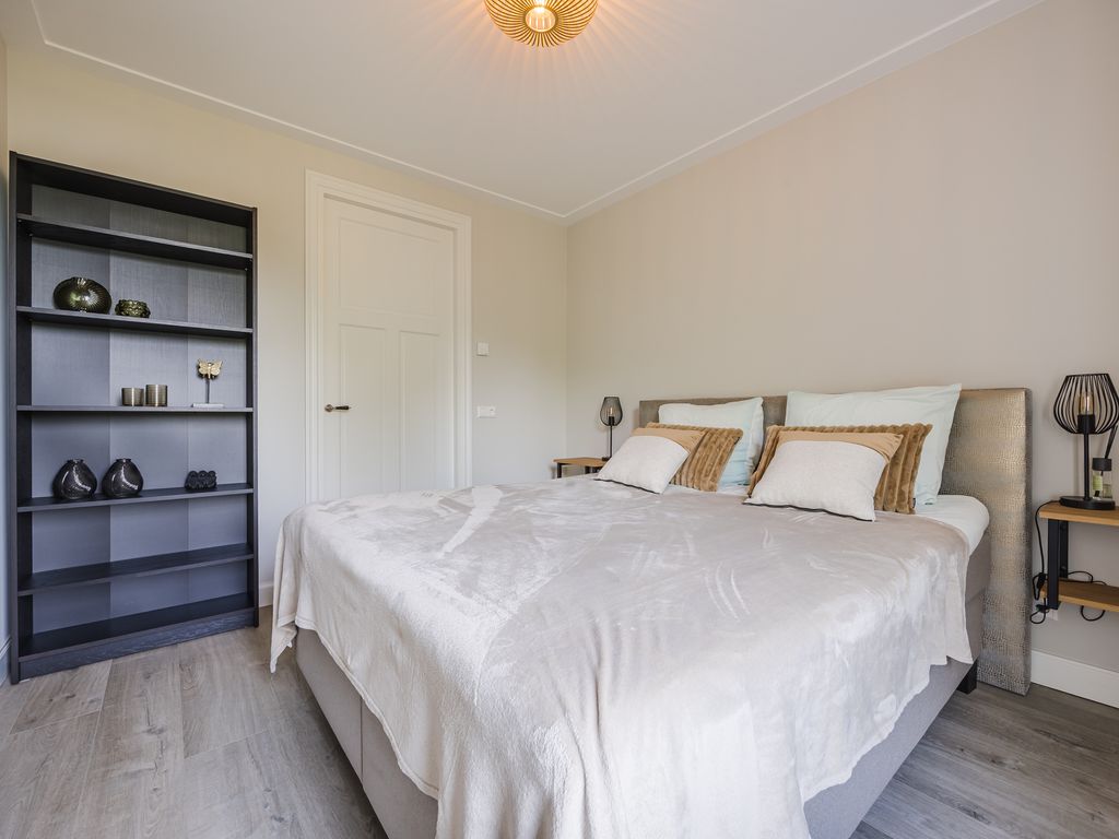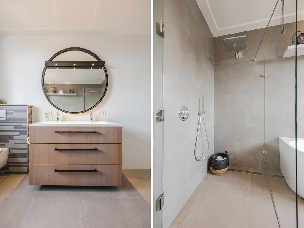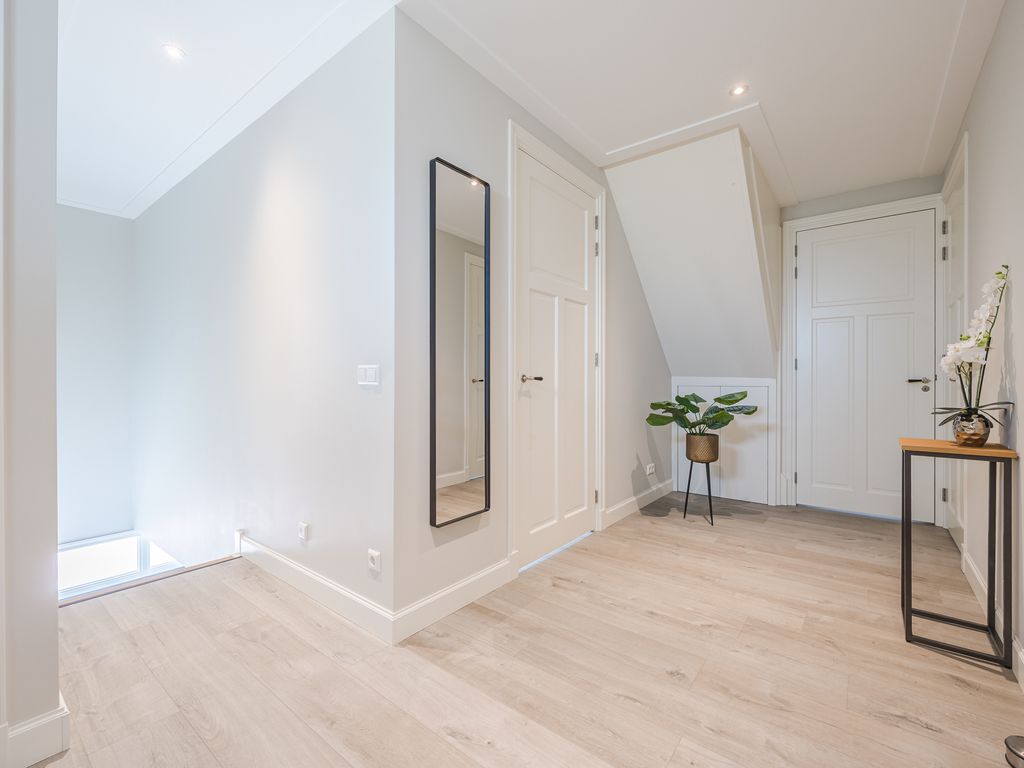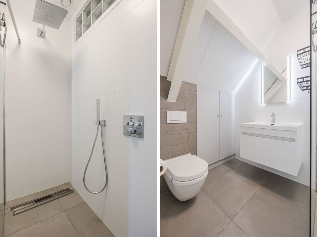 Op de eerste verdieping zijn drie volwaardige slaapkamers aanwezig, waarvan er twee direct toegang geven tot het dakterras. De luxe badkamer is uitgerust met een ruime inloopdouche, een halfvrijstaand ligbad met waterval-kraan en een maatwerkmeubel met veel opbergruimte. Sfeervolle inbouwspots, een grote spiegel en een royaal raam met vrij uitzicht maken dit tot een stijlvolle en lichte ruimte. Daarnaast is er een praktische waskamer met aansluitingen en vaste kastruimte.