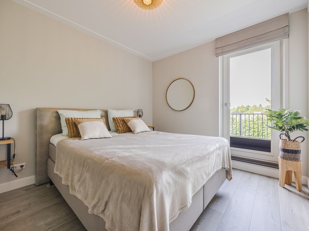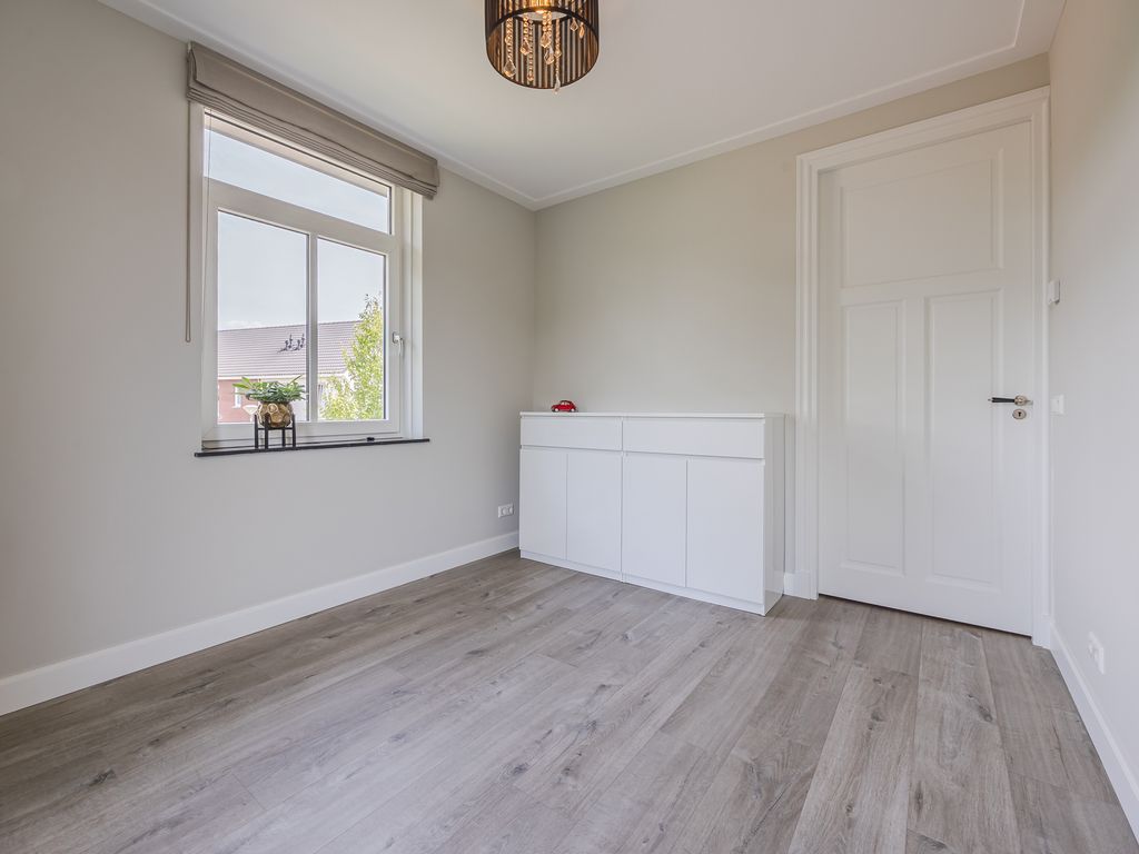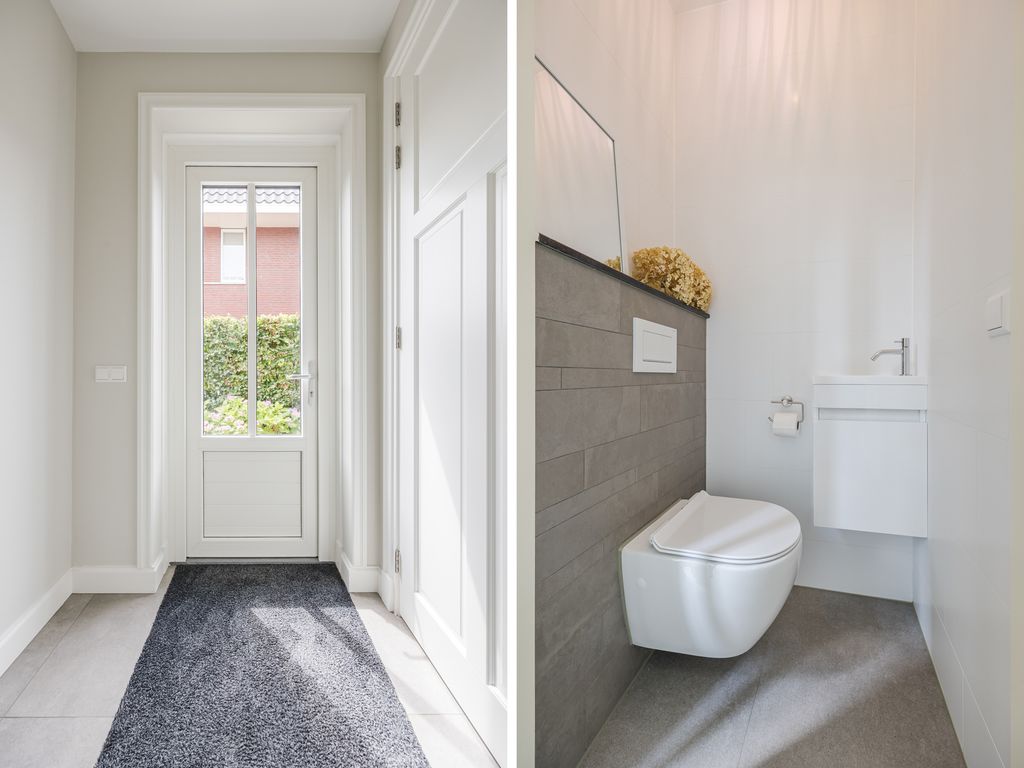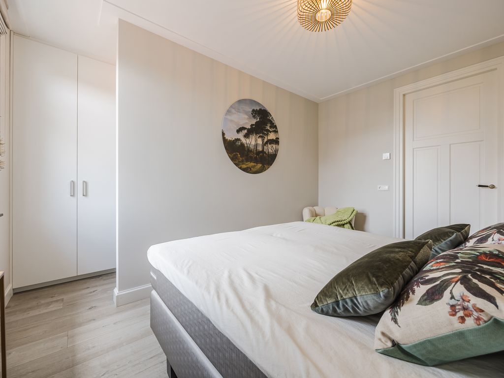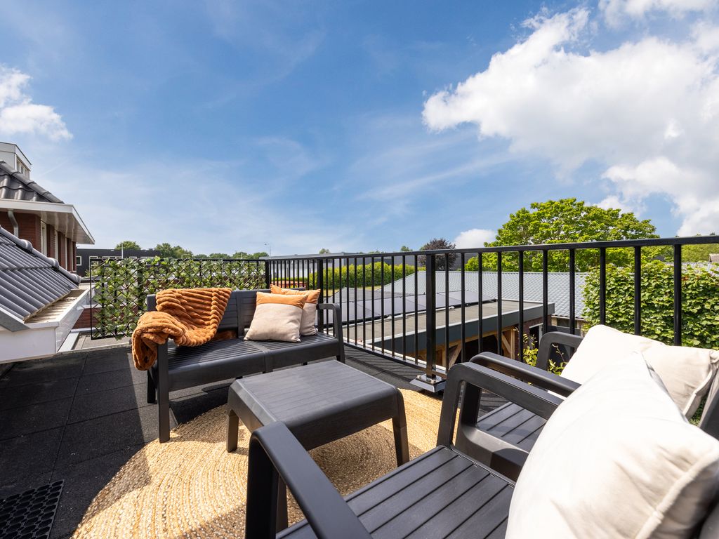 Op de eerste verdieping zijn drie volwaardige slaapkamers aanwezig, waarvan er twee direct toegang geven tot het dakterras. De luxe badkamer is uitgerust met een ruime inloopdouche, een halfvrijstaand ligbad met waterval-kraan en een maatwerkmeubel met veel opbergruimte. Sfeervolle inbouwspots, een grote spiegel en een royaal raam met vrij uitzicht maken dit tot een stijlvolle en lichte ruimte. Daarnaast is er een praktische waskamer met aansluitingen en vaste kastruimte.
