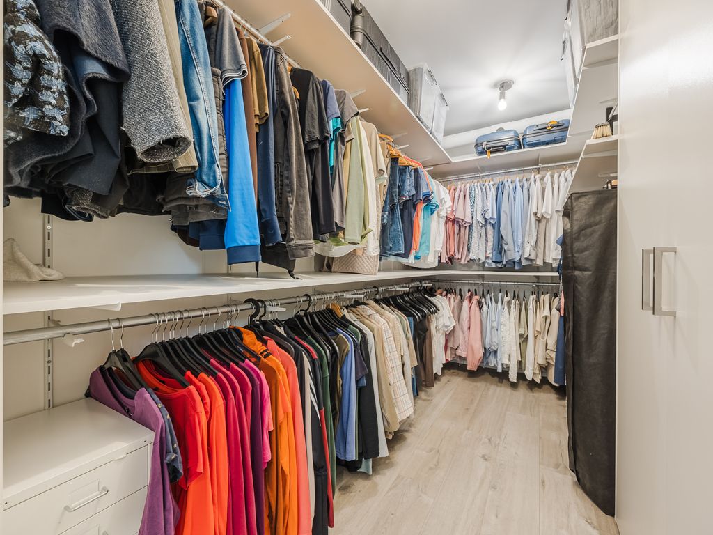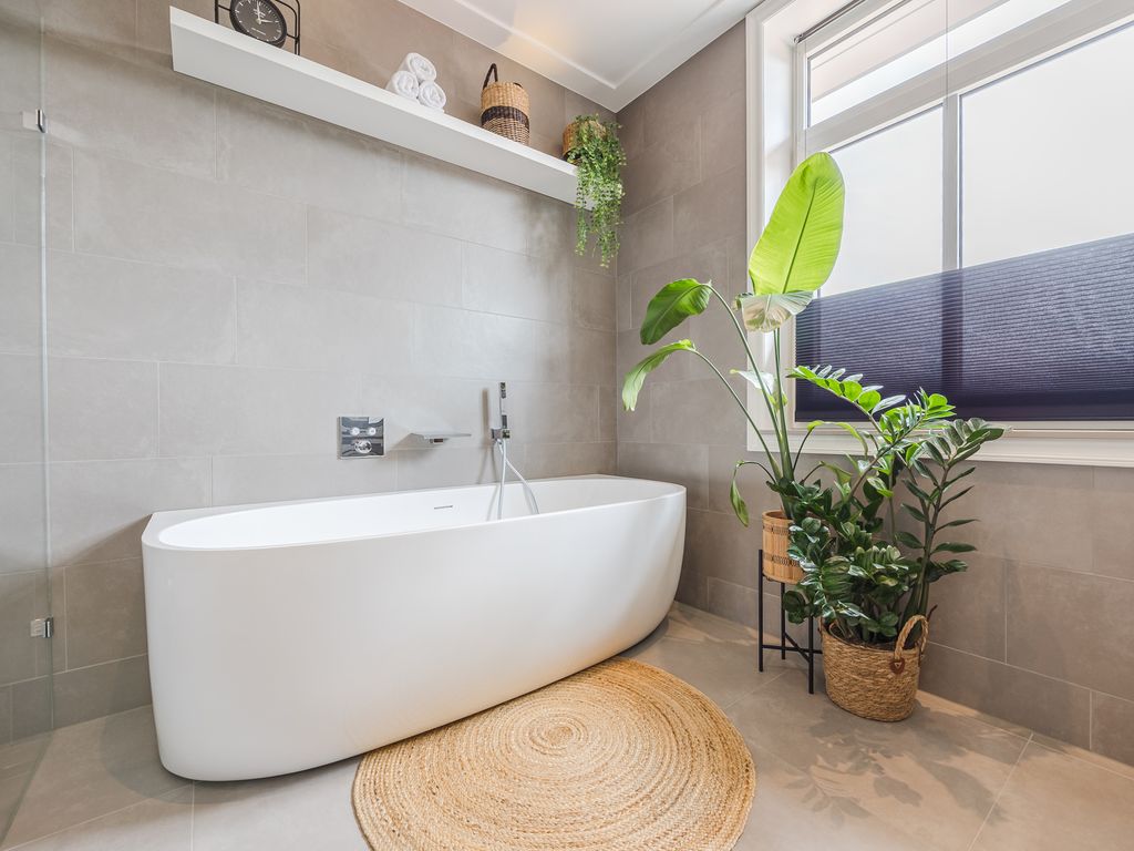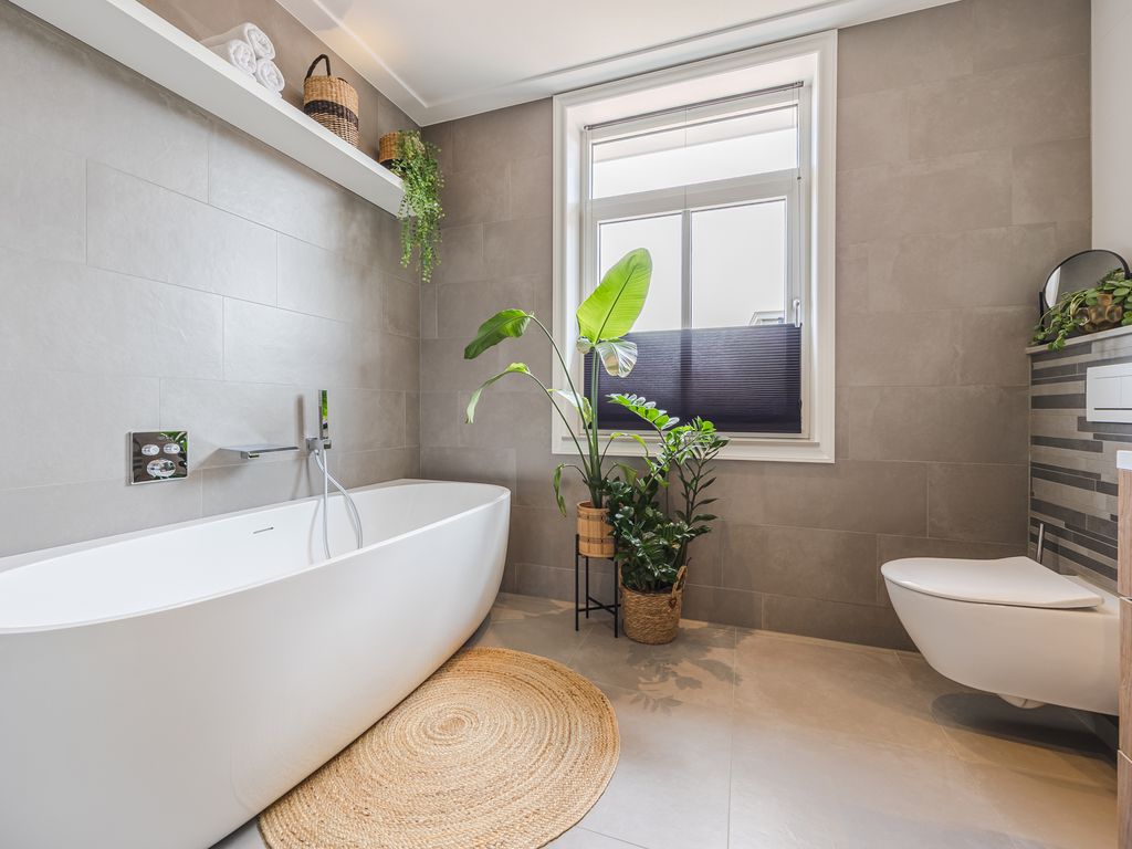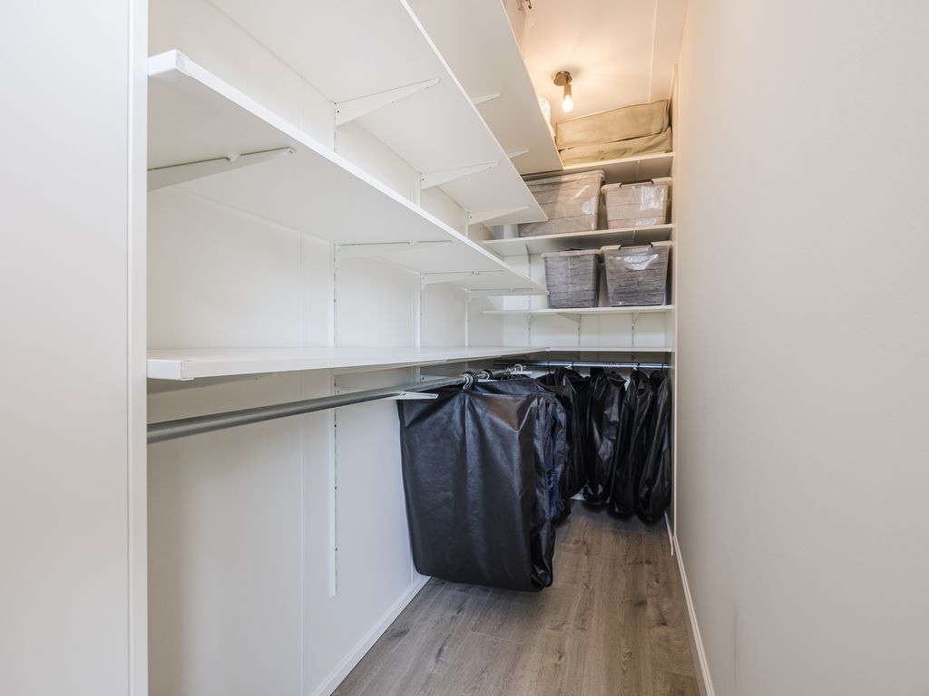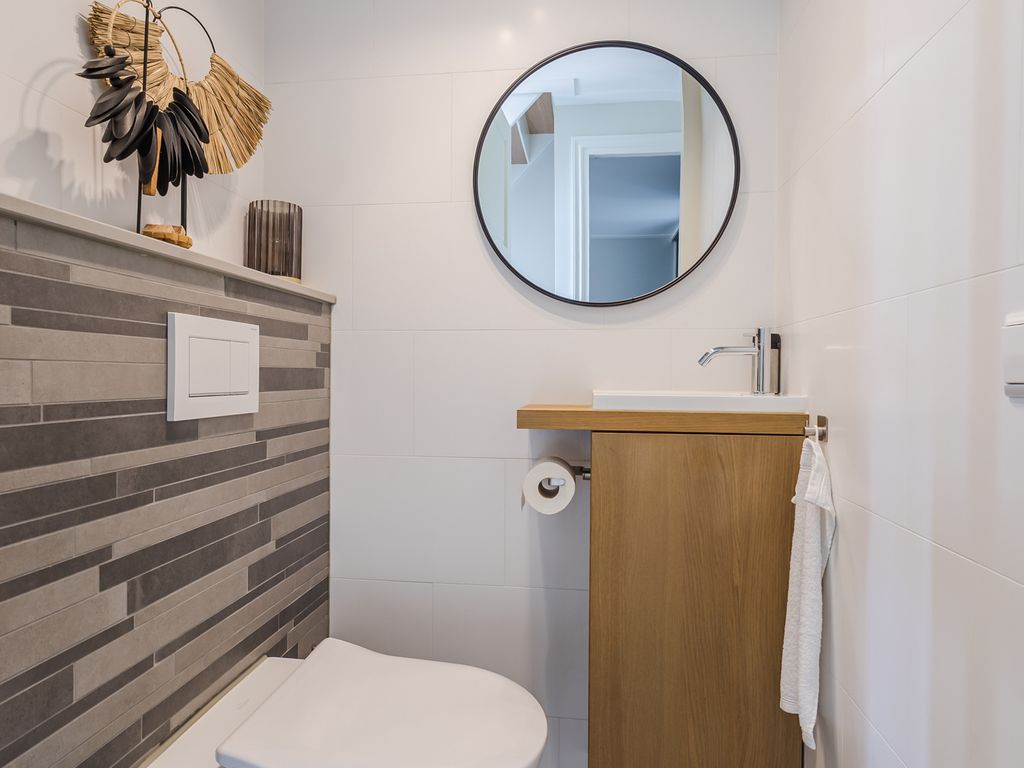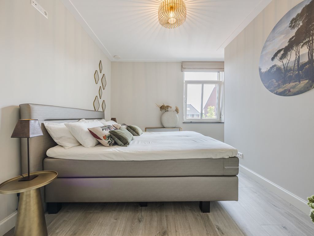 Op de eerste verdieping zijn drie volwaardige slaapkamers aanwezig, waarvan er twee direct toegang geven tot het dakterras. De luxe badkamer is uitgerust met een ruime inloopdouche, een halfvrijstaand ligbad met waterval-kraan en een maatwerkmeubel met veel opbergruimte. Sfeervolle inbouwspots, een grote spiegel en een royaal raam met vrij uitzicht maken dit tot een stijlvolle en lichte ruimte. Daarnaast is er een praktische waskamer met aansluitingen en vaste kastruimte.