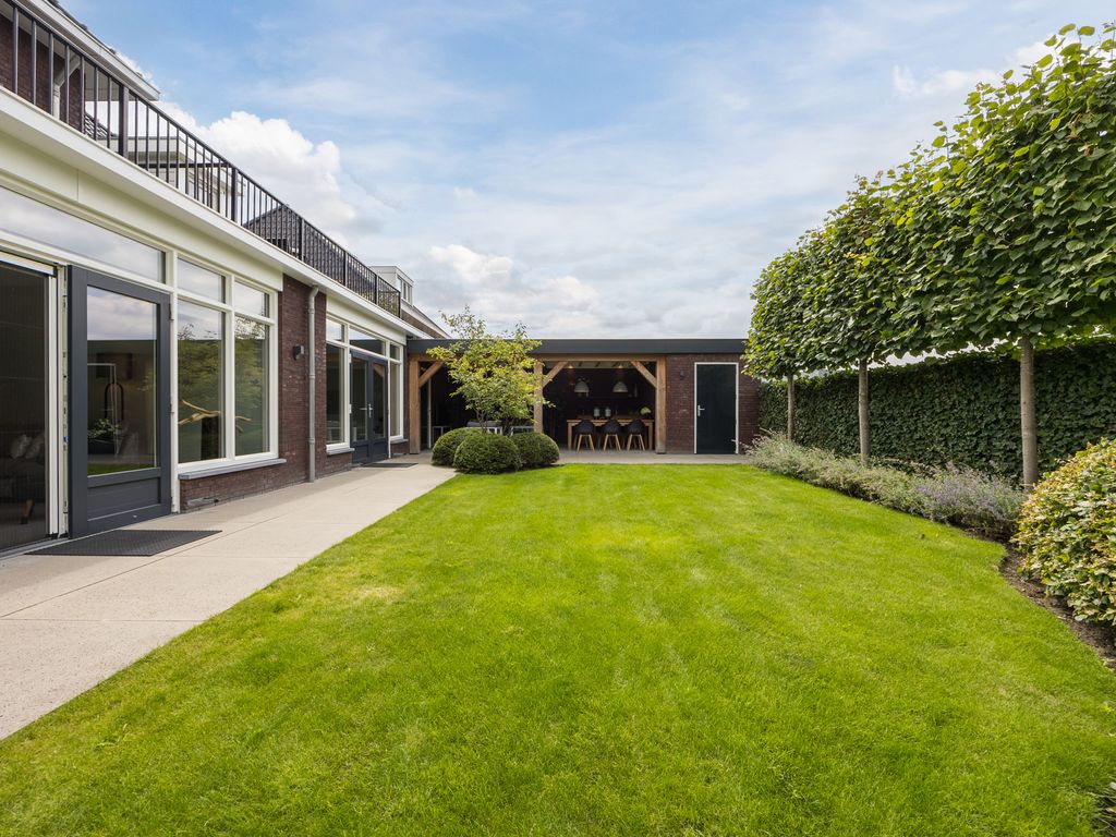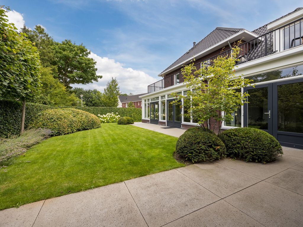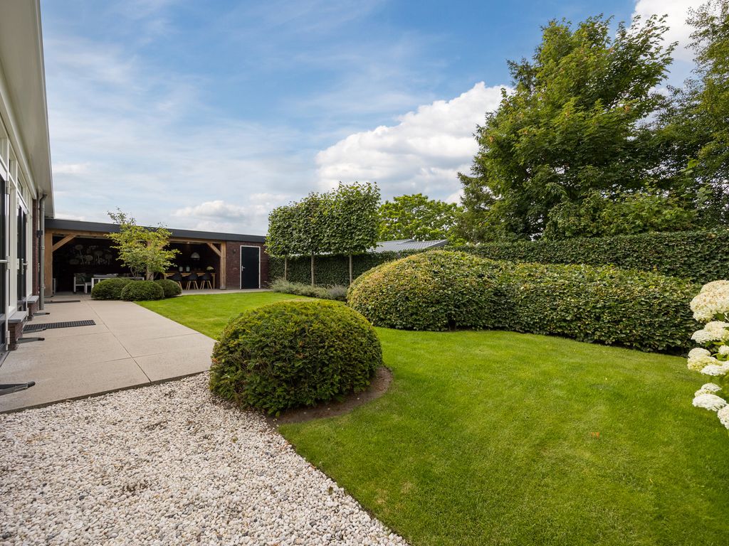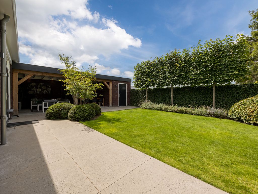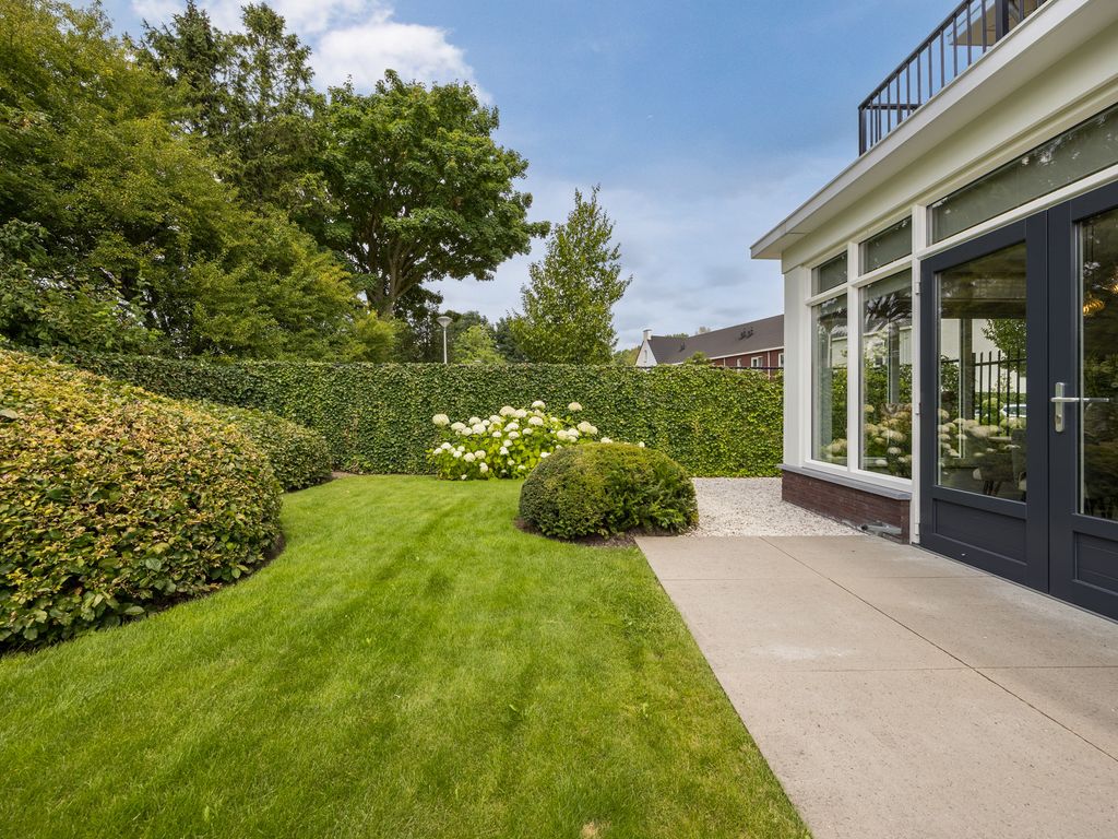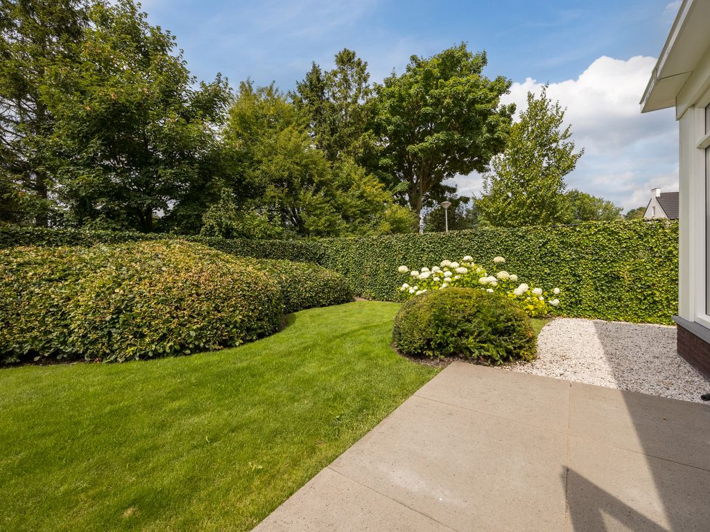De woning staat centraal op het perceel en is omringd door een architectonisch aangelegde tuin met volwassen groen en optimale privacy. De tuin is voorzien van een automatisch beregenings- en druppelsysteem en heeft twee afsluitbare poorten. Vanuit de woonkeuken en de tuinkamer loopt u zo het bestraatte terras op, waar u kunt genieten van het uitzicht en de rust.