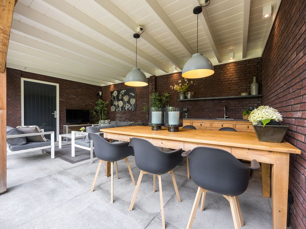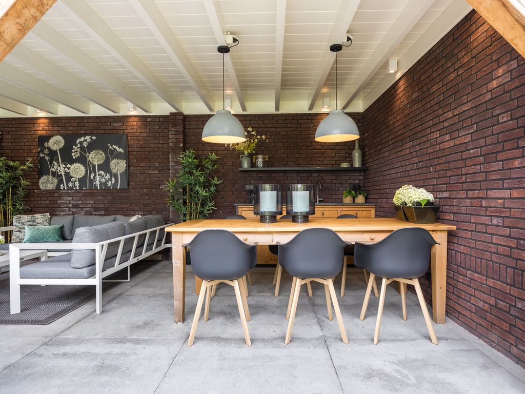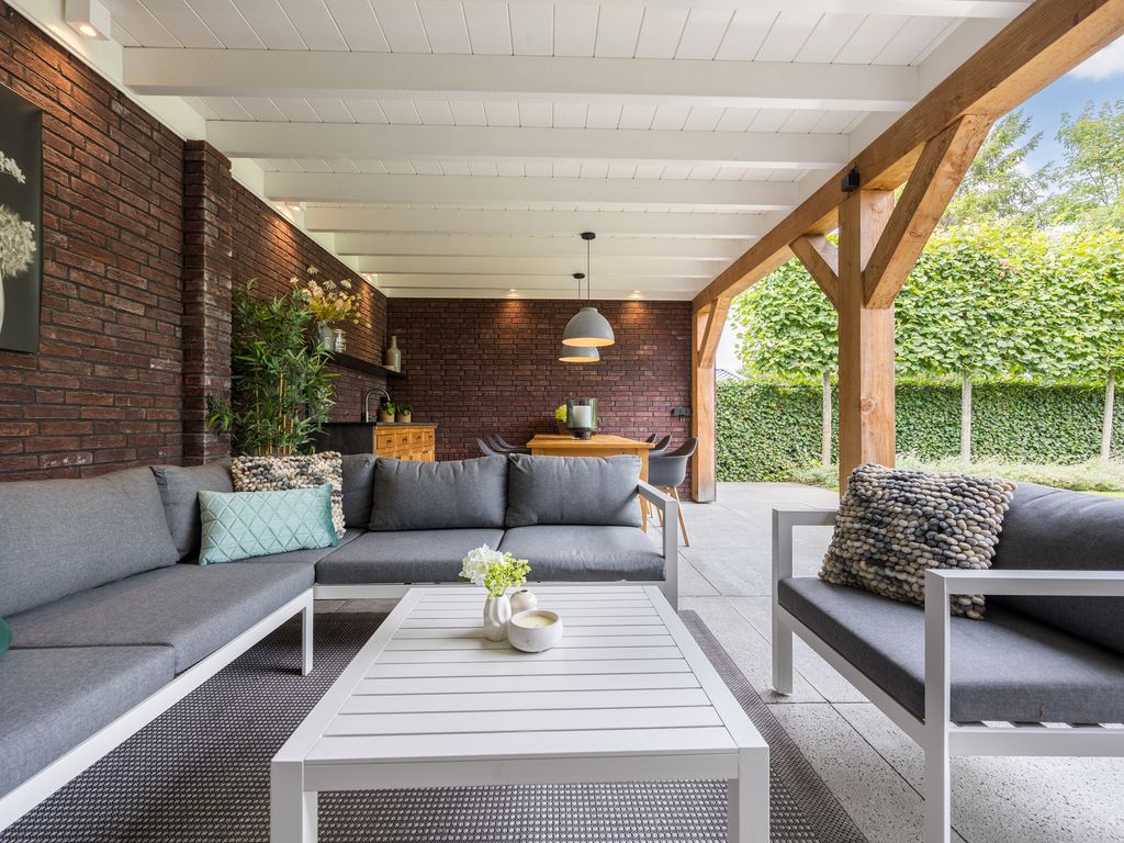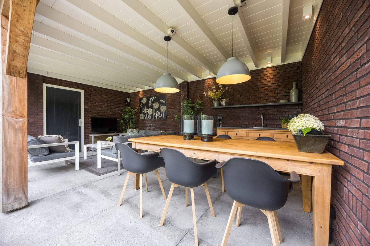 Aan de achterzijde bevindt zich een royale overkapping met een sfeervolle tuinkamer en buitenkeuken. Het dak van de overkapping is volledig geïsoleerd en is deze overkapping voorzien van alle aansluitingen, waaronder water, elektra en tv/internet.