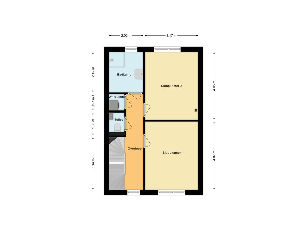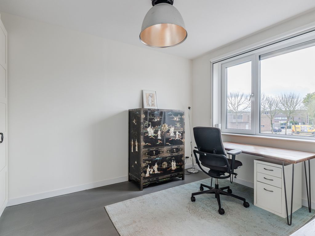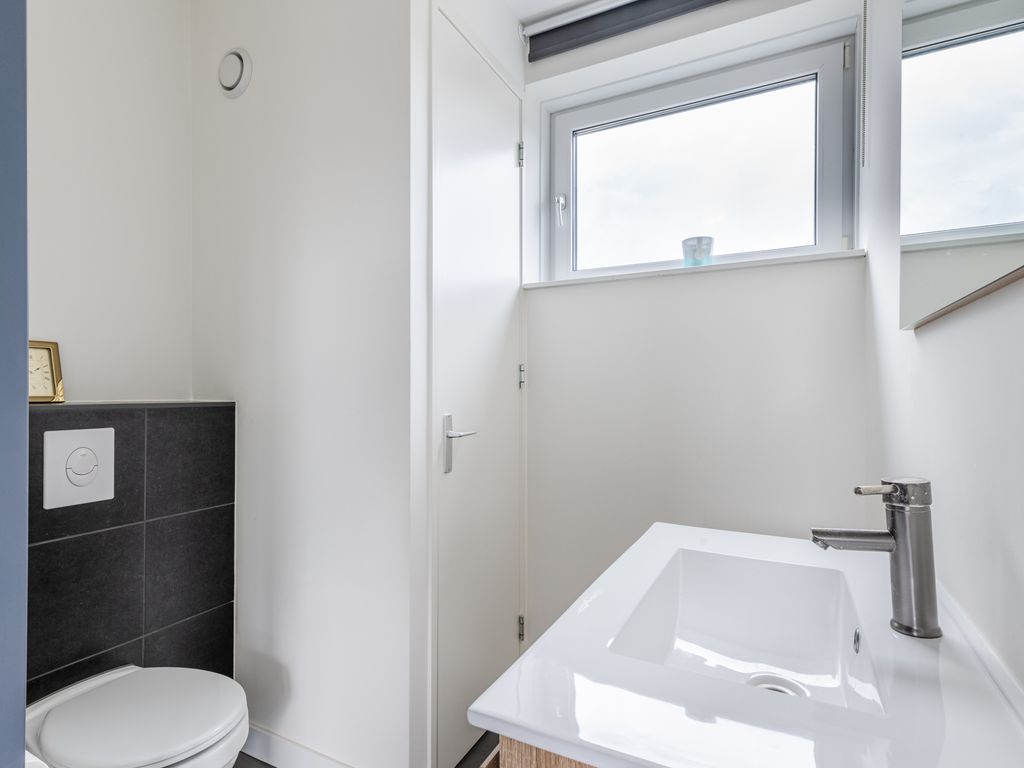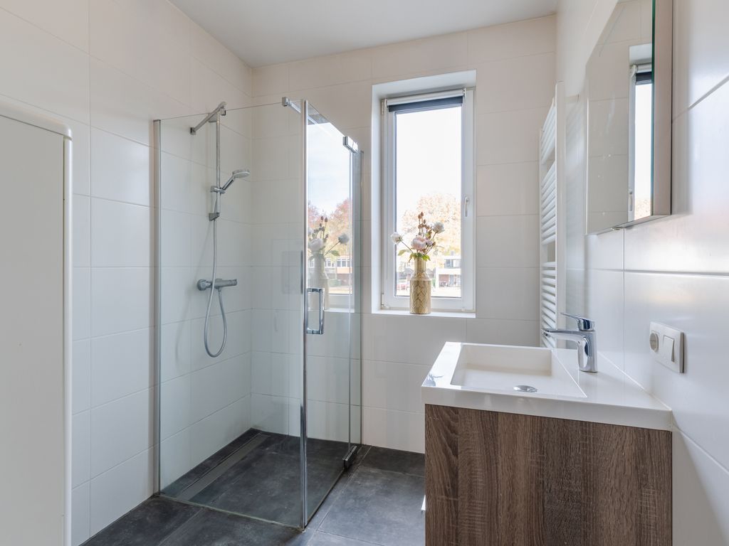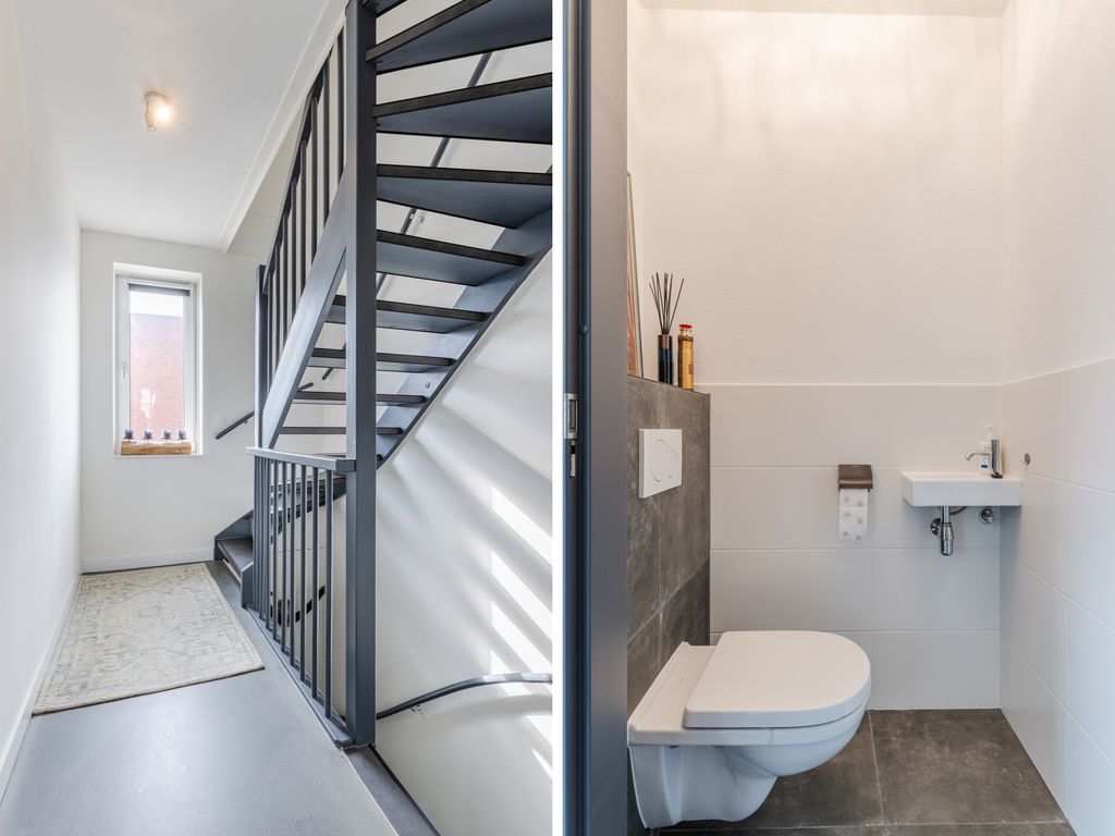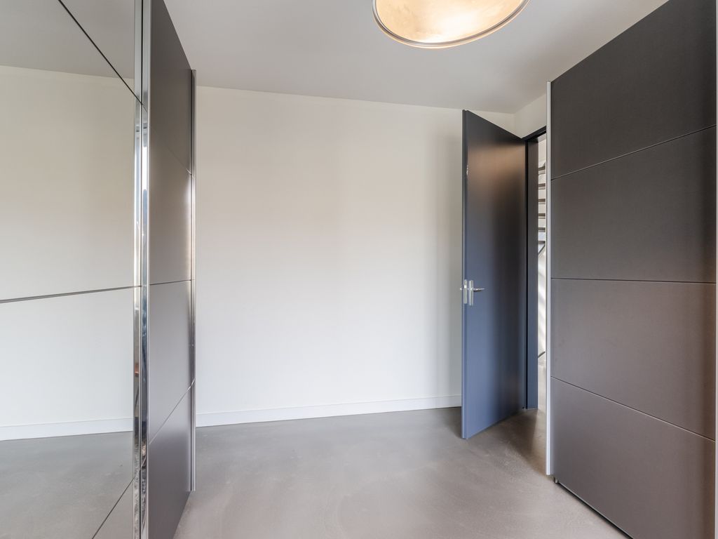Overloop met daglichttoetreding, vaste kast met opstelplaats voor wasapparatuur en separate toiletruimte met wandcloset en fonteintje. De moderne badkamer beschikt over een inloopdouche, wastafelmeubel, designradiator en een raam voor natuurlijke ventilatie. Op deze verdieping bevinden zich twee ruime slaapkamers, beide met vloerverwarming en strakke wand- en vloerafwerking.