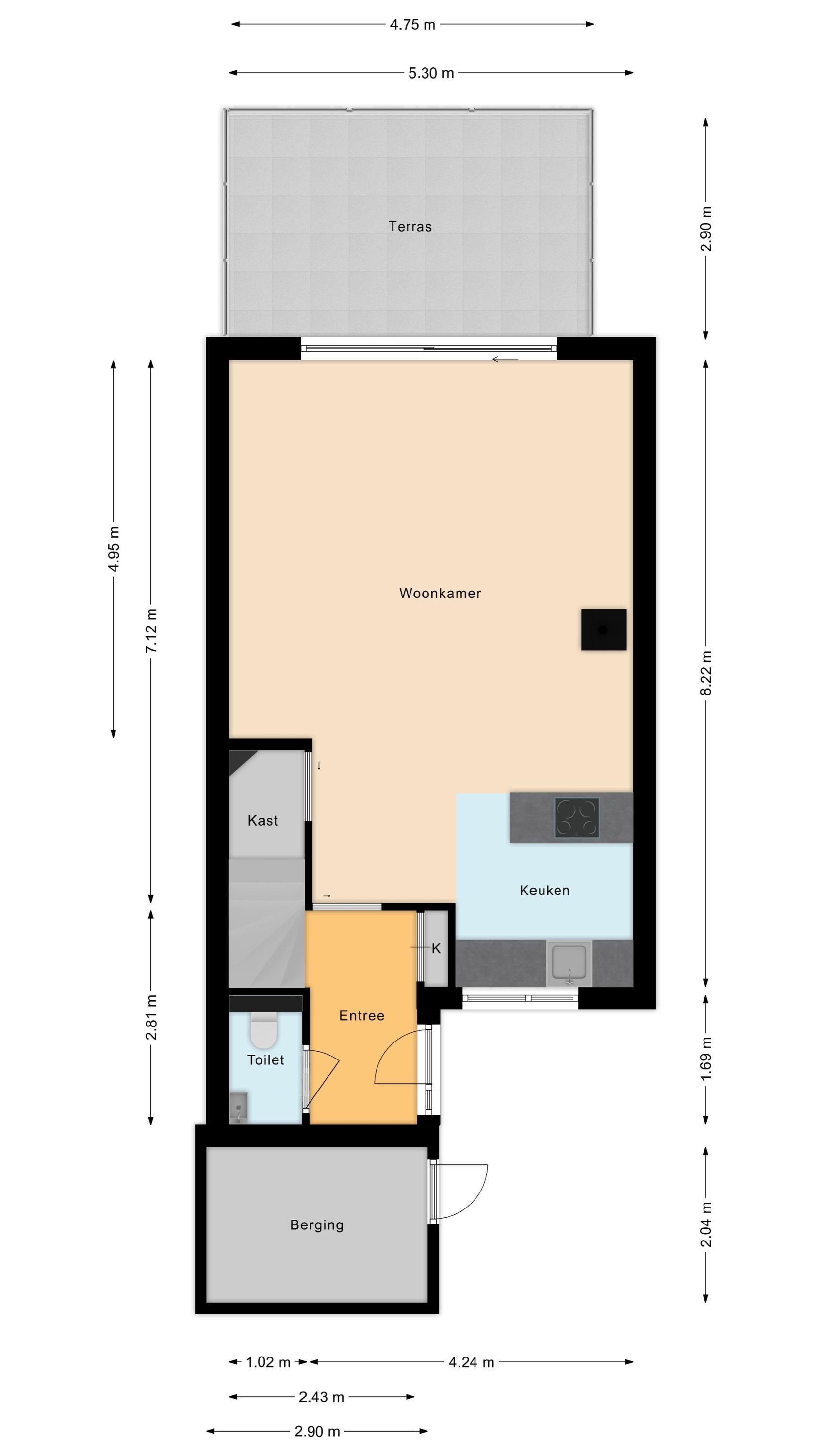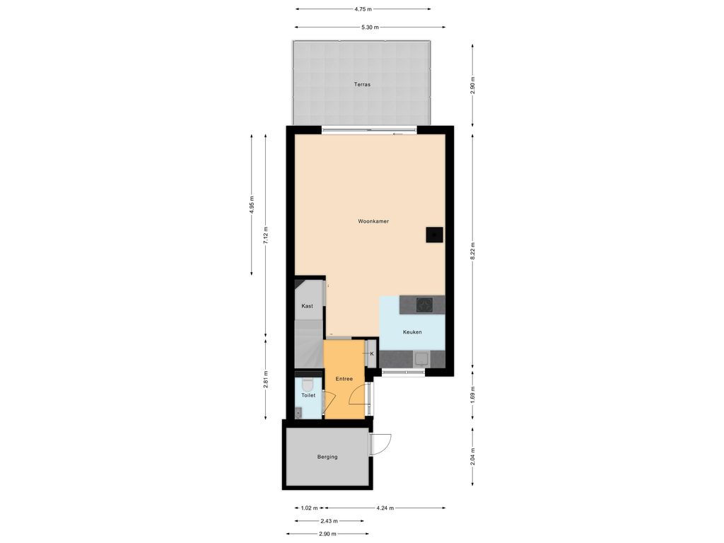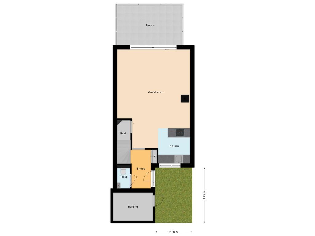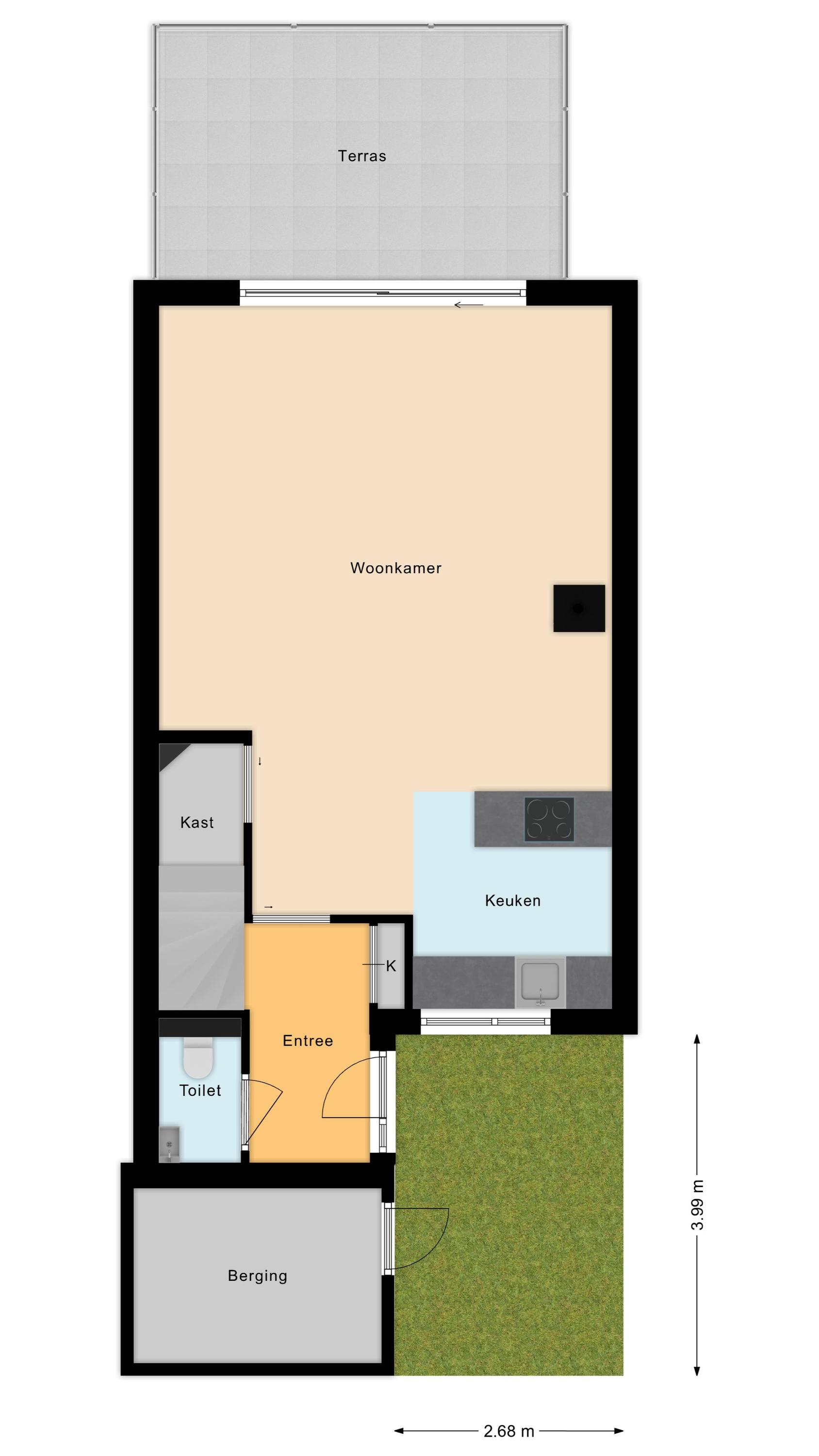 Aan de voorzijde bevindt zich de aangebouwde berging (voorzien van elektra) en de eigen parkeerplaats.