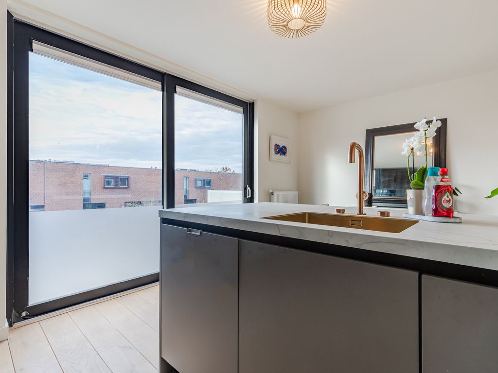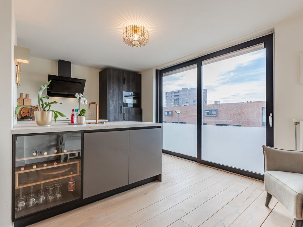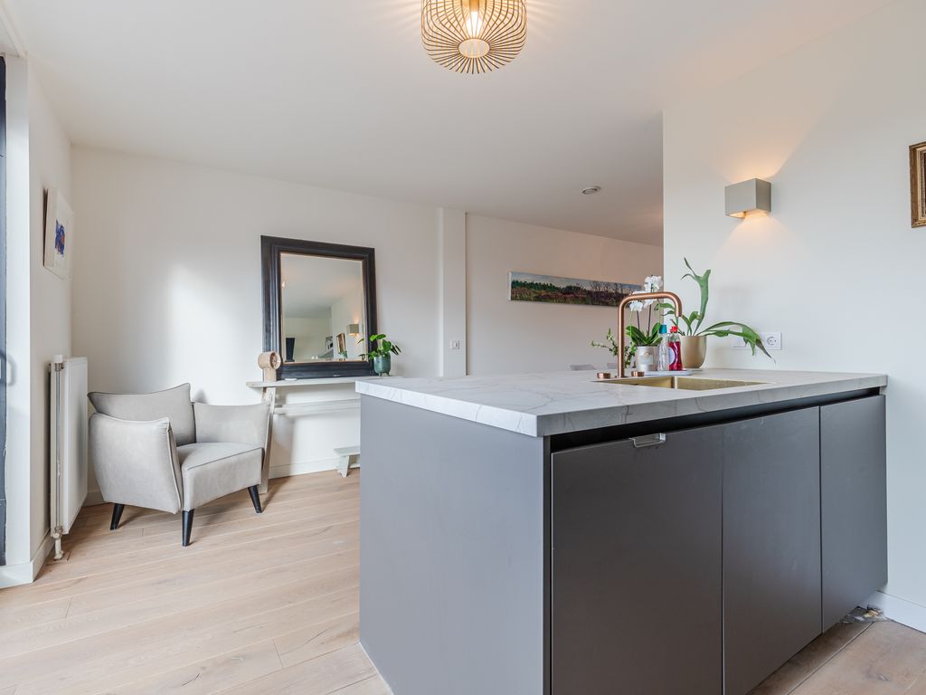 De leefverdieping is recent volledig en smaakvol verbouwd en biedt een royale woonkamer met veel lichtinval en een luxe leefkeuken aan de voorzijde.