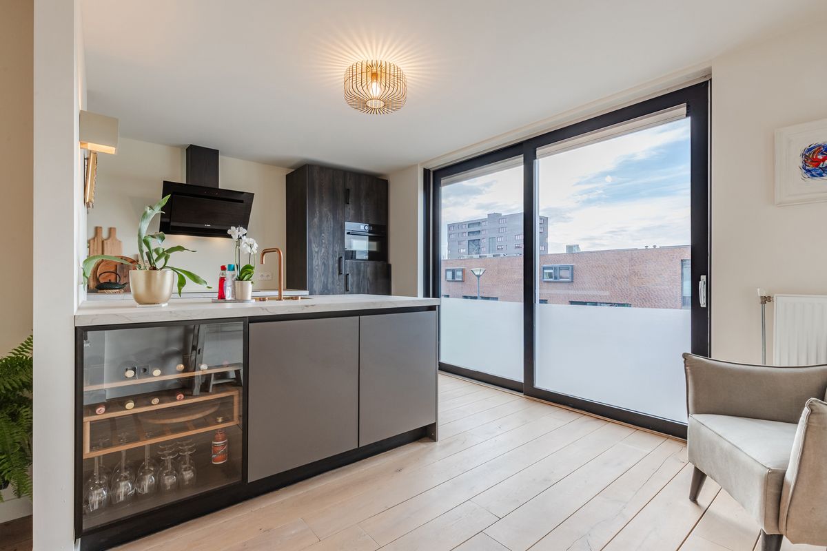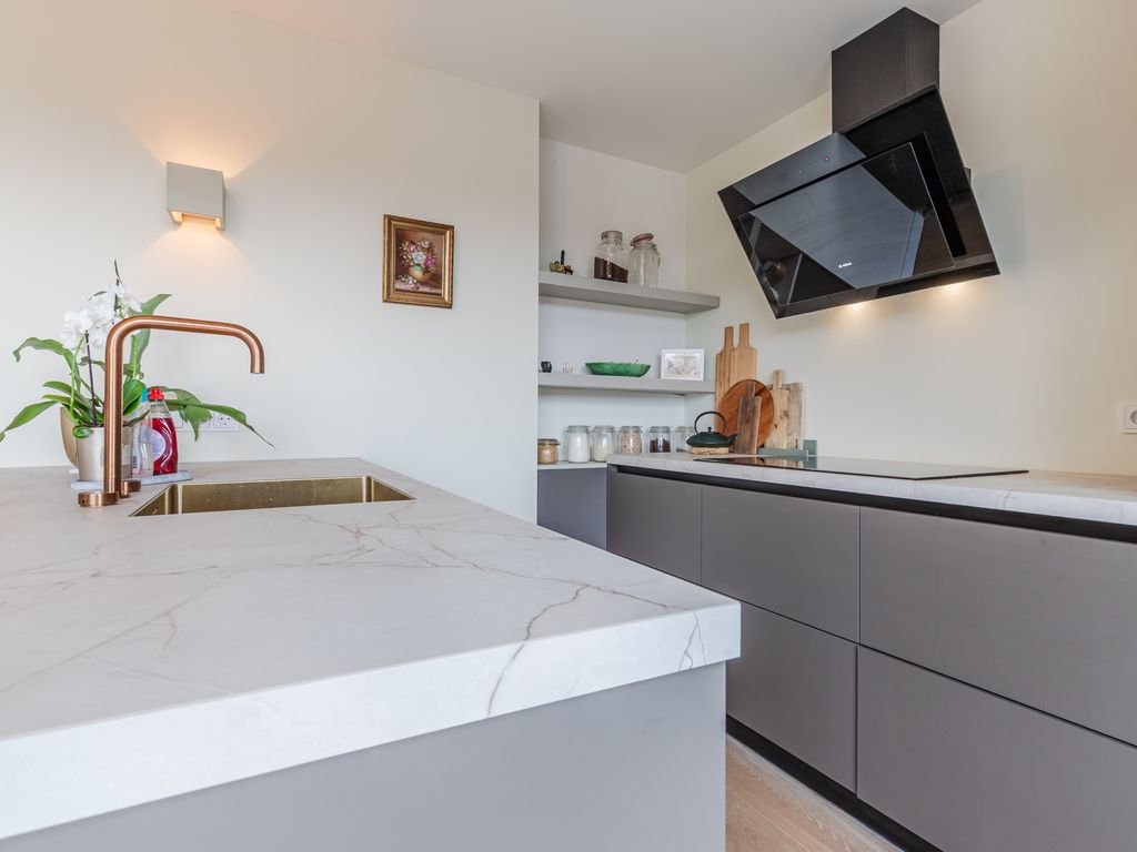 Aan de voorzijde een luxe leefkeuken (ca. 15 m²) met spoeleiland, gouden spoelbak, koperen designkraan, vaatwasser en wijnvakken; in de wandopstelling een 5-pits inductiekookplaat met afzuigkap, koelkast en oven, plus veel bergruimte in laden en kasten.