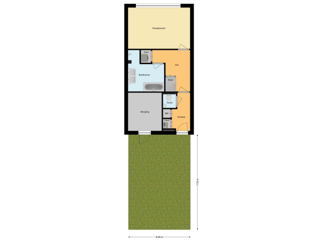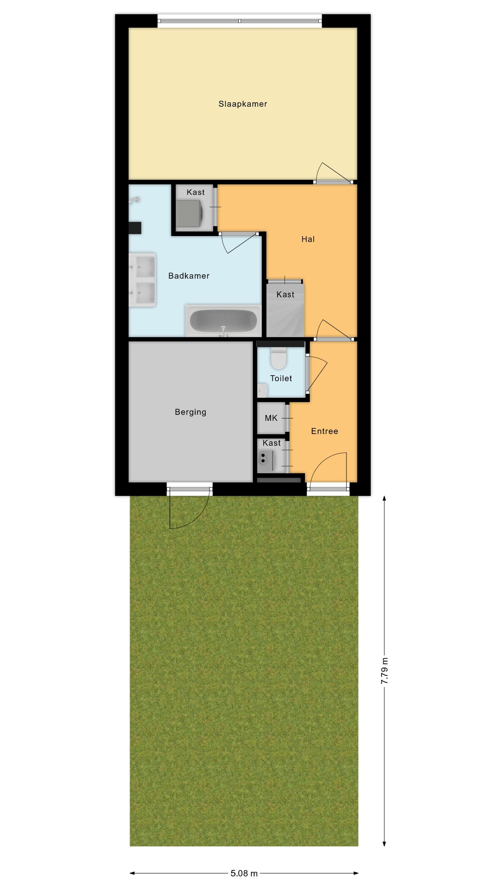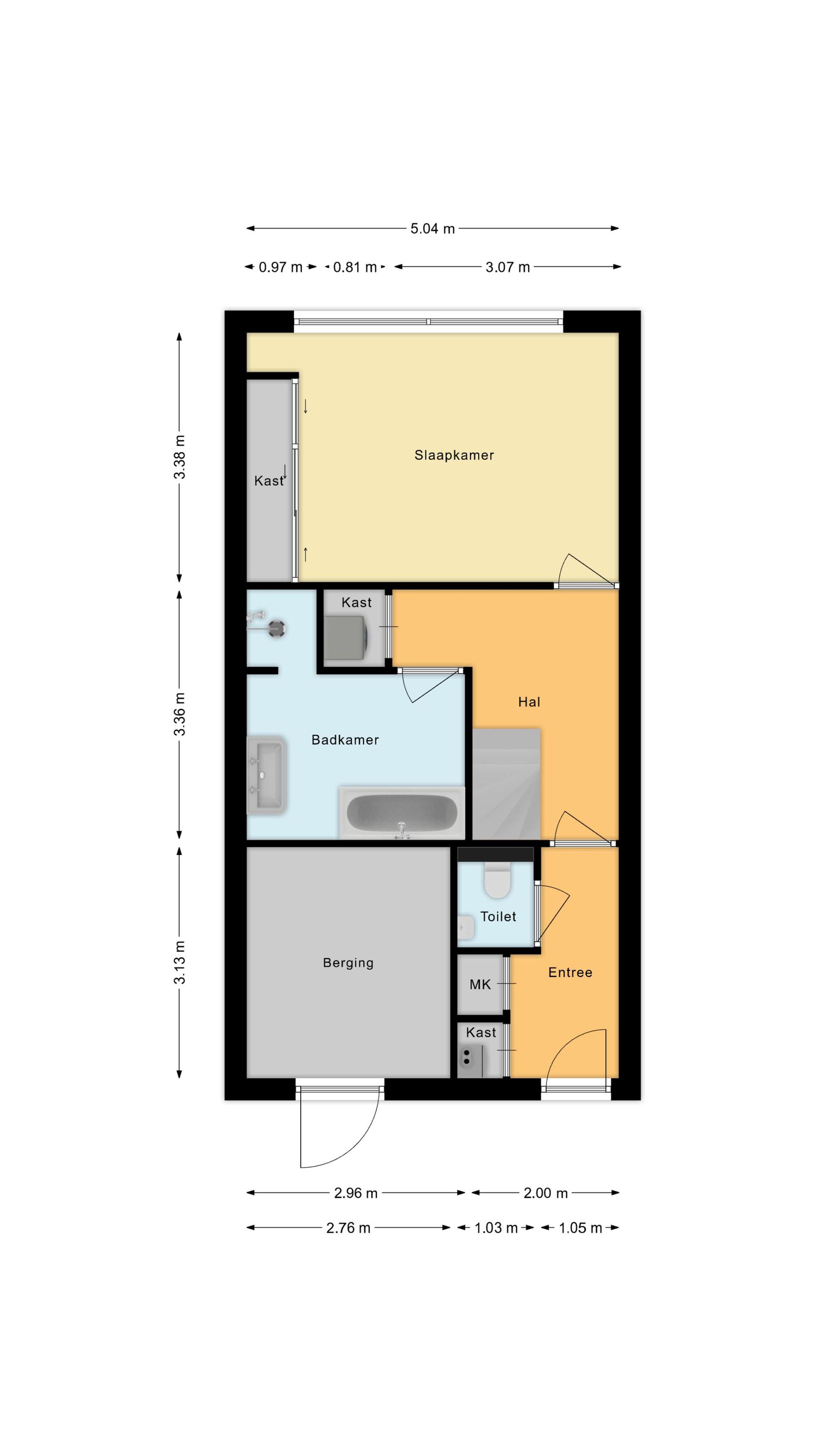 Entree/tochtportaal met meterkast; hal met toilet (wandcloset en fonteintje), bergkast met aansluitingen voor wasapparatuur en toegang tot badkamer en slaapkamer.