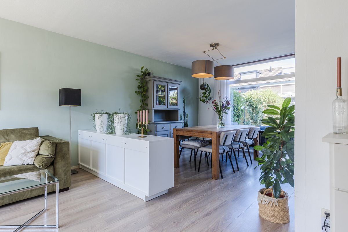 Lichte woonkamer met zitgedeelte aan de voorzijde en open keuken aan de tuinzijde.