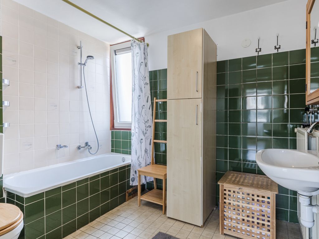 De badkamer is royaal van formaat en uitgerust met een ligbad met douchecombinatie, wastafel, toilet en radiator. Het aanwezige draai-/kiepraam zorgt voor daglicht en natuurlijke ventilatie. Hoewel de ruimte gedateerd oogt, is zij netjes onderhouden en direct te gebruiken. Met een nieuwe tegelafwerking krijgt de badkamer eenvoudig een frisse, moderne uitstraling.