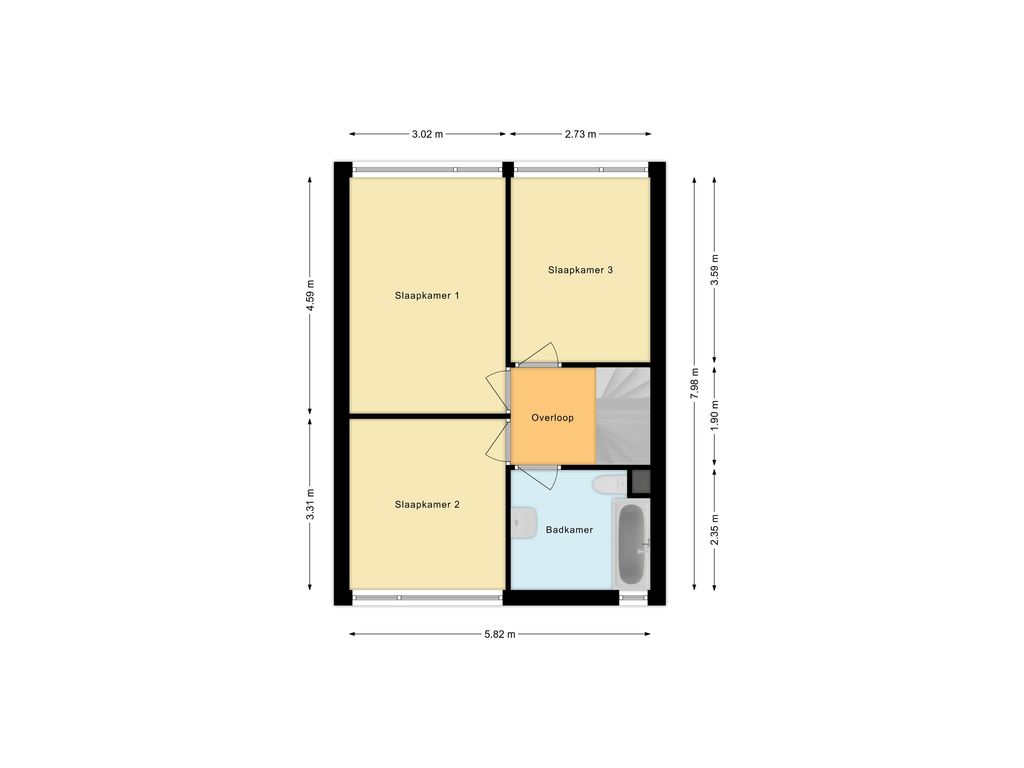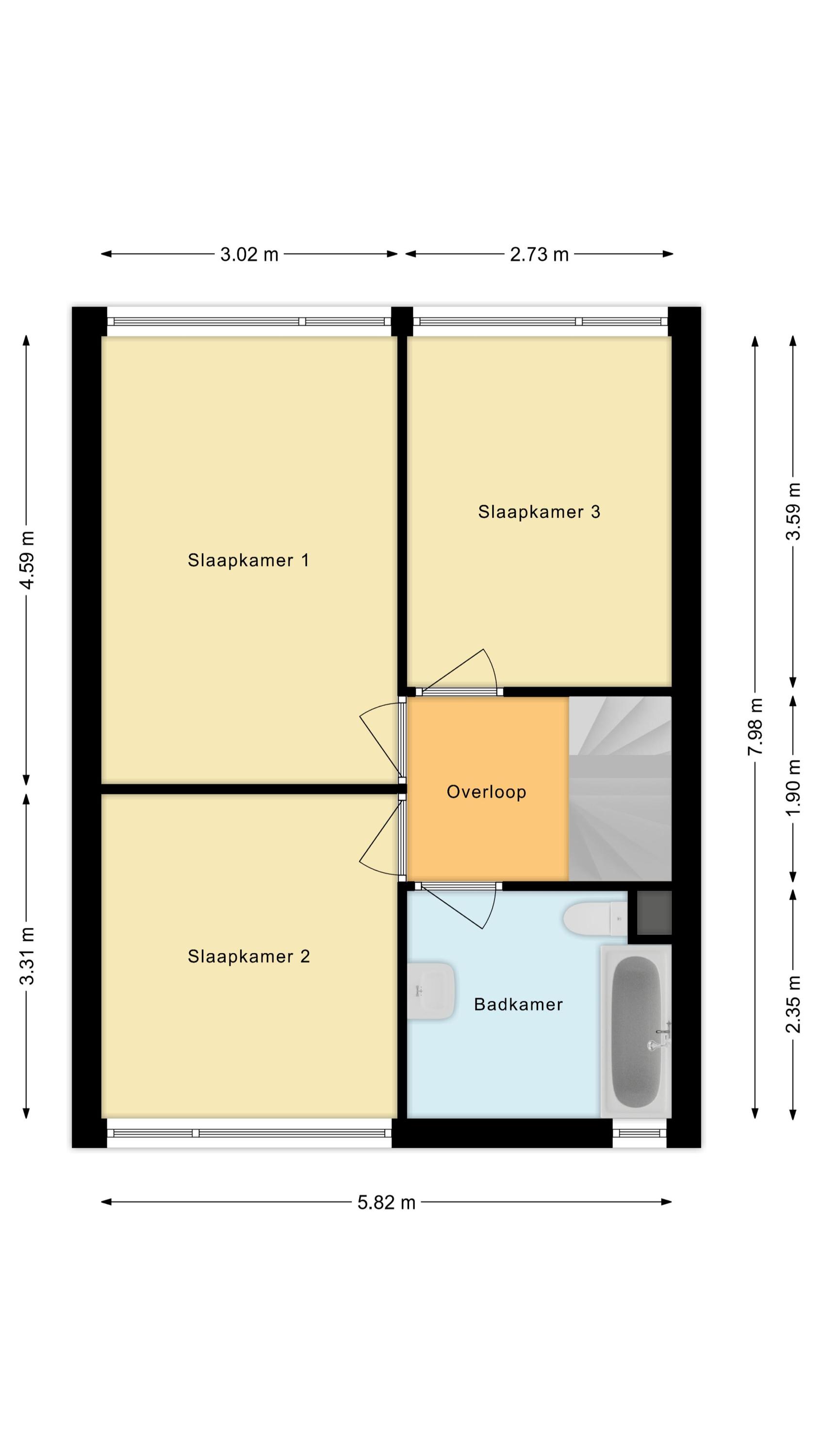 Overloop met toegang tot drie slaapkamers.