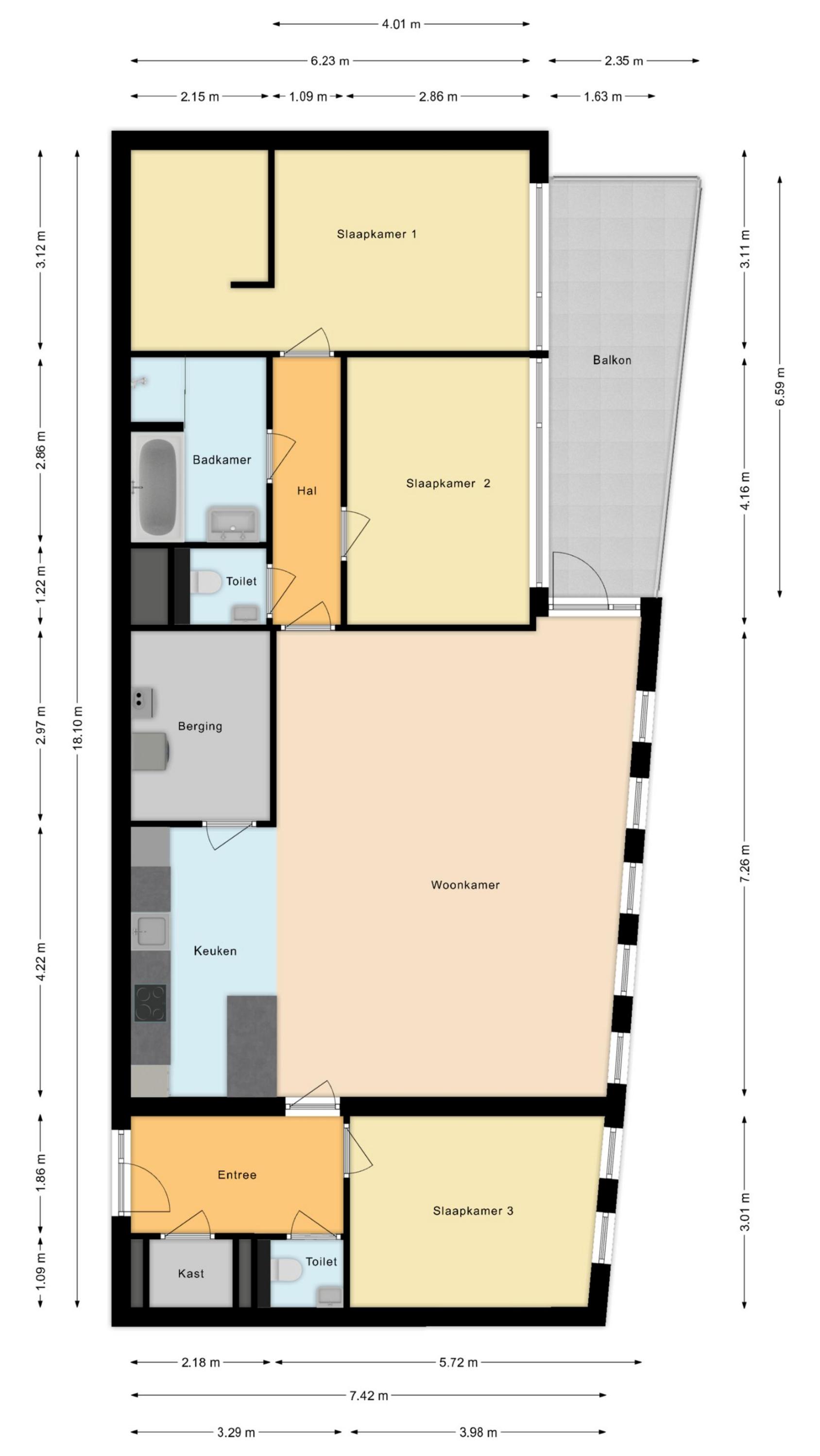 • Ruime woonkamer: De woonkamer is een oase van licht door de grote raampartijen. Hier komt u via de hal die toegang biedt tot de keuken, berging/bijkeuken en het balkon.