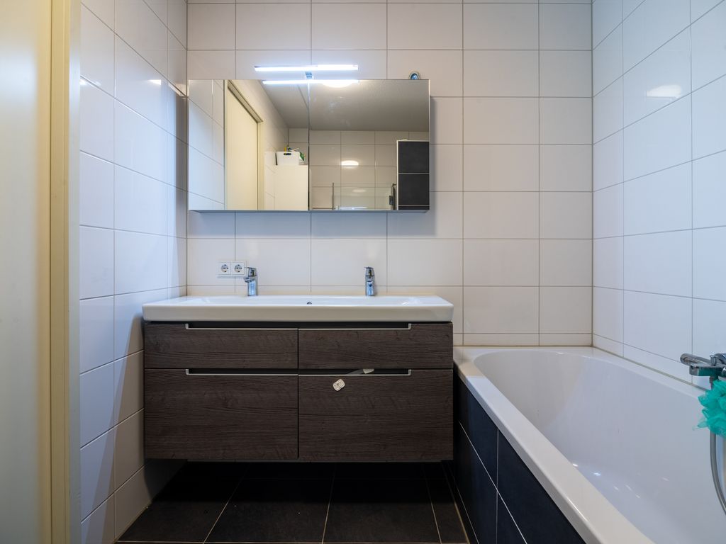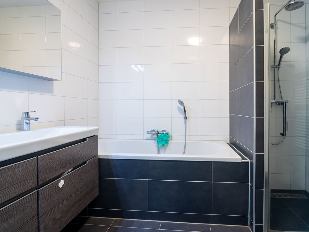 • Luxe badkamer: De moderne badkamer is voorzien van een douche, ligbad en dubbele wastafel met meubel.