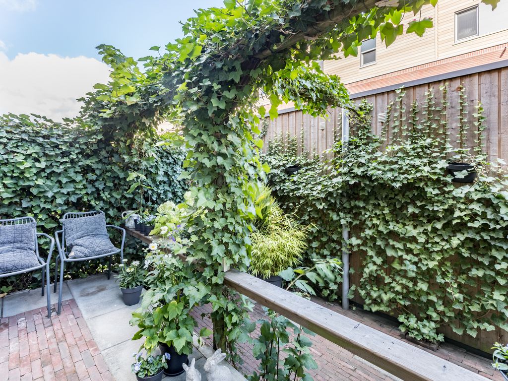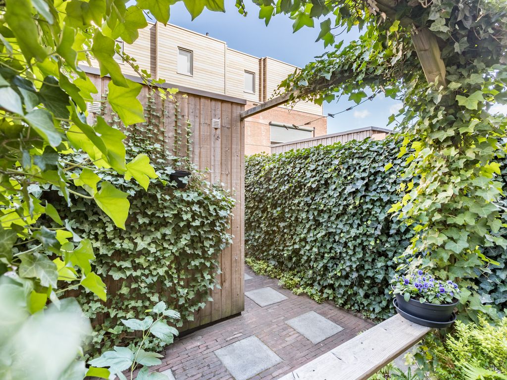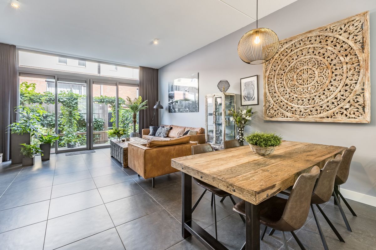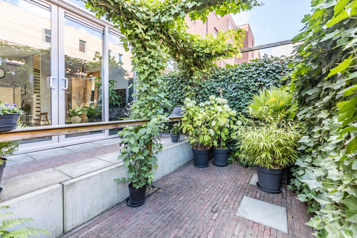 Via een dubbele schuifpui staat de living in verbinding met de zonnige stadstuin: een rustige en groene plek in de stad, voorzien van niveauverschil, sierbestrating, pergola en achterom.