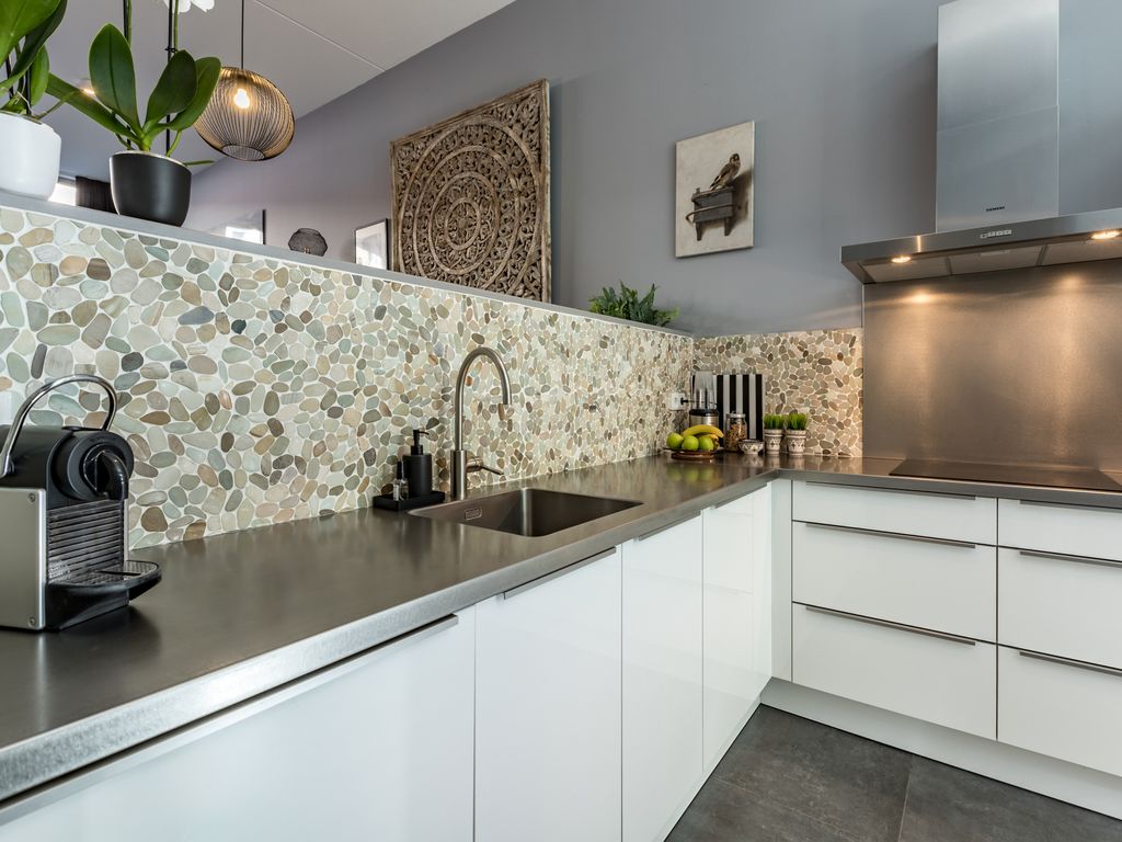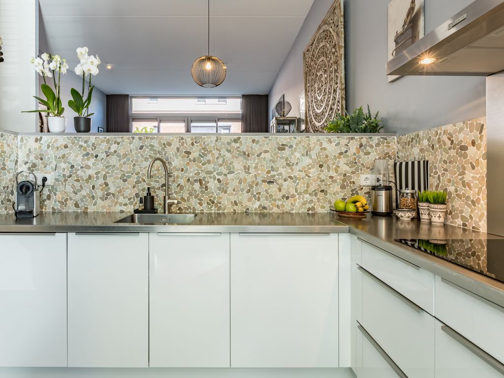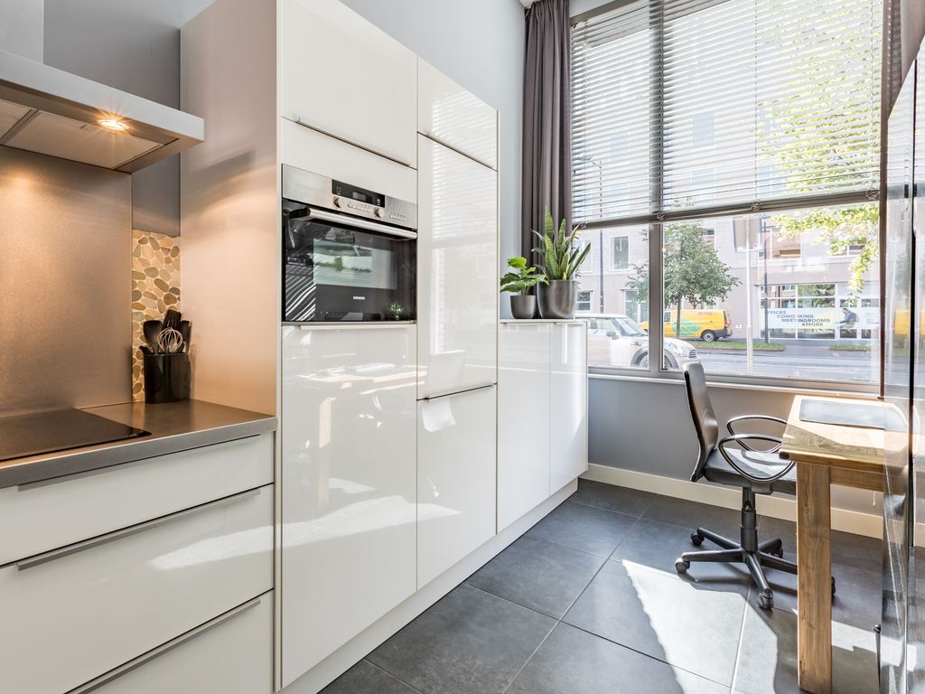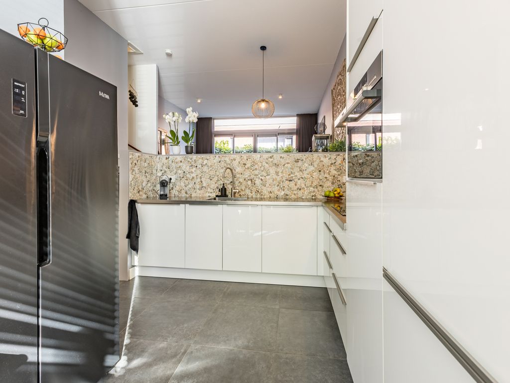 Aan de voorzijde ligt de ruime leefkeuken (ca. 13 m²) met een L-vormige hoogglans witte keukenopstelling en Siemens inbouwapparatuur: inductiekookplaat, afzuigkap, combimagnetron, koelkast en vaatwasser. Het werkblad is verhoogd uitgevoerd en voorzien van RVS. Dankzij de hoge raampartijen is hier veel lichtinval.