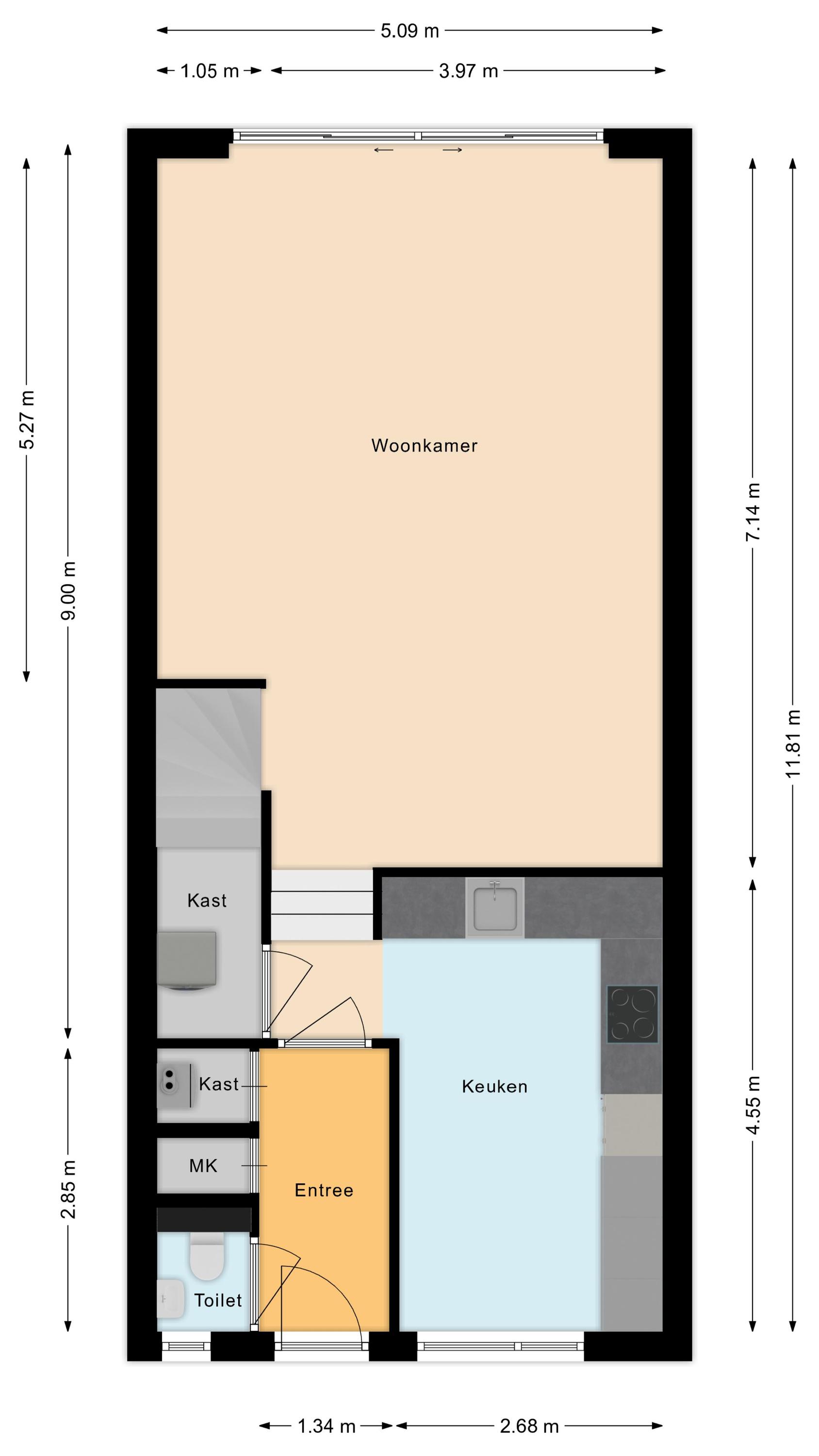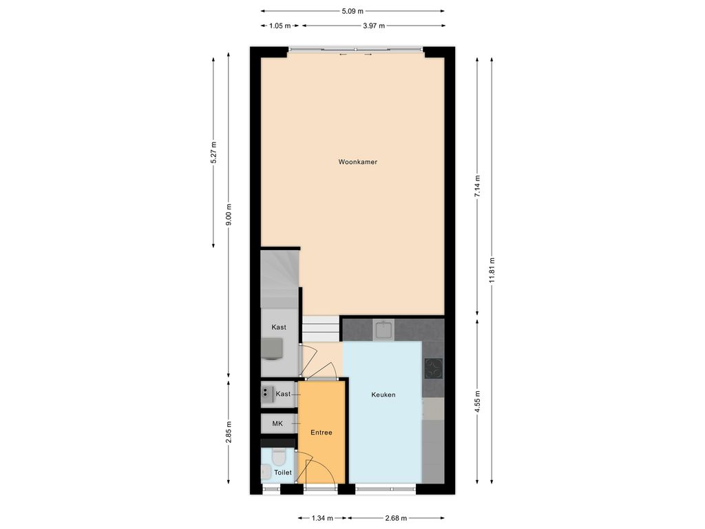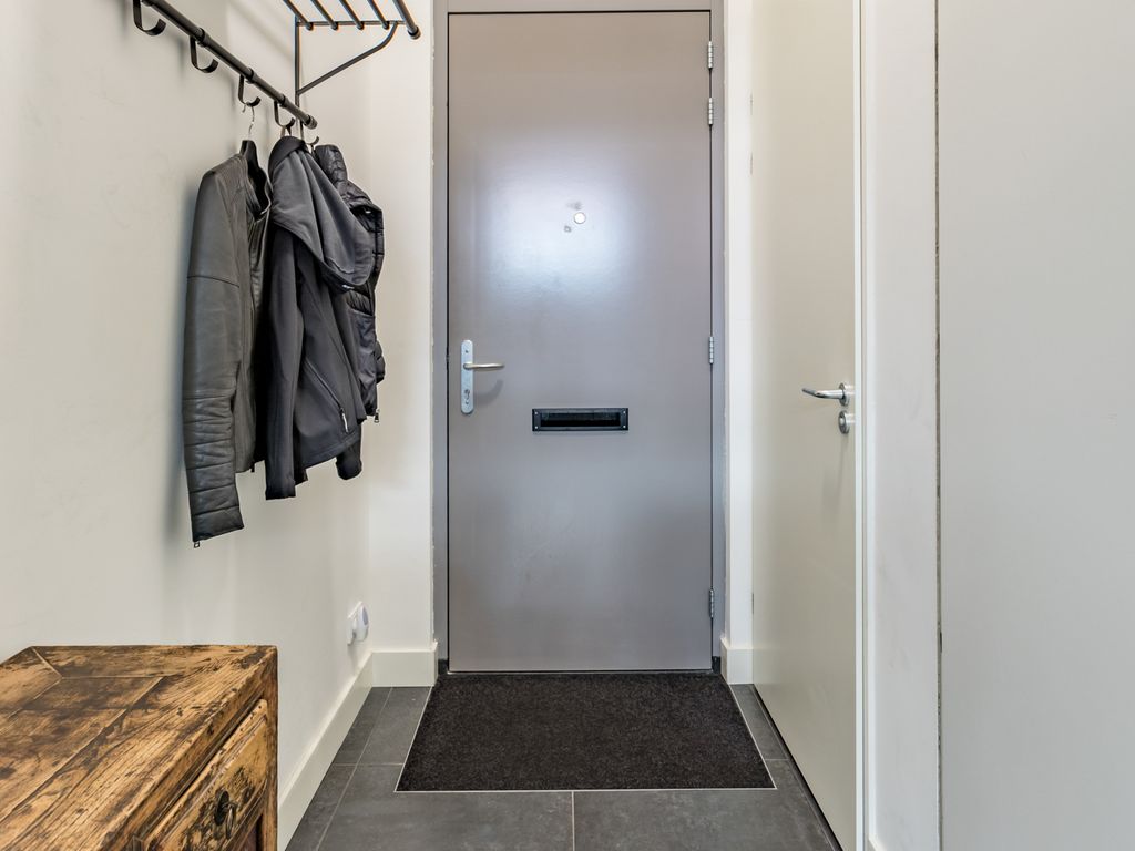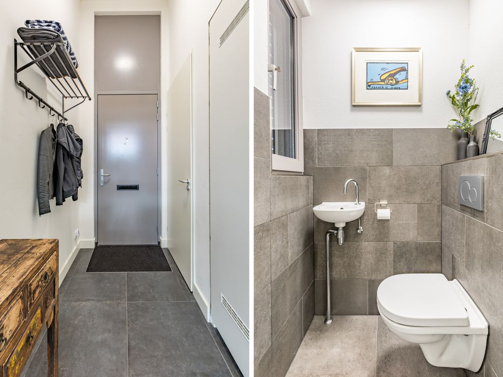 Entree met hoog plafond (3,75 m), toiletruimte met wandcloset en fonteintje, vaste kast met opstelling van de cv-ketel, vloerverwarming en ventilatie-unit.