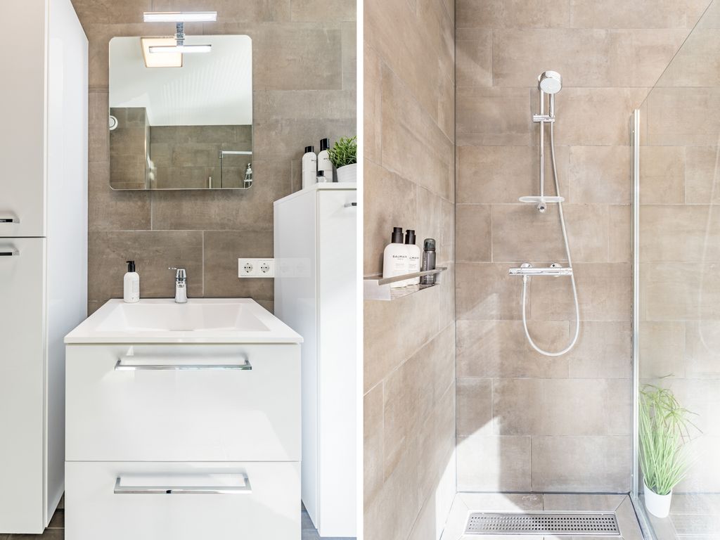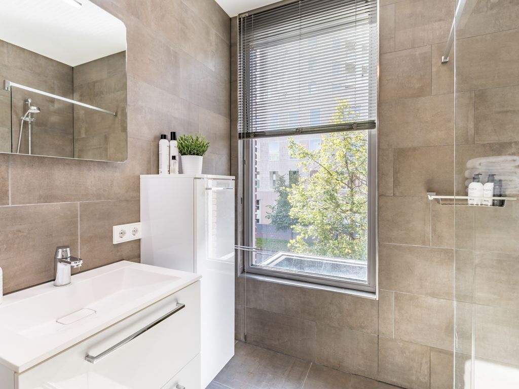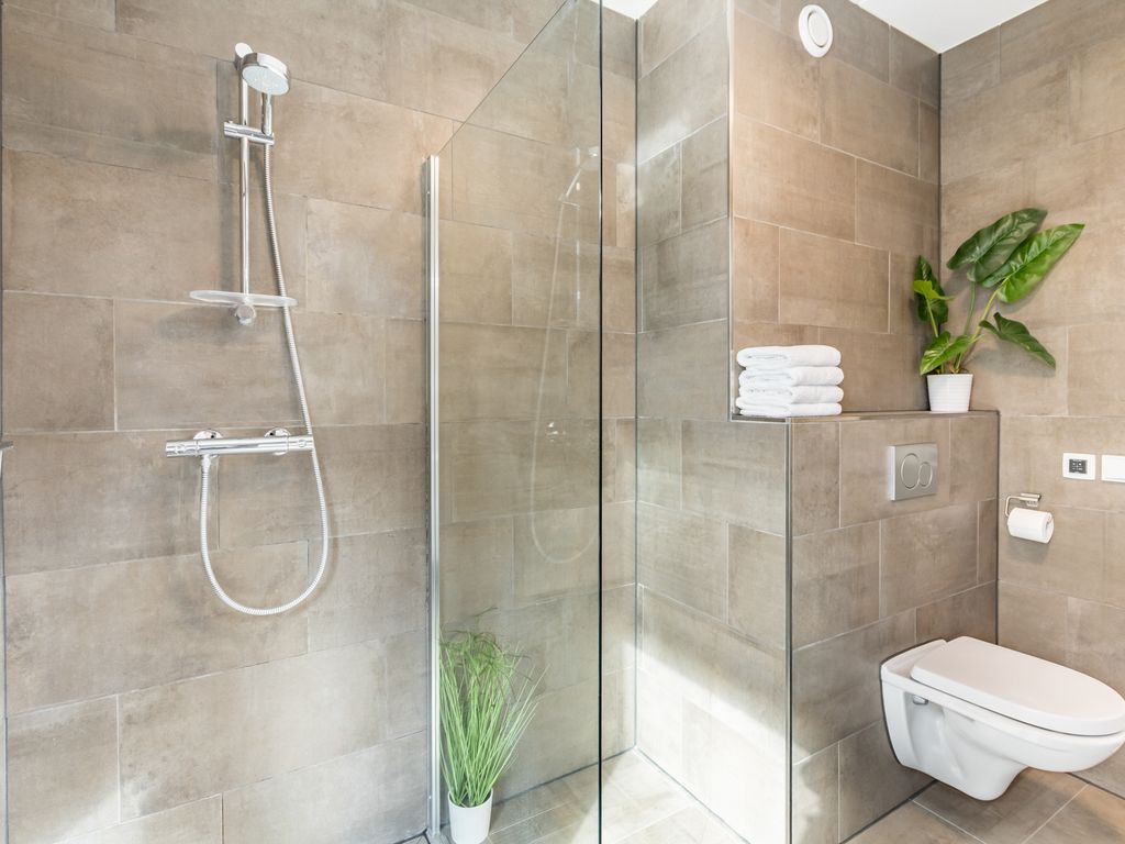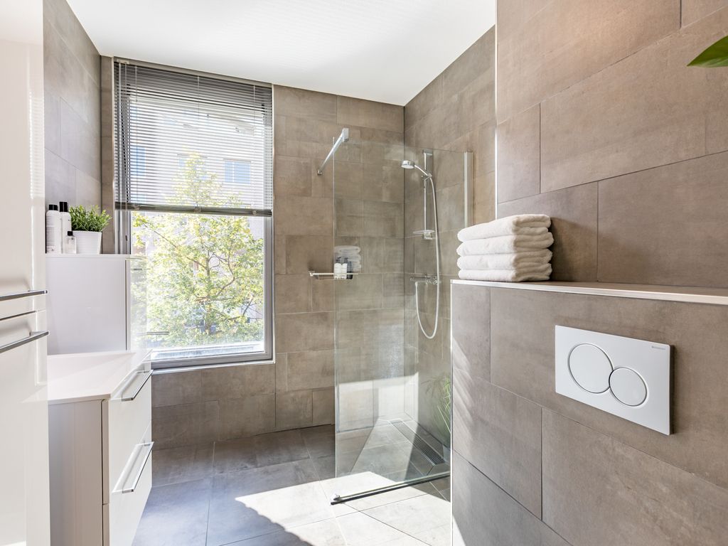 De badkamer is modern afgewerkt met inloopdouche, wastafelmeubel met bijpassende wandkasten, tweede toilet, vloerverwarming en designradiator.