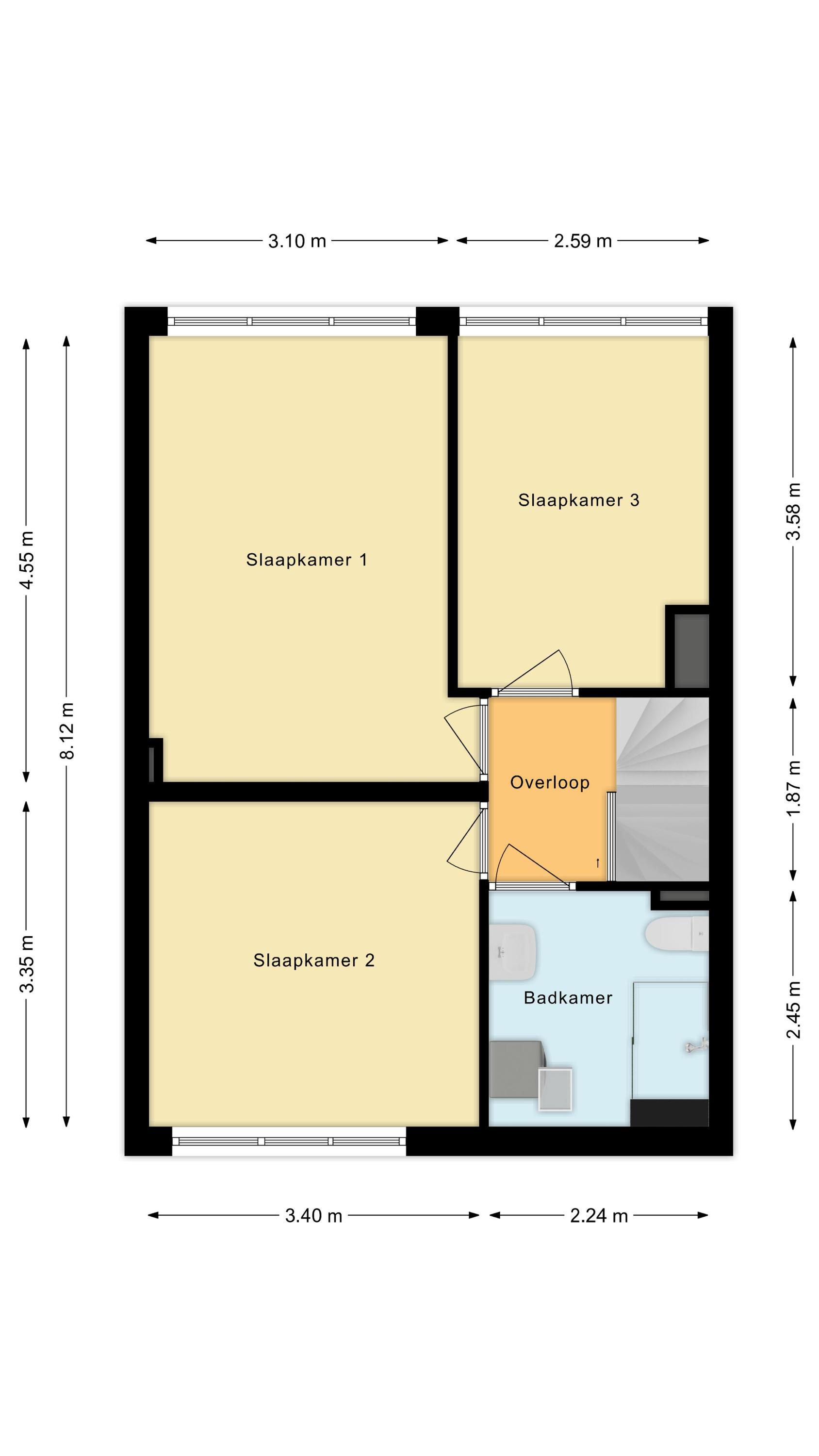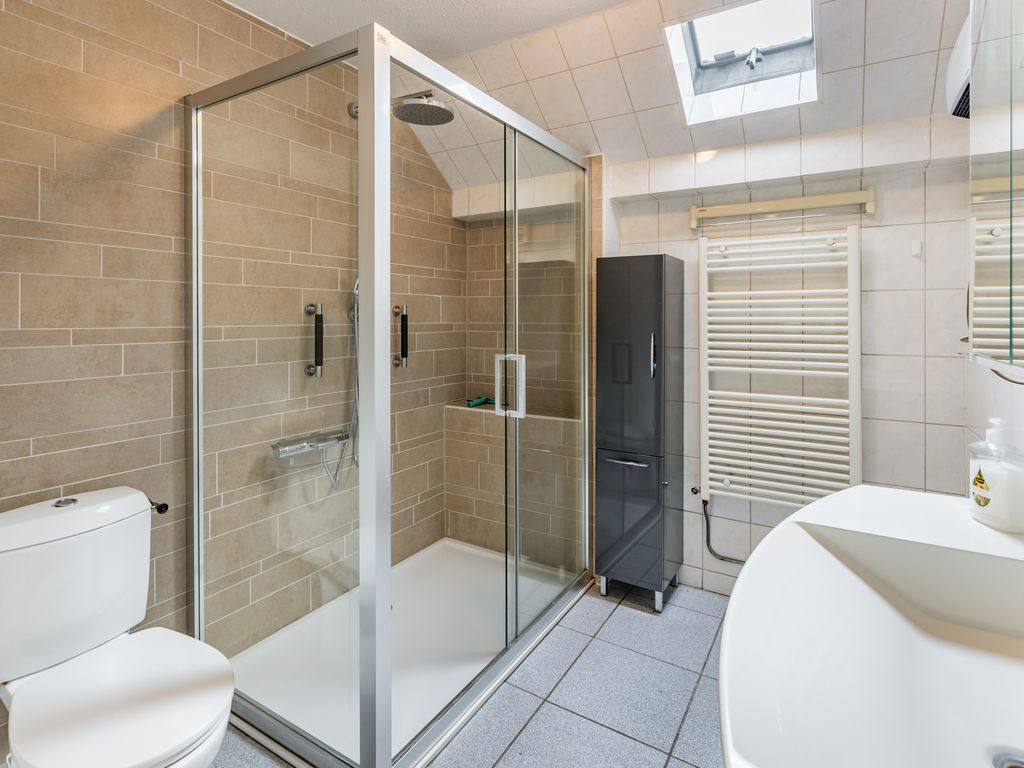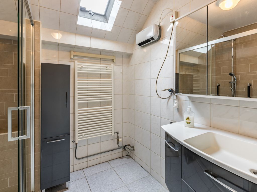 Overloop; drie ruime slaapkamers; badkamer met inloopdouche, tweede toilet, wastafelmeubel, wasmachineaansluiting, designradiator en uitzetraam.