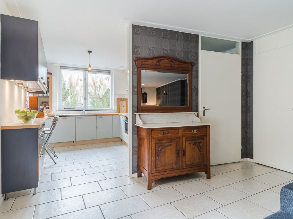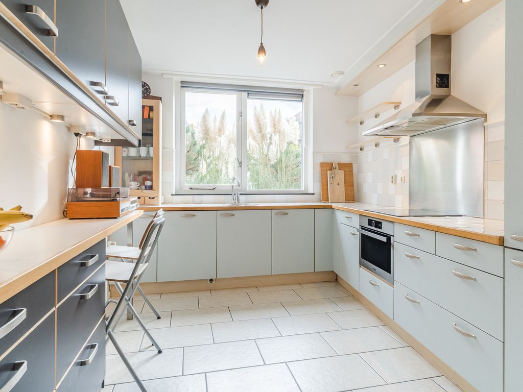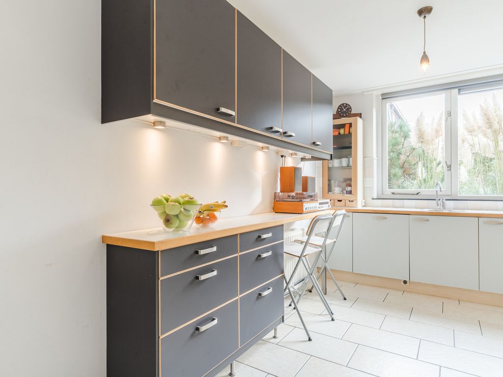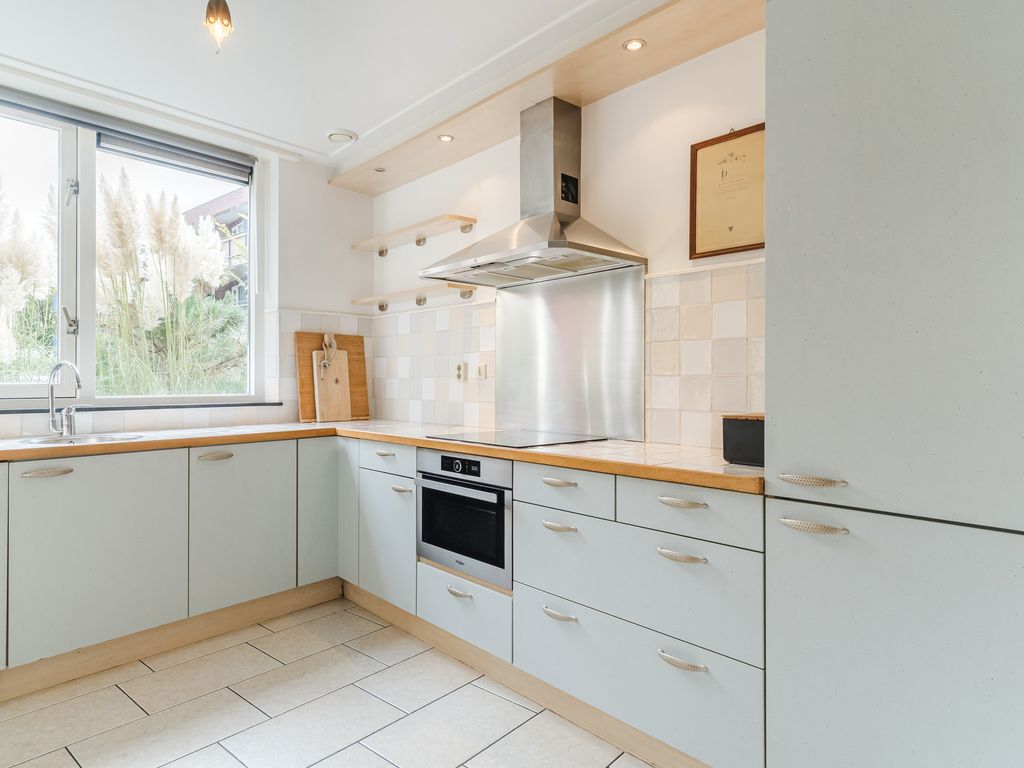 Aan de voorzijde ligt de open keuken van ca. 10 m² met een nette L-vormige inbouwkeuken, uitgerust met een keramische kookplaat, afzuigkap, combimagnetron, vaatwasser en koel-vriescombinatie (2025).
