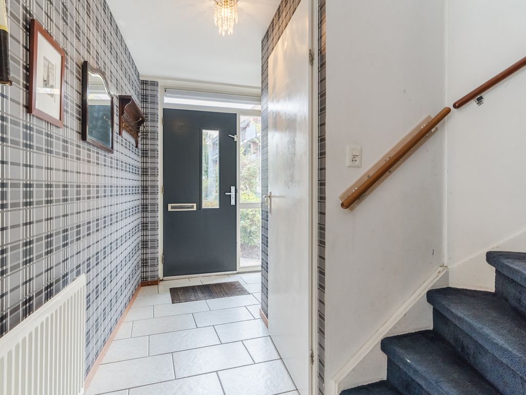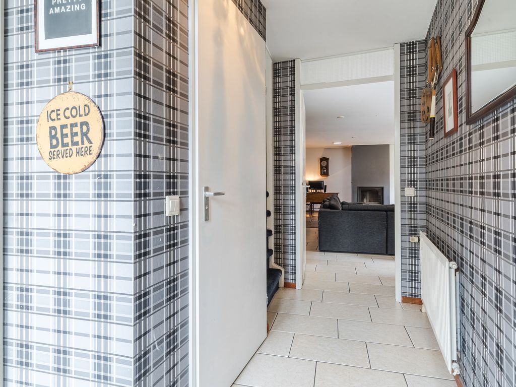Hal/entree met meterkast, toiletruimte, trapopgang en het doorstroomapparaat. Vanuit de hal toegang tot de uitgebouwde woonkamer van ca. 50 m². Deze lichte ruimte is voorzien van een solartube, een strakke schouw met Barbas VHR inbouwhaard, praktische bergkast en vier openslaande deuren naar de tuin.