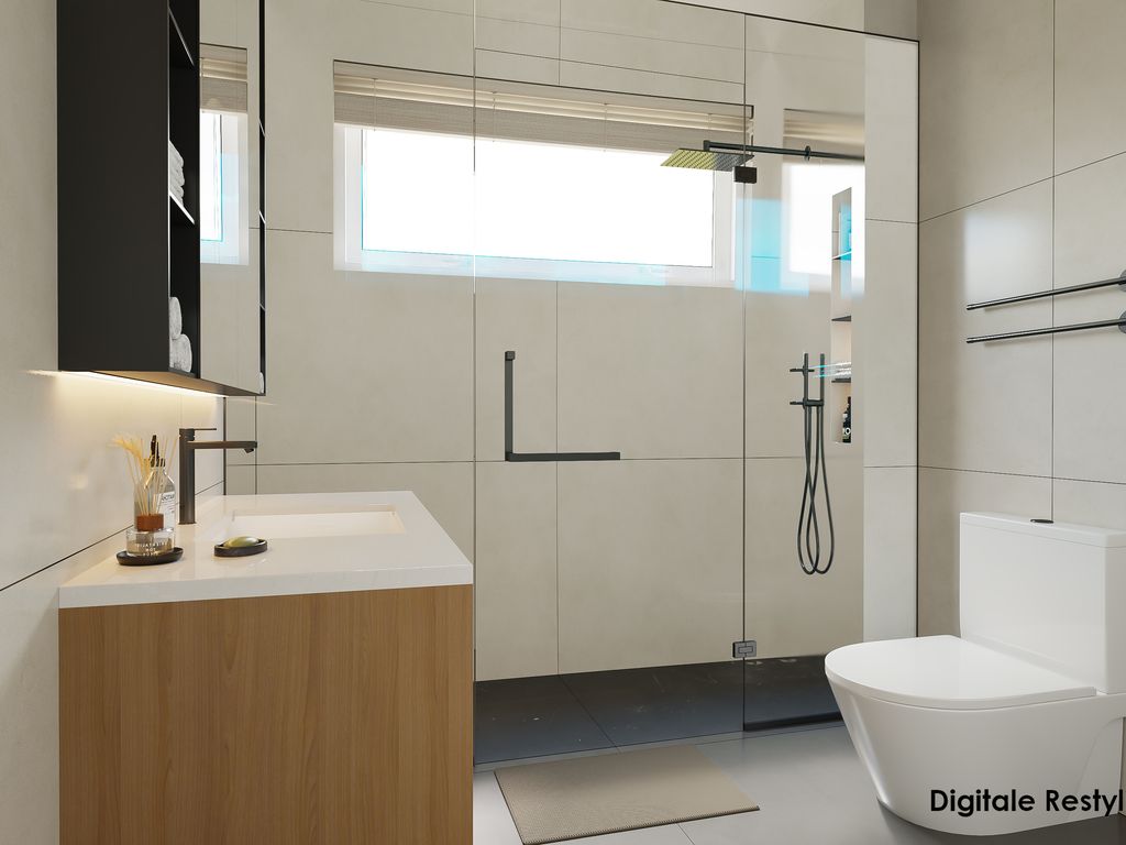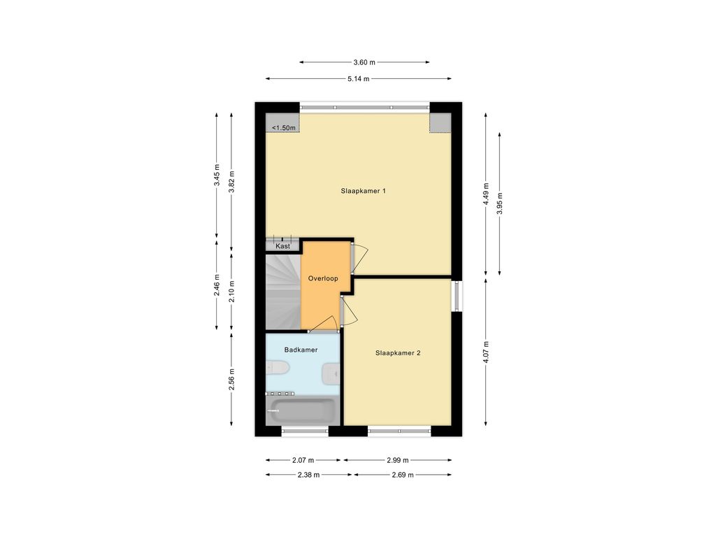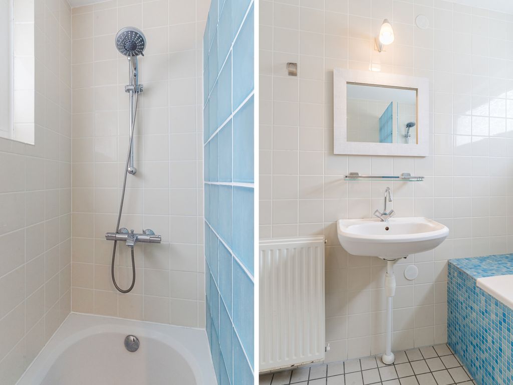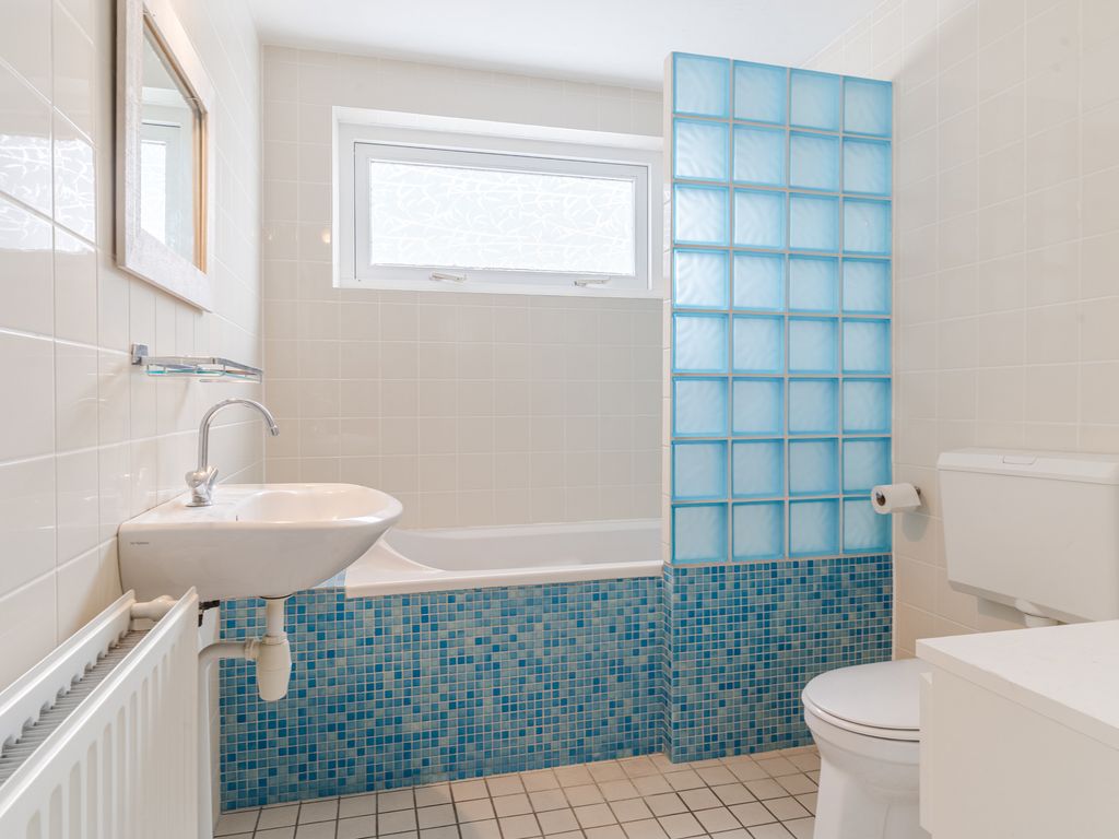 De badkamer (ca. 2,07 x 2,55 m) is uitgerust met een ligbad/douche, een tweede toilet, een wastafel en een raam voor extra ventilatie.